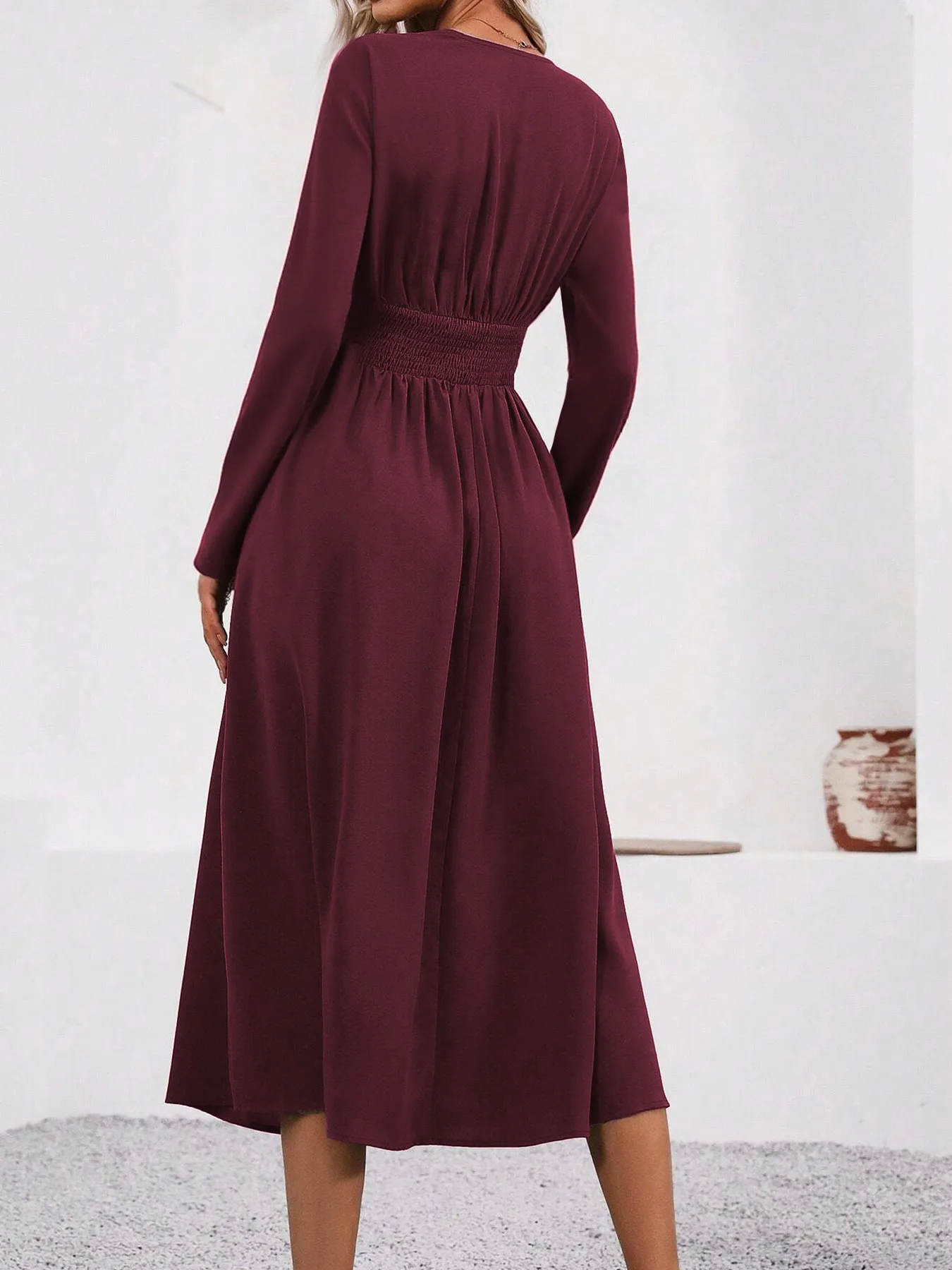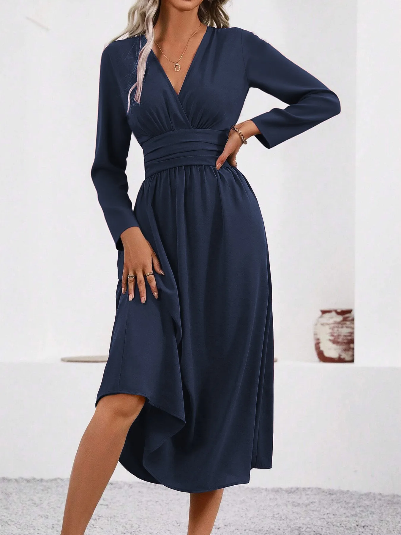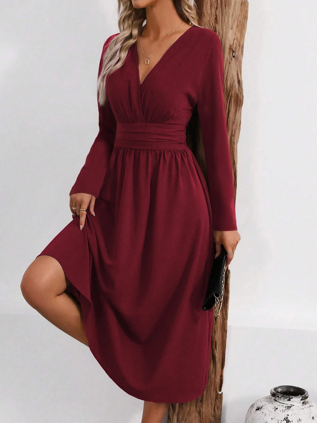 Elegante abito in maglia tinta unita da donna 2025 Autunno Inverno sovrapposto scollo a V manica lunga con abito lungo aderente arricciato in vita