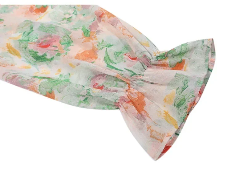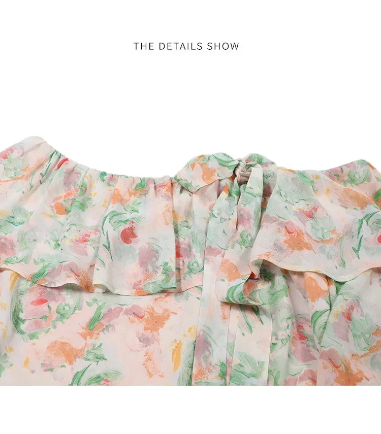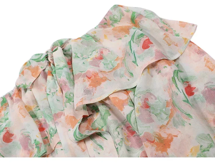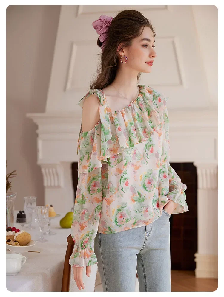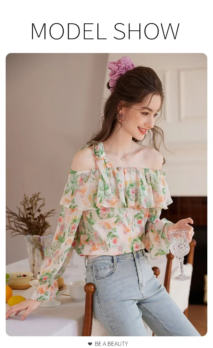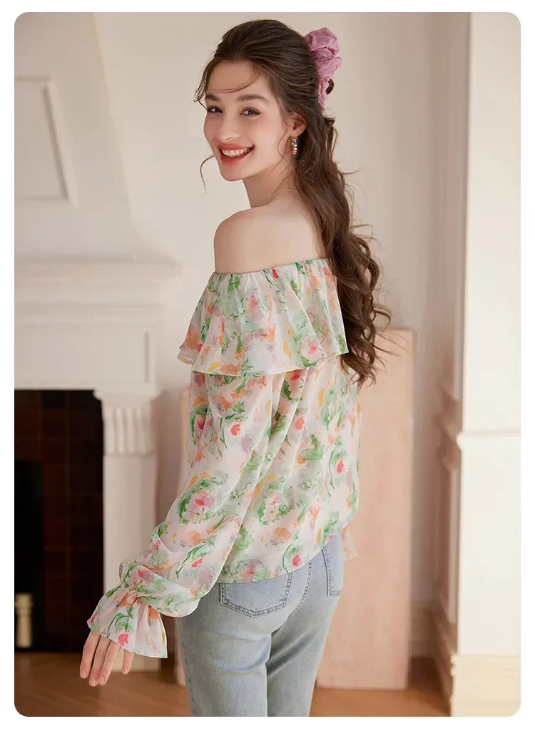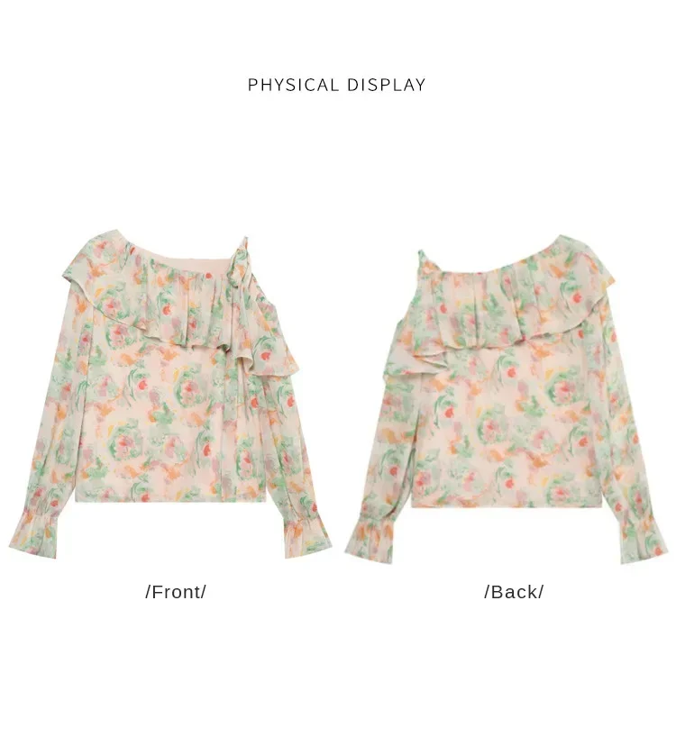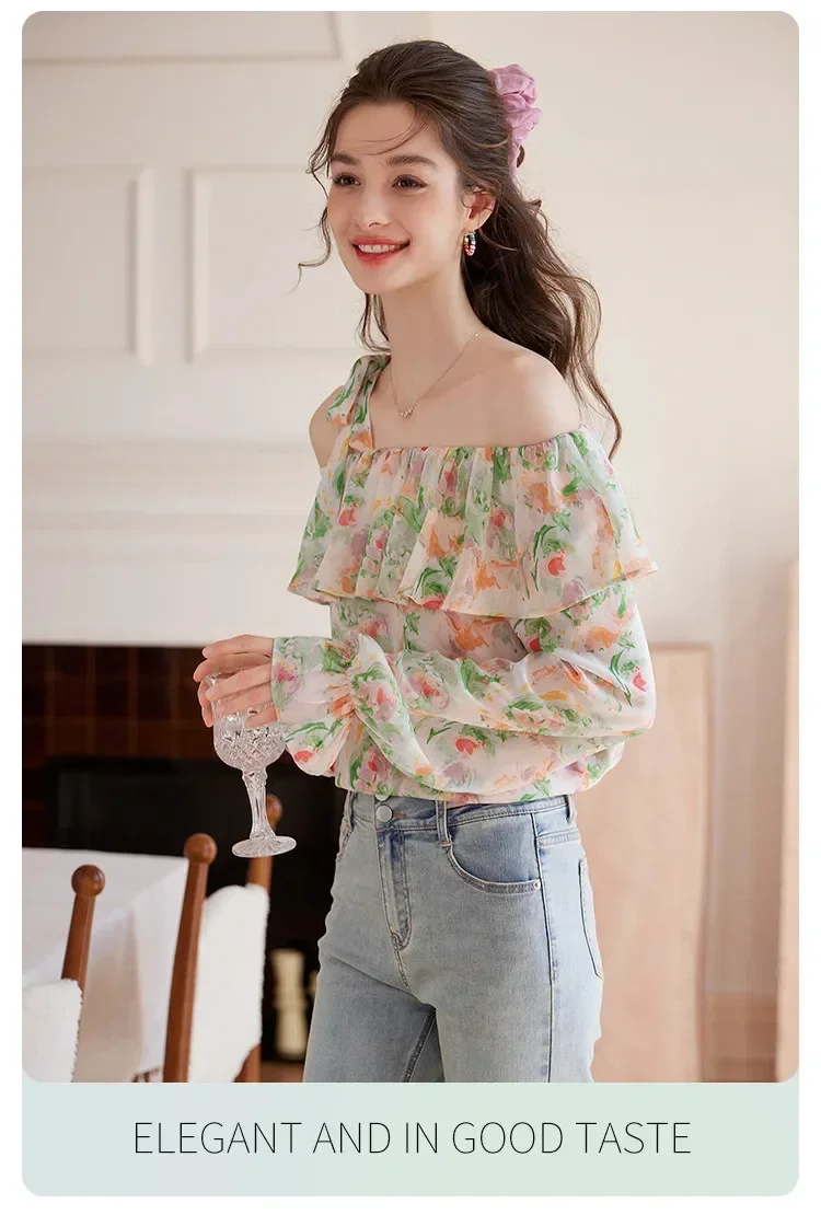 Elegante camicia floreale floreale schiacciata Donna Estate Spalla inclinata Camicetta con bordo a balze Camicia da donna a maniche lunghe Abbigliamento femminile