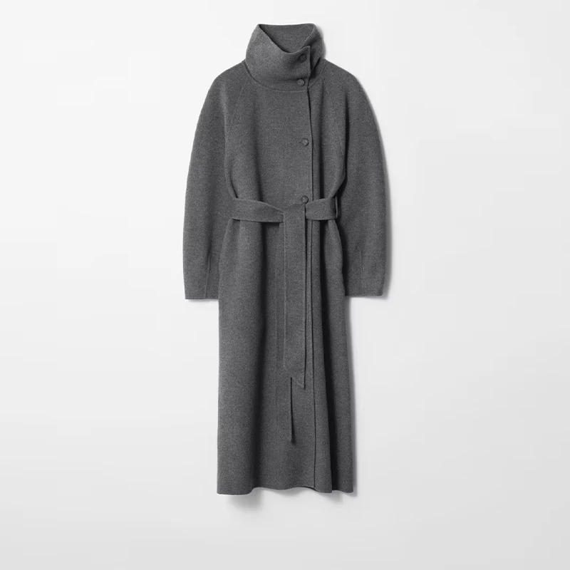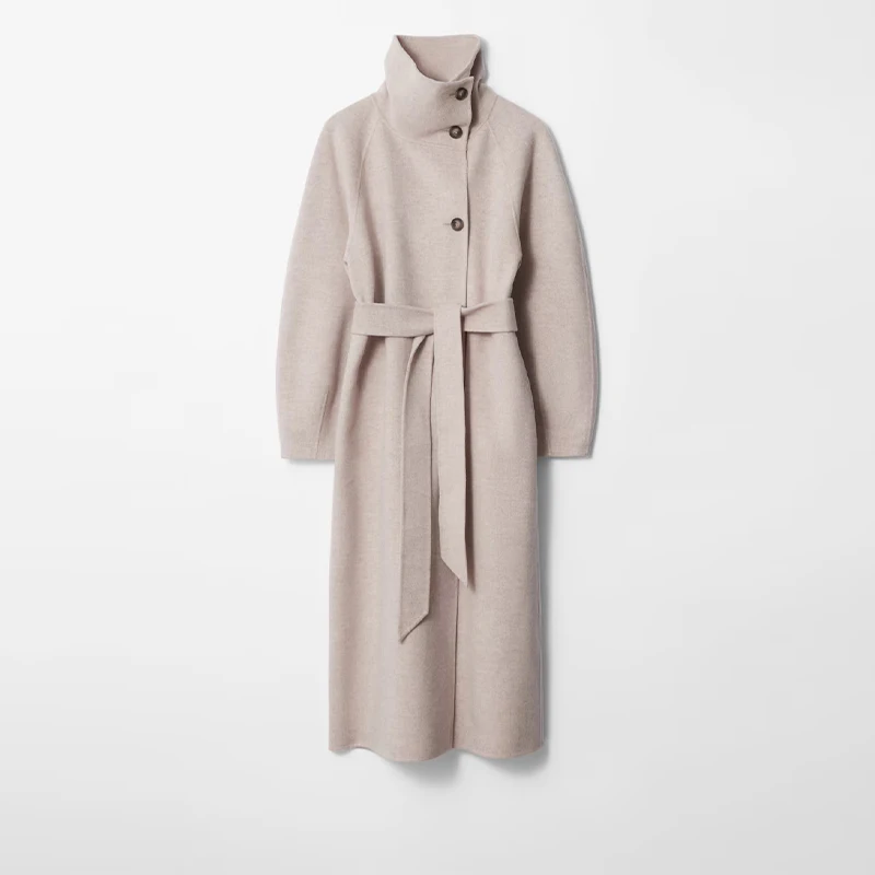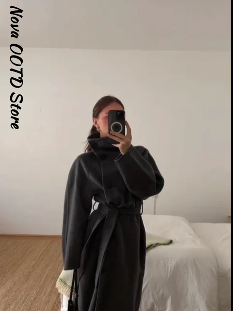 Elegante cappotto lungo di lana con lacci solido Donna Collo alto Tasche monopetto Cappotti 2025 Autunno Inverno Lady Capispalla tutto-fiammifero