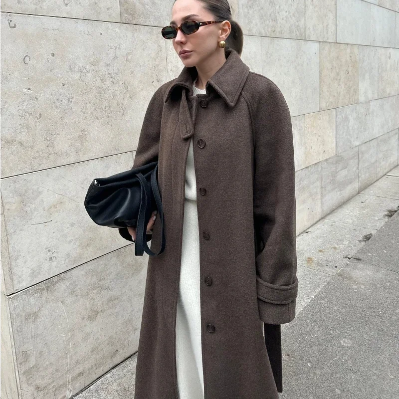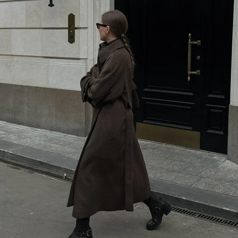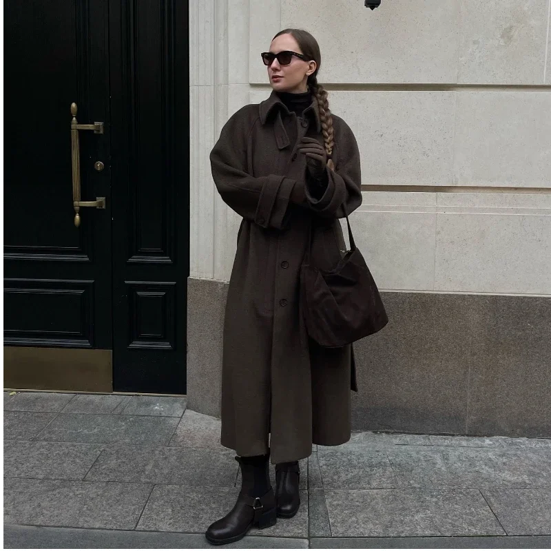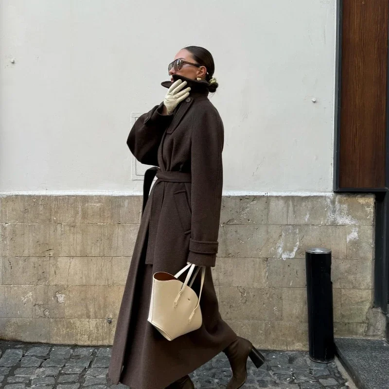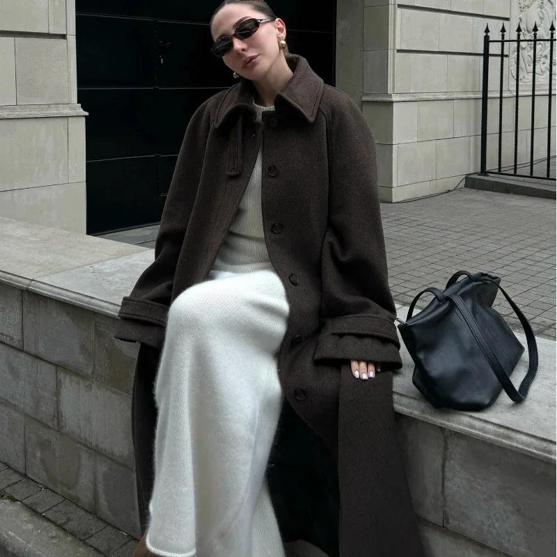 Questo cappotto lungo marrone è un capo intramontabile. Il classico design abbottonato e il tessuto di alta qualità emanano un’aria di sobria eleganza. La sua lunghezza offre un’ampia copertura, rendendolo perfetto per le giornate fredde. Il sottile dettaglio del cappuccio aggiunge un tocco di praticità, mentre la vestibilità oversize dona un’atmosfera rilassata e disinvolta. Abbinato a guanti e borsa abbinata, crea un look coerente e sofisticato. Che tu stia andando in ufficio, facendo commissioni o uscendo per una passeggiata, questo cappotto è un capo versatile che può elevare qualsiasi outfit, fondendo perfettamente comfort e stile.