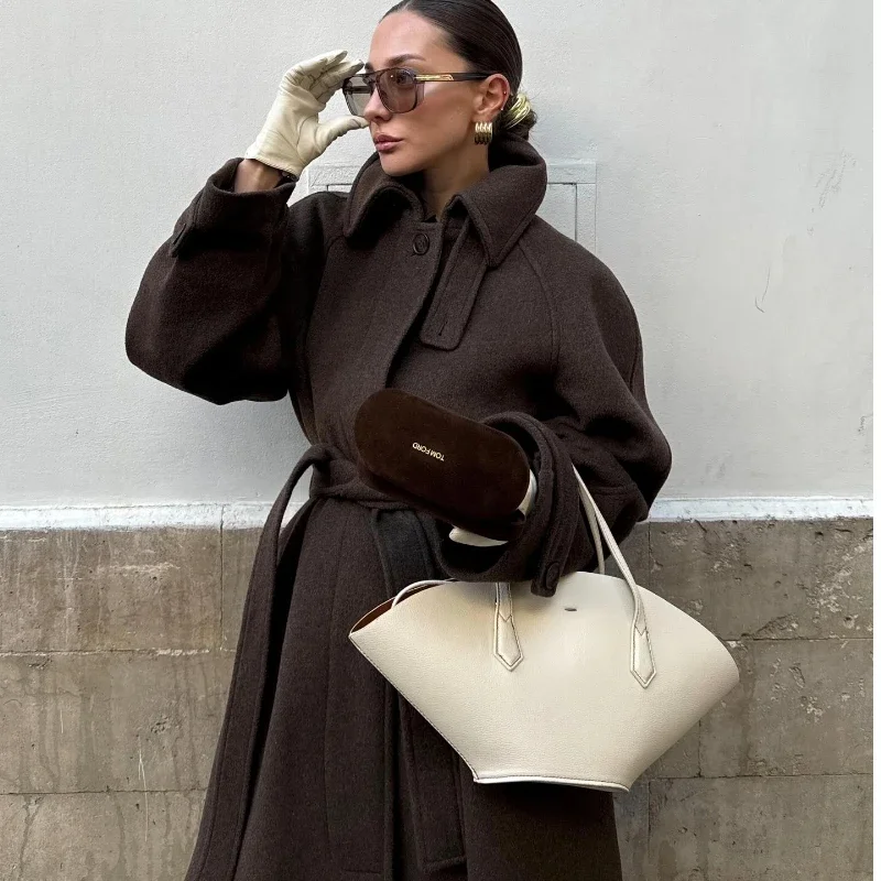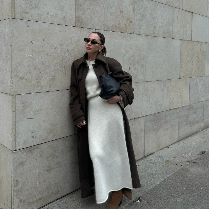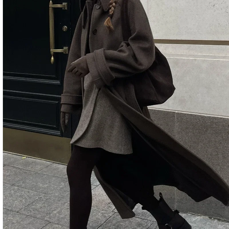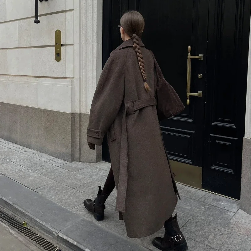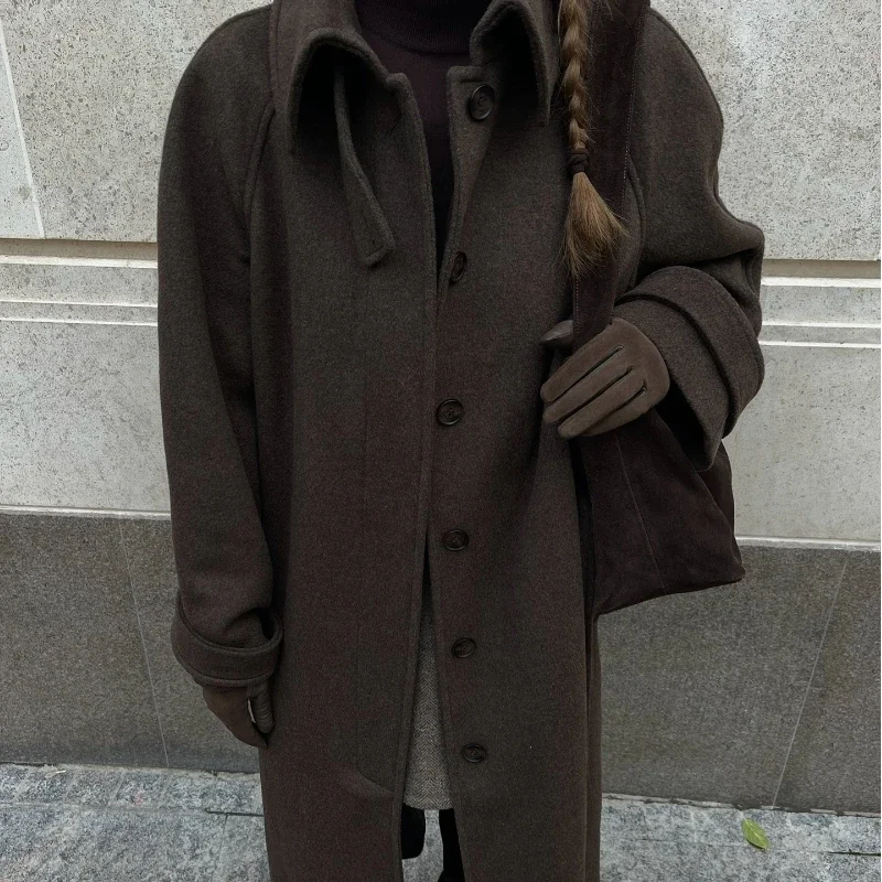 Questo cappotto lungo marrone è un capo intramontabile. Il classico design abbottonato e il tessuto di alta qualità emanano un’aria di sobria eleganza. La sua lunghezza offre un’ampia copertura, rendendolo perfetto per le giornate fredde. Il sottile dettaglio del cappuccio aggiunge un tocco di praticità, mentre la vestibilità oversize dona un’atmosfera rilassata e disinvolta. Abbinato a guanti e borsa abbinata, crea un look coerente e sofisticato. Che tu stia andando in ufficio, facendo commissioni o uscendo per una passeggiata, questo cappotto è un capo versatile che può elevare qualsiasi outfit, fondendo perfettamente comfort e stile.