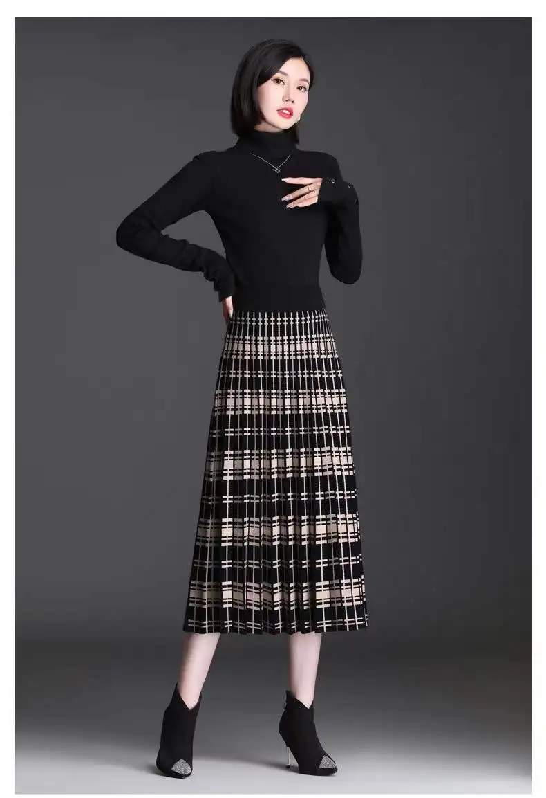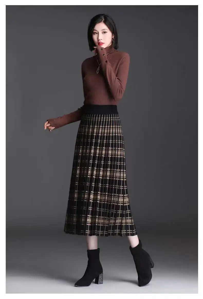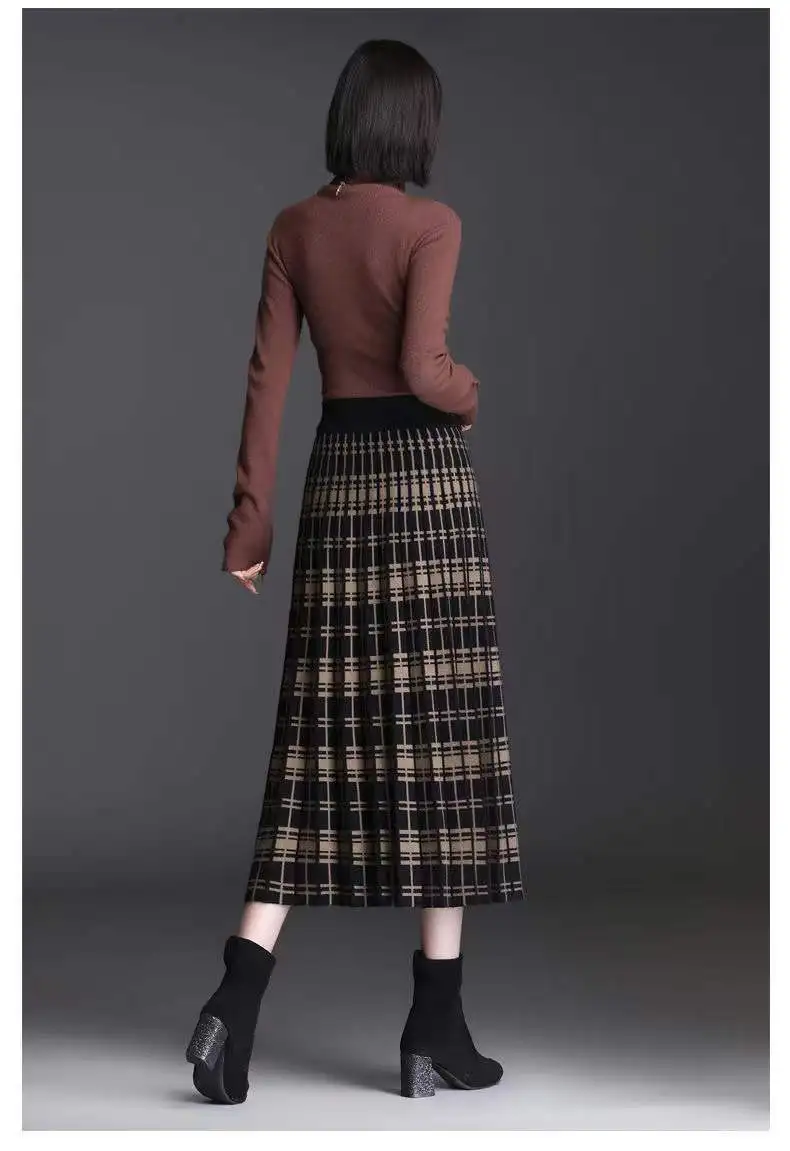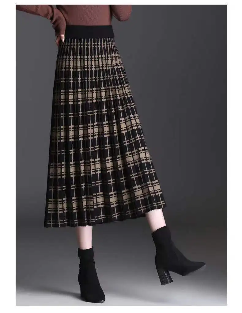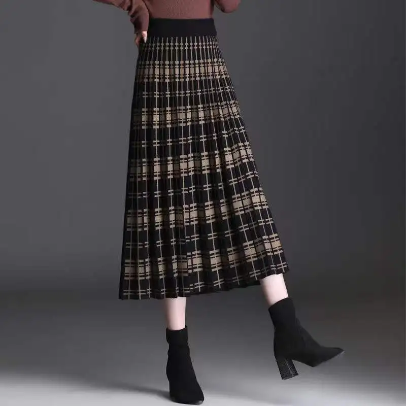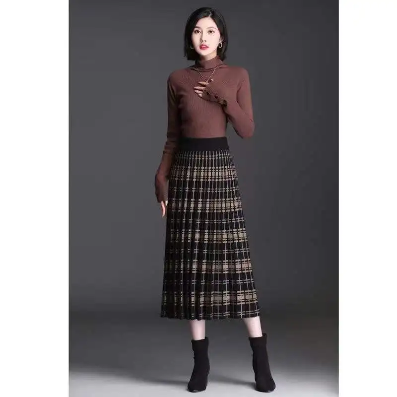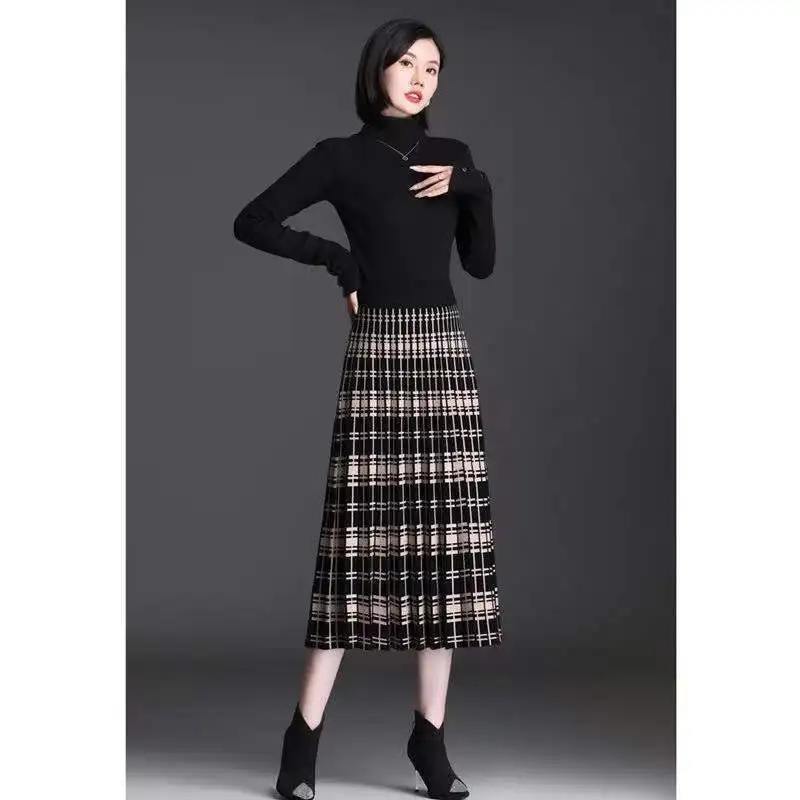 Elegante gonna a pieghe lavorata a maglia lunga da donna Vintage autunno inverno moda coreana a vita alta allentata Midi a-line Casual gonne a quadri