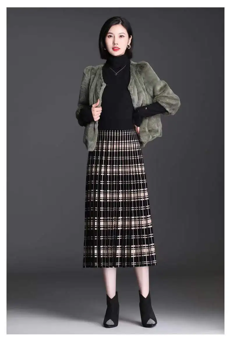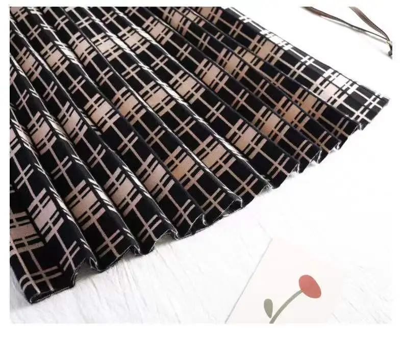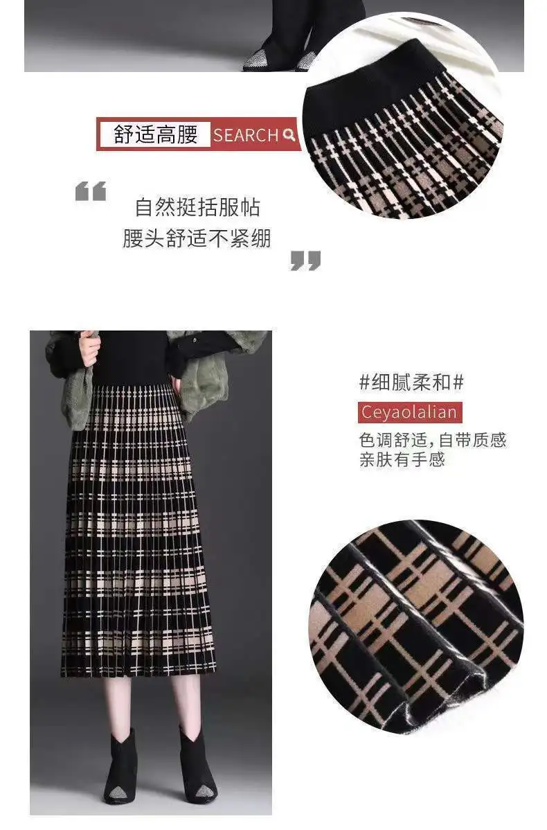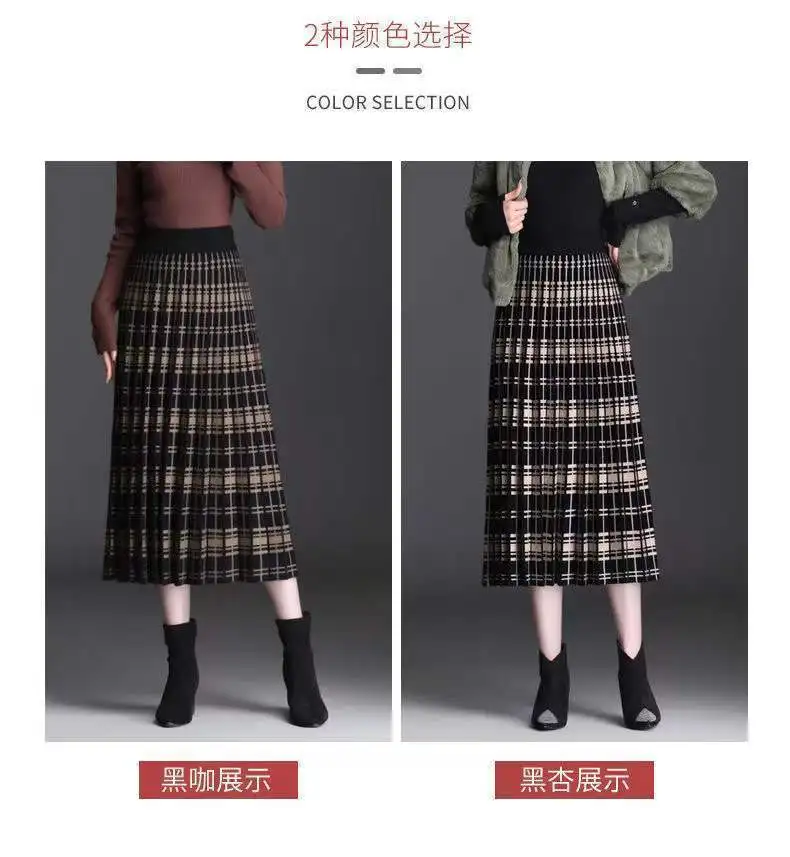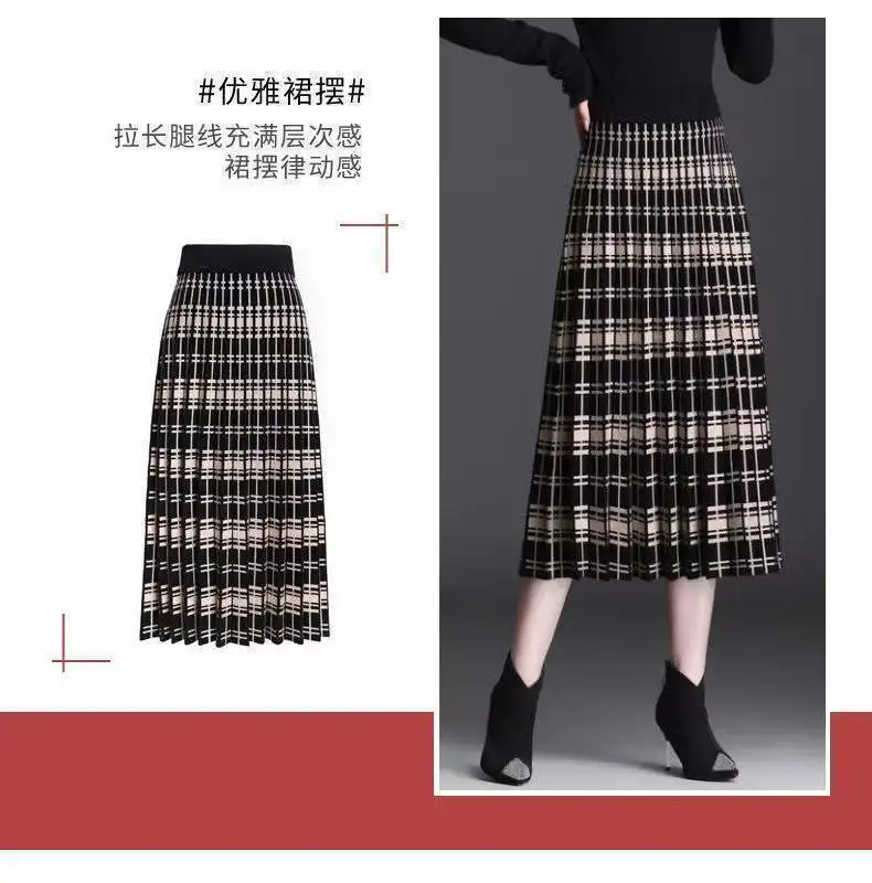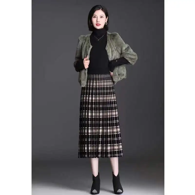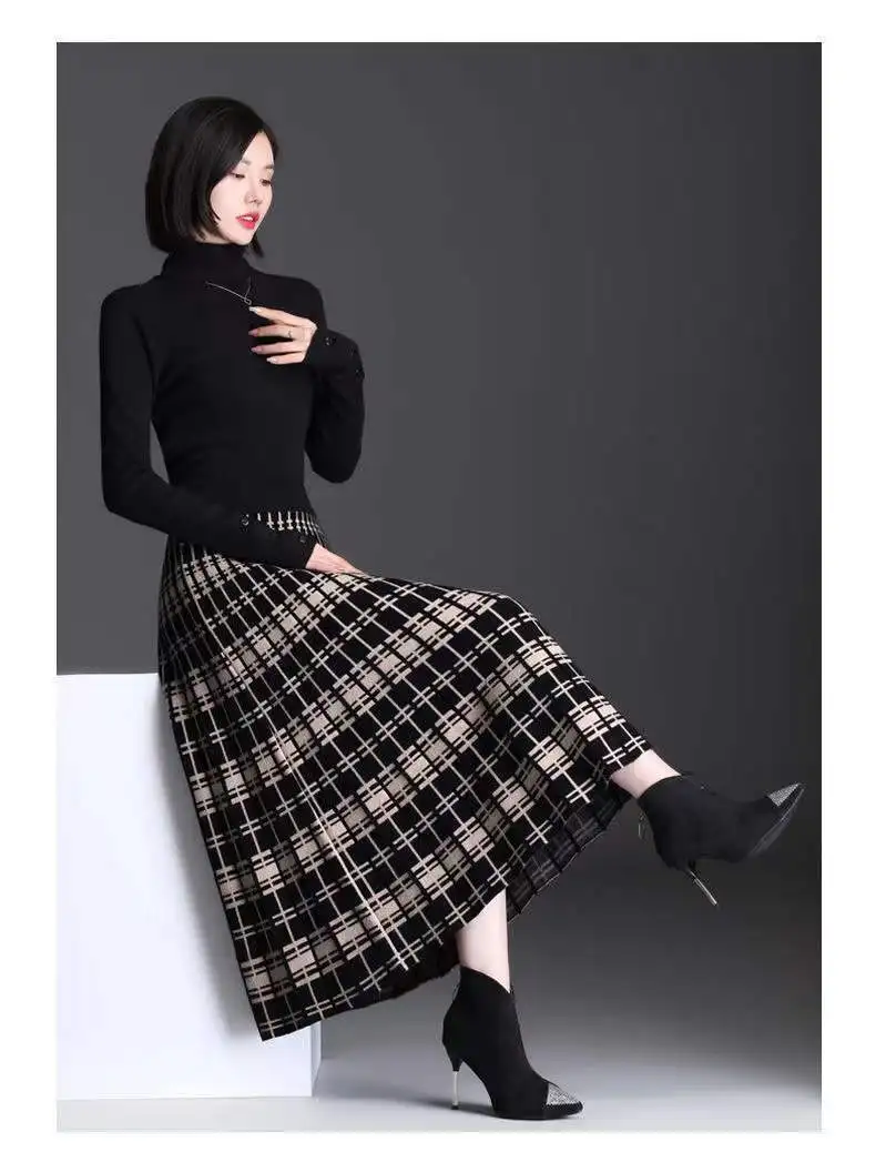 Elegante gonna a pieghe lavorata a maglia lunga da donna Vintage autunno inverno moda coreana a vita alta allentata Midi a-line Casual gonne a quadri