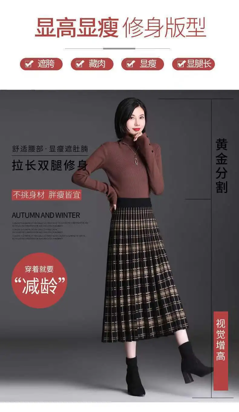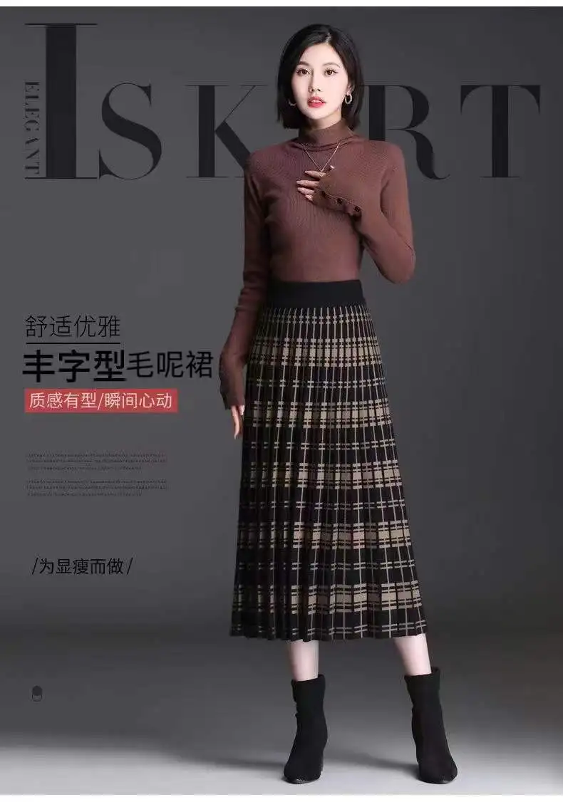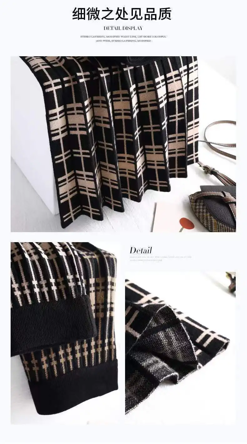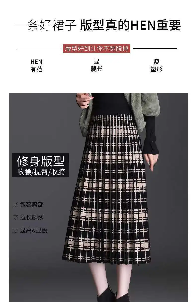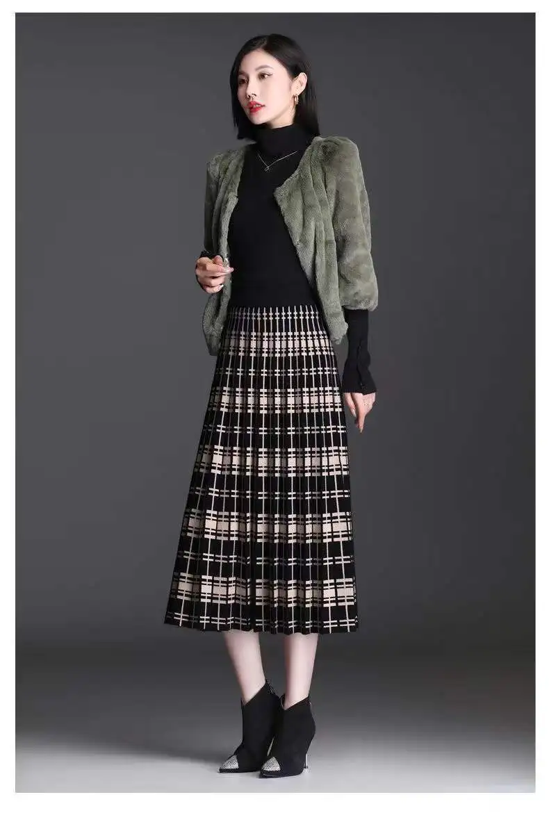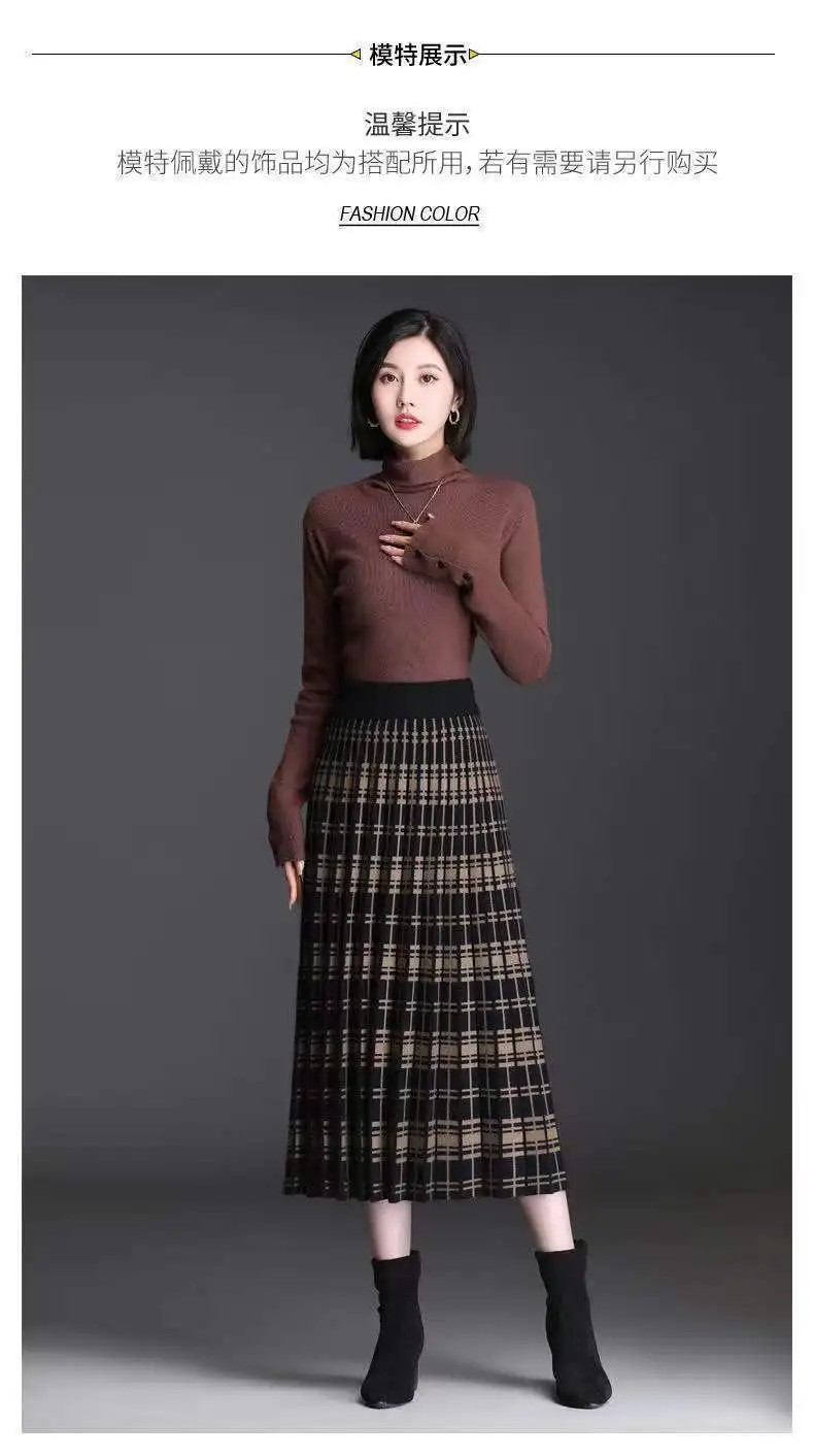 Elegante gonna a pieghe lavorata a maglia lunga da donna Vintage autunno inverno moda coreana a vita alta allentata Midi a-line Casual gonne a quadri