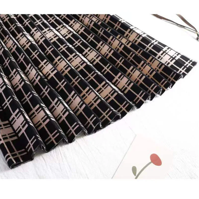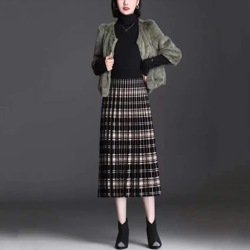 Elegante gonna a pieghe lavorata a maglia lunga da donna Vintage autunno inverno moda coreana a vita alta allentata Midi a-line Casual gonne a quadri