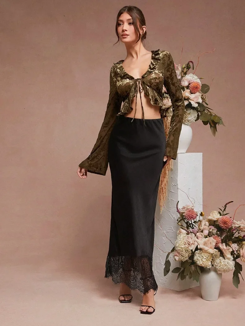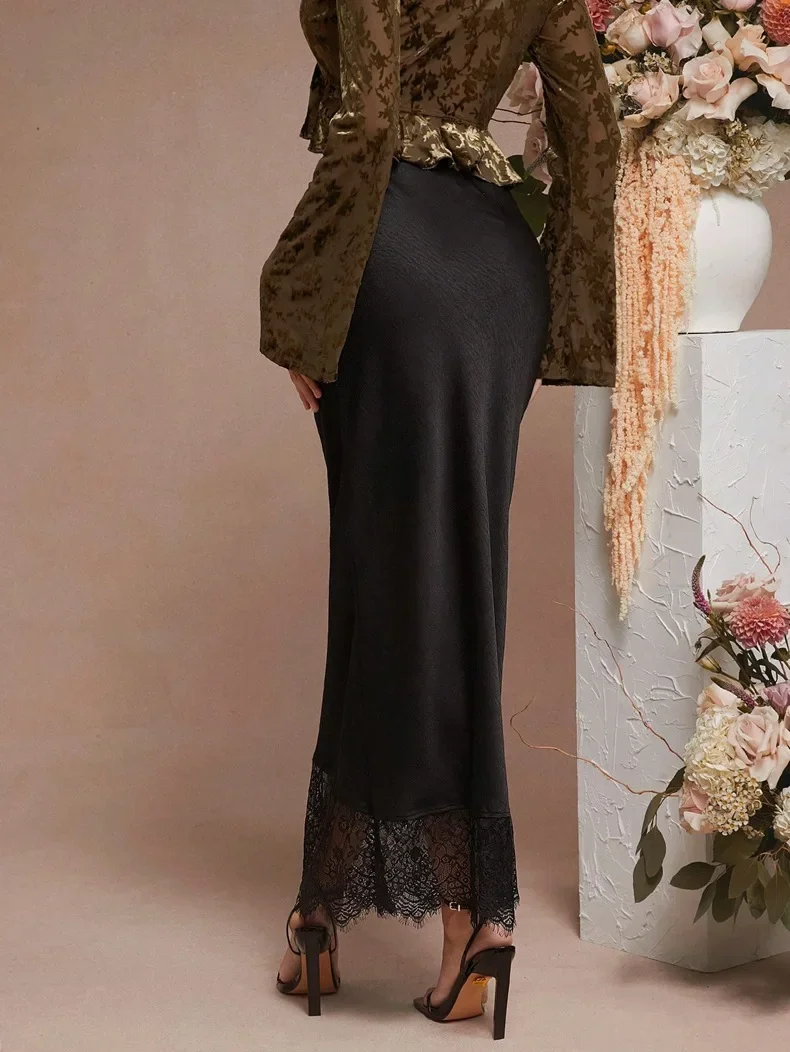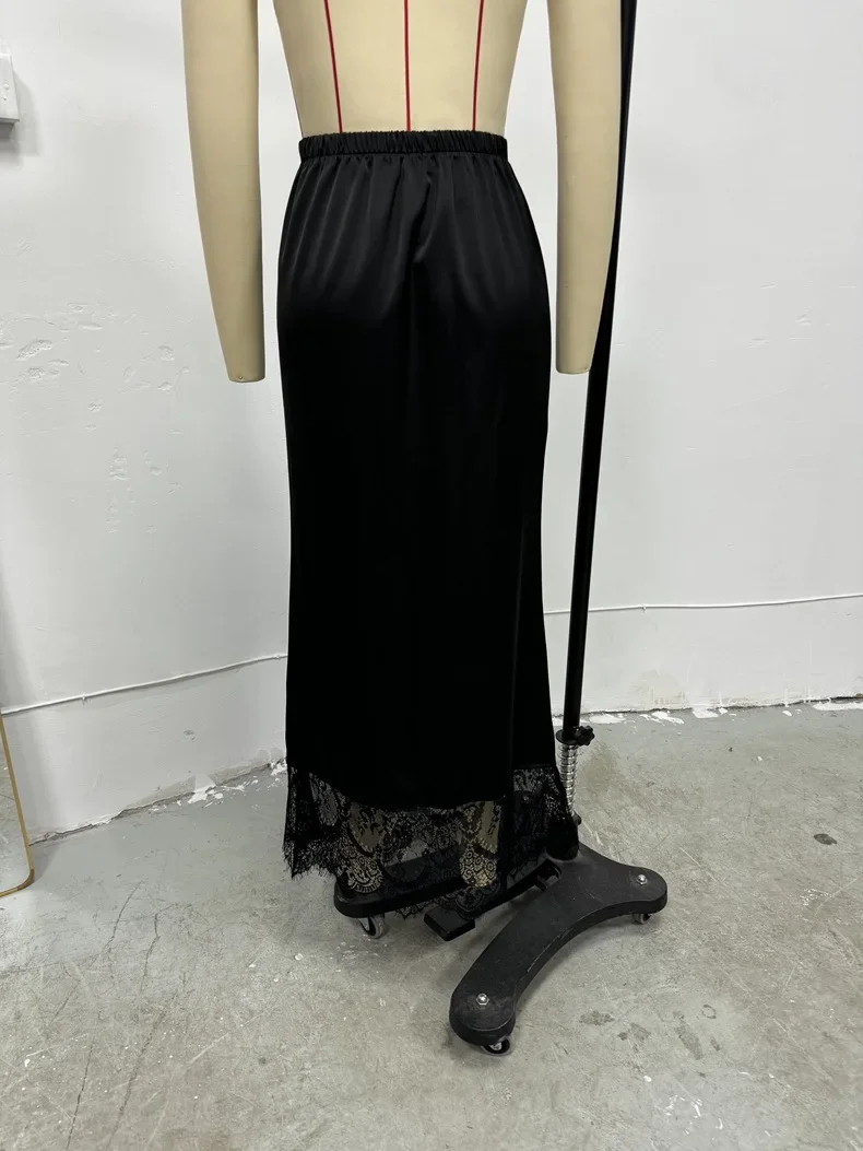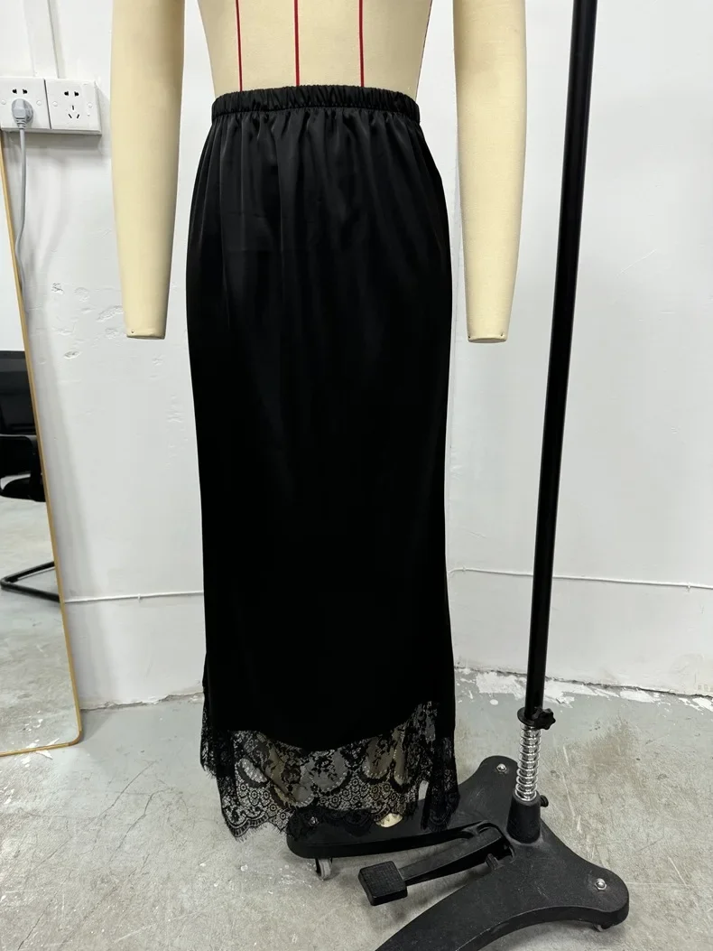 Elegante gonna con superficie in raso patchwork di pizzo Sensazione di fascia alta Fonte di moda da donna Gonna longuette in fibra di poliestere 1Elegante gonna con superficie in raso patchwork di pizzo Sensazione di fascia alta Fonte di moda da donna Gonna longuette in fibra di poliestere