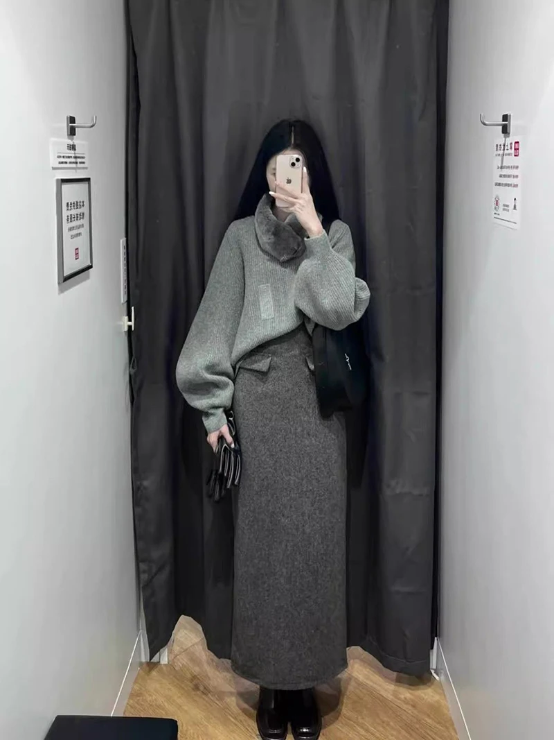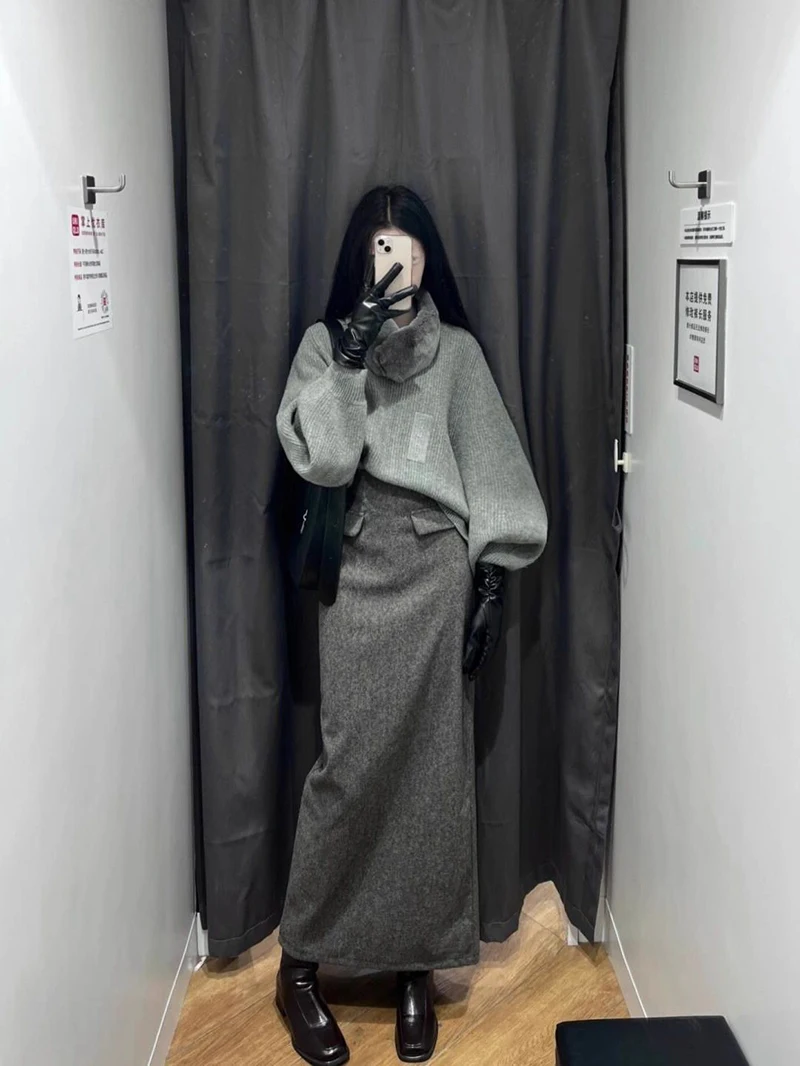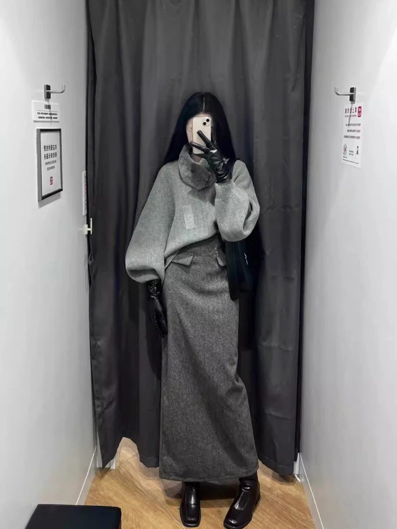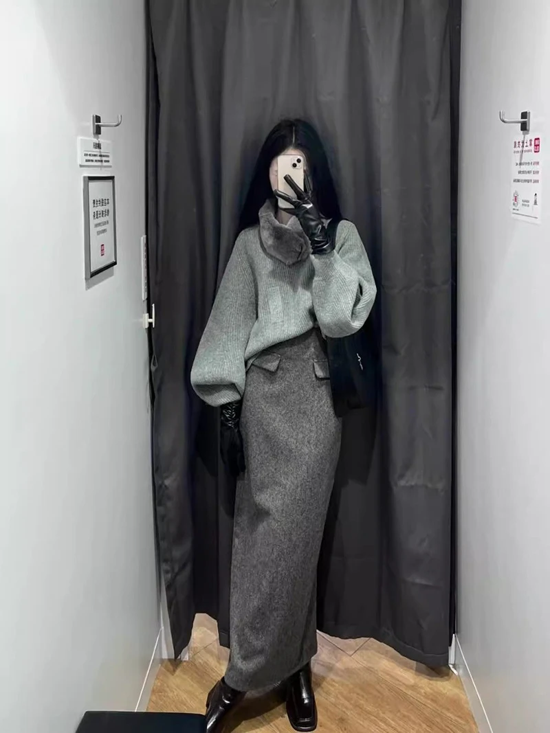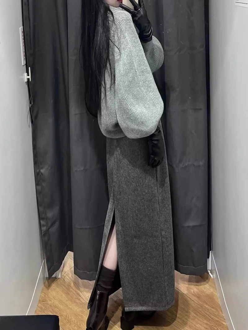 Elegante gonna longuette di lana Donna Vintage Sexy Split Hip Wrap Gonne Inverno Donna Coreana Design a vita alta con spacco A Line Faldas Nuovo