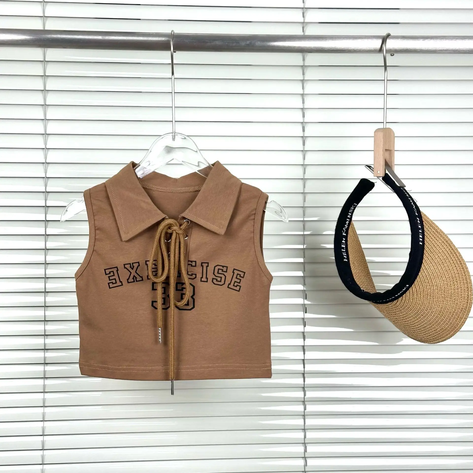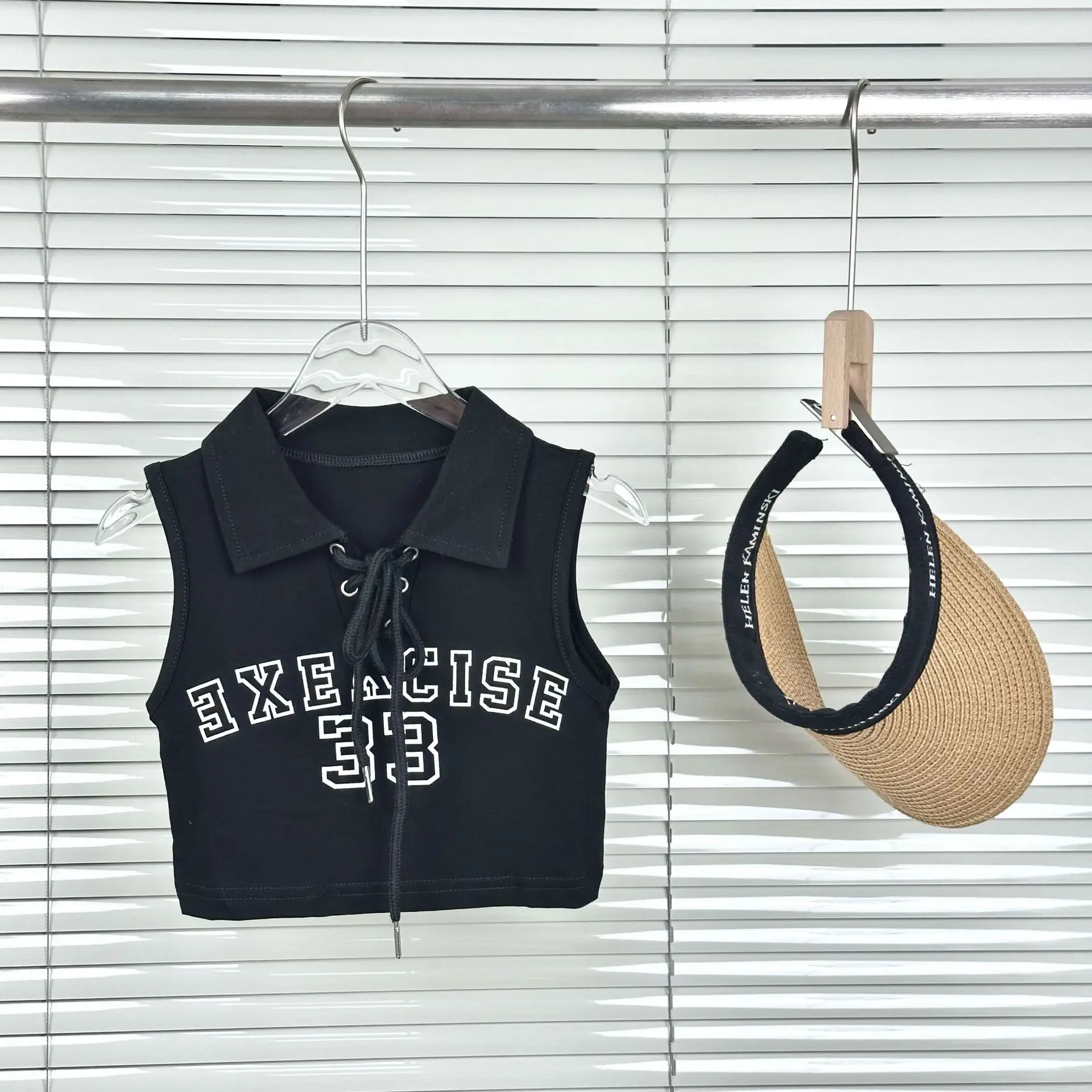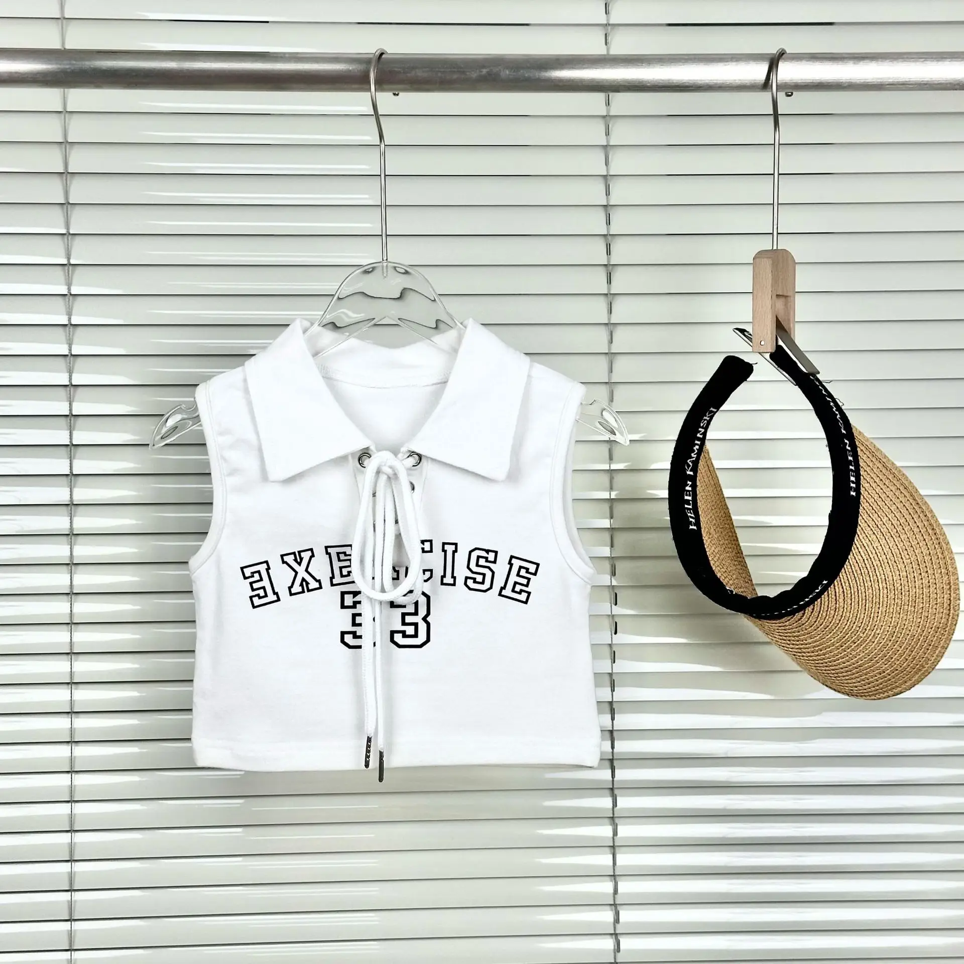 Estate per ragazze nuovo gilet con lacci versione coreana lettere per bambini medi e grandi bavero polo corto moda top senza maniche
