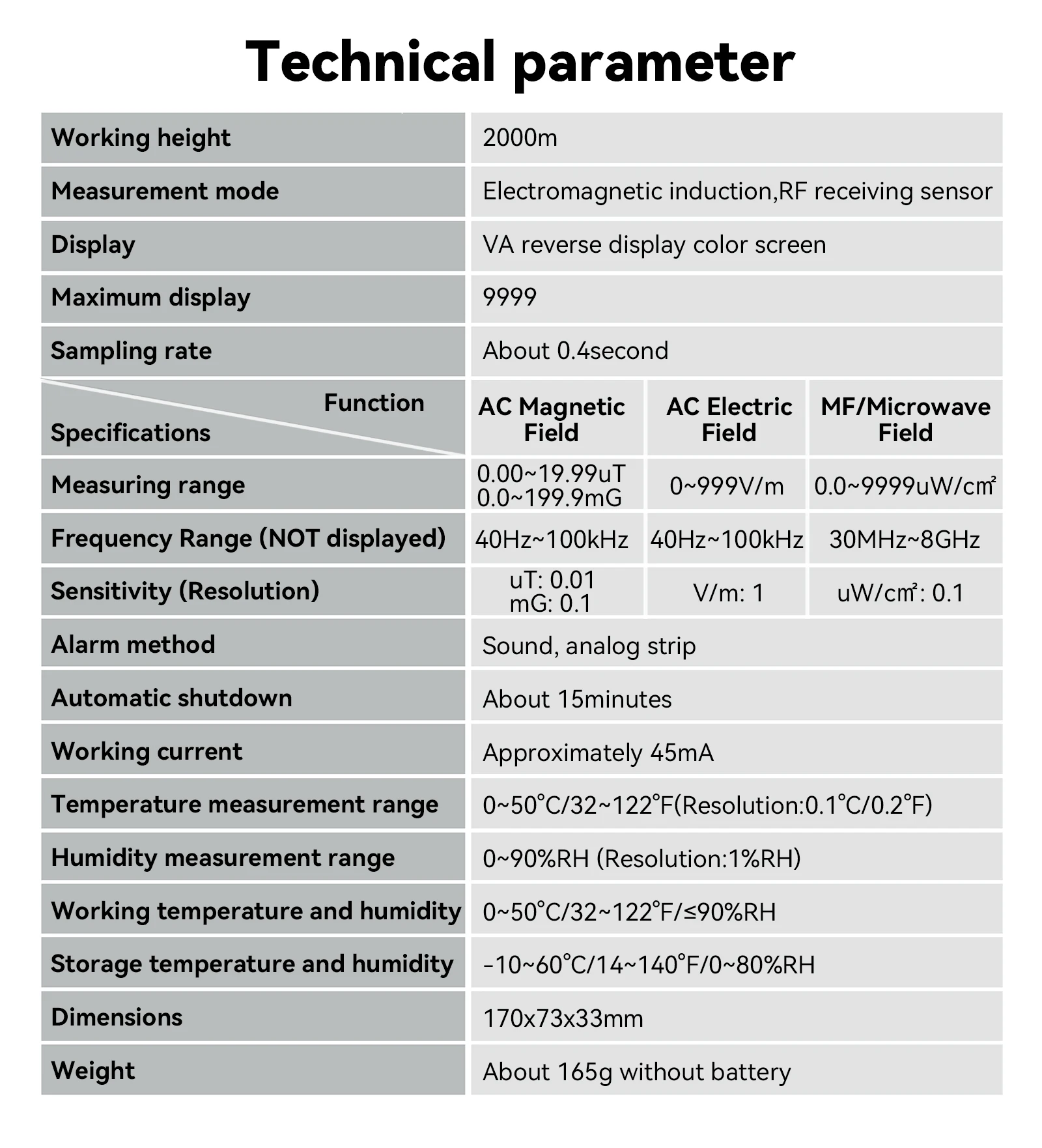 ●Sensibilità (Risoluzione):uT: 0,01 mG: 0,1(MF)V/m: 1(EF)uW/cm2:0,1(MF)