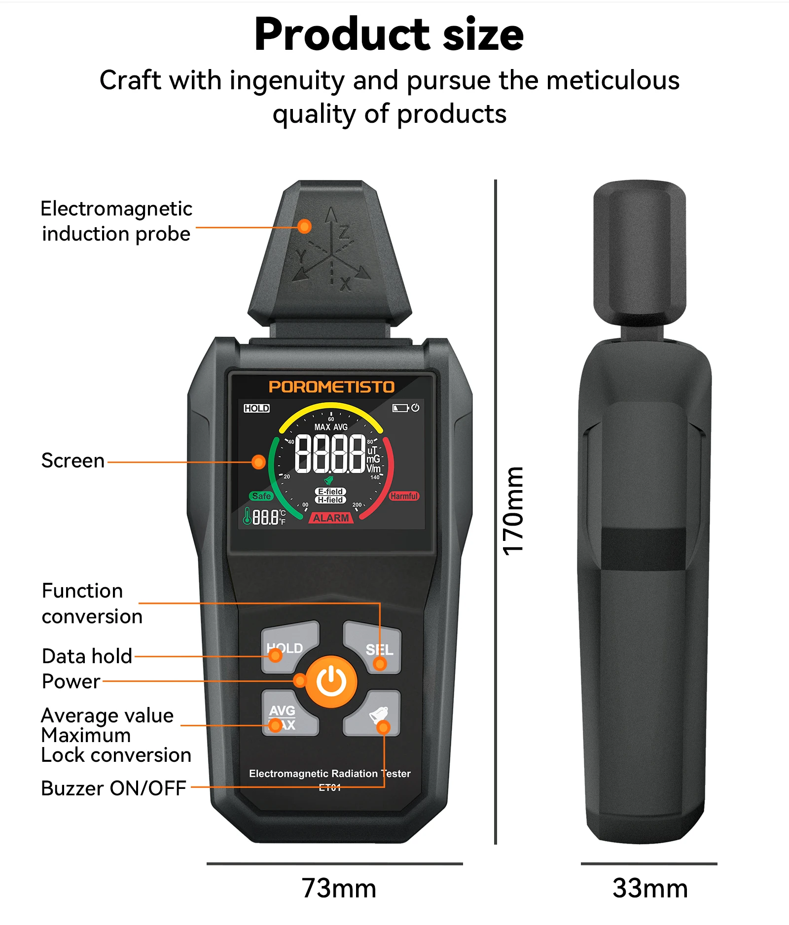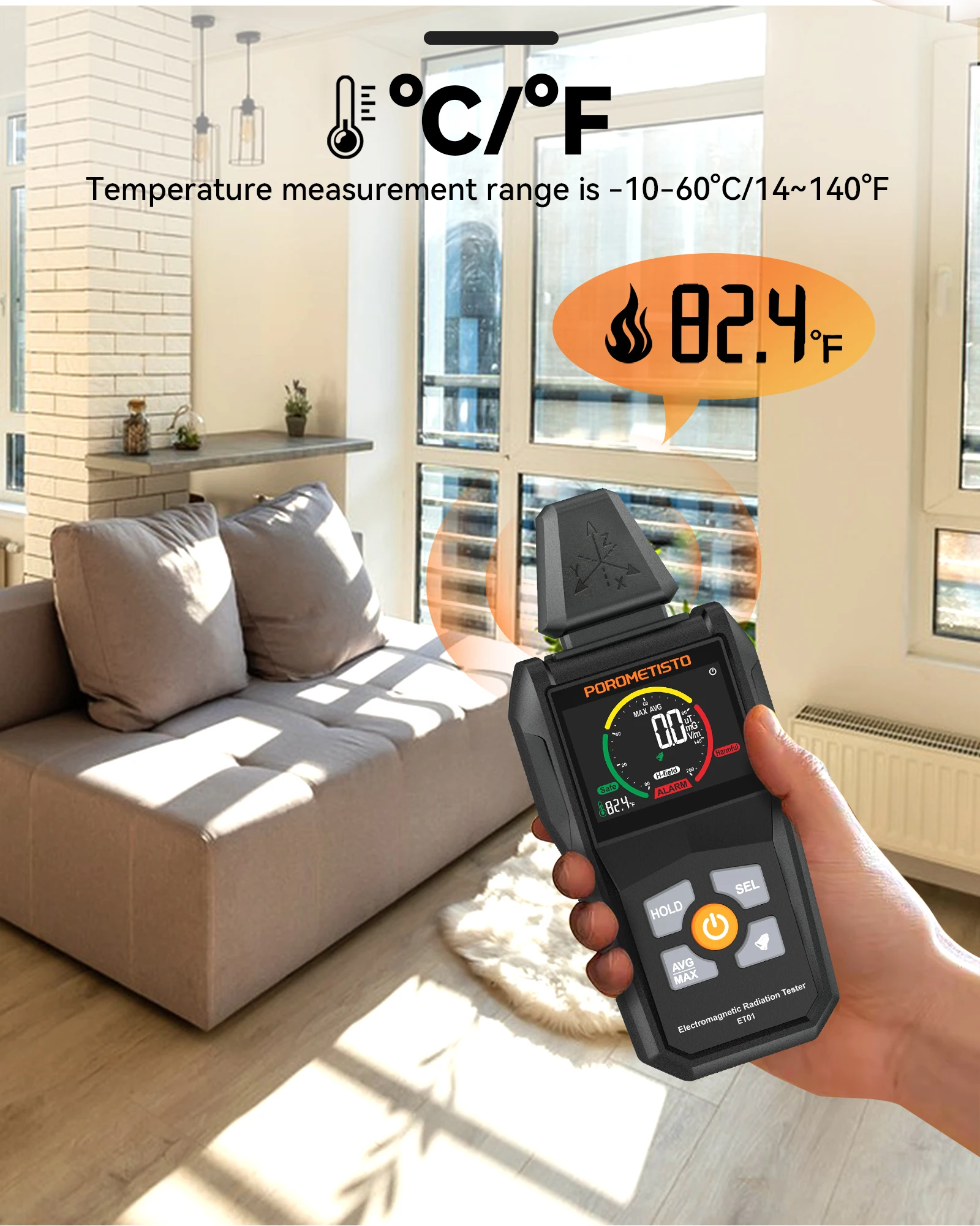 ●Multifunzionale: è facile da usare e semplice da usare, che può misurare radiazioni di campo magnetico, radiazioni di campo elettrico, temperatura ambientale, ecc.