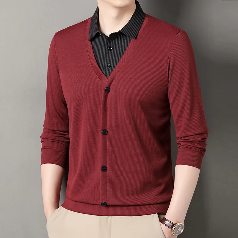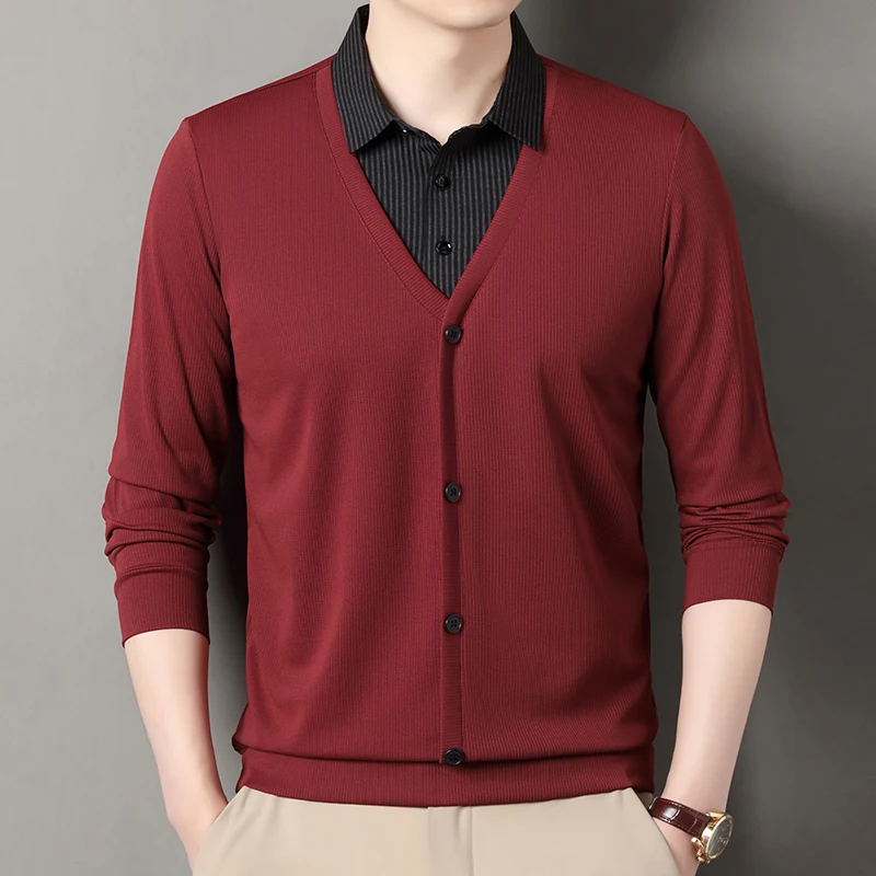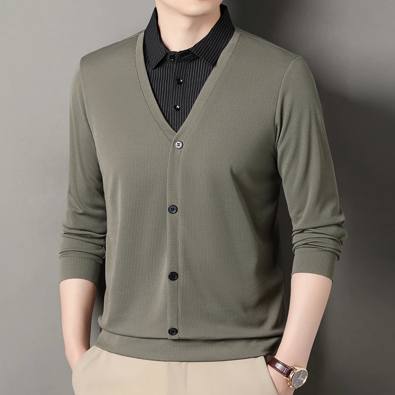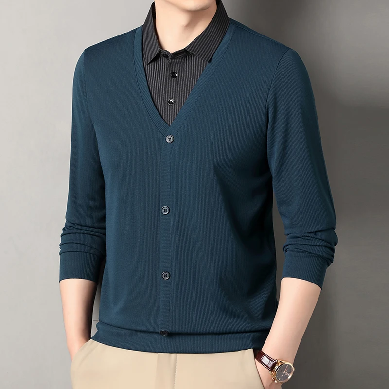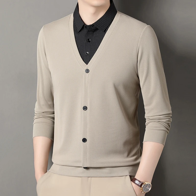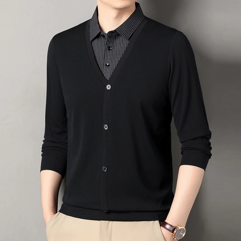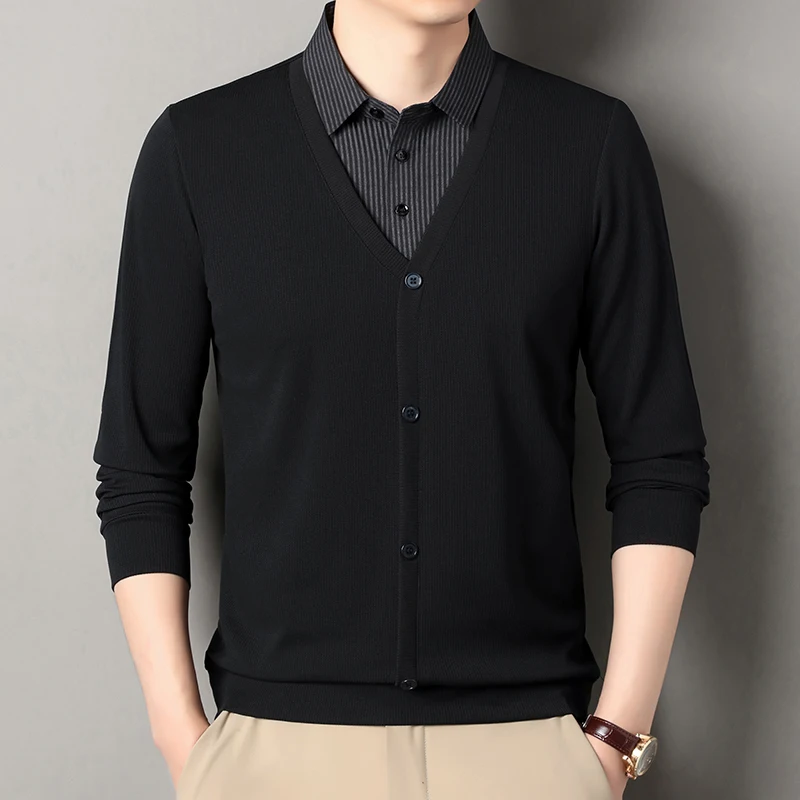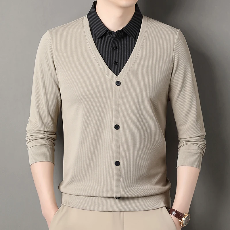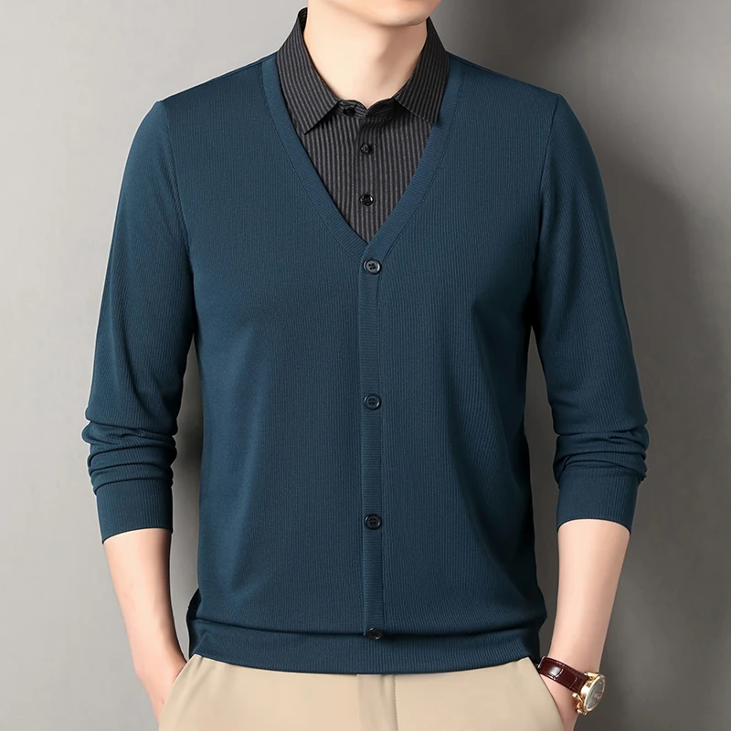 Falsi due maglioni lavorati a maglia per uomo 2025 New Business Casual T-shirt a maniche lunghe Camicia a righe Colletto Maglione Autunno/Inverno 1Falsi due maglioni lavorati a maglia per uomo 2025 New Business Casual T-shirt a maniche lunghe Camicia a righe Colletto Maglione Autunno/Inverno