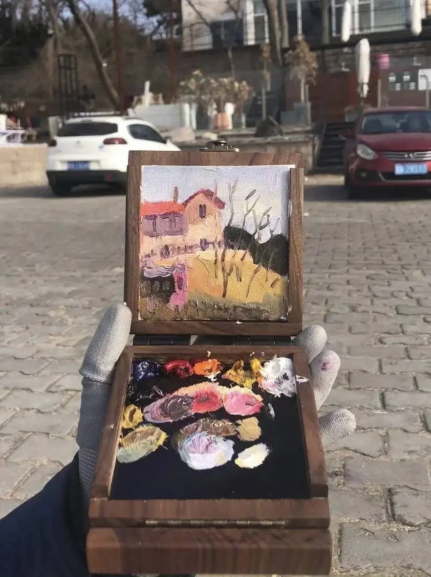 Mini scatola per pittura a olio di piccole dimensioni, adatta per dipingere un pannello per pittura a olio da 10 * 10 cm. Può essere utilizzato per schizzi all’aperto.