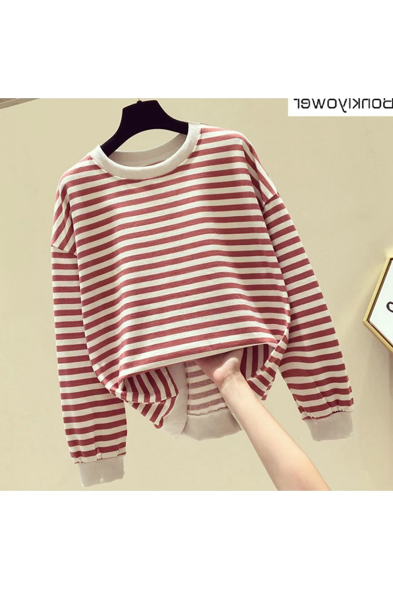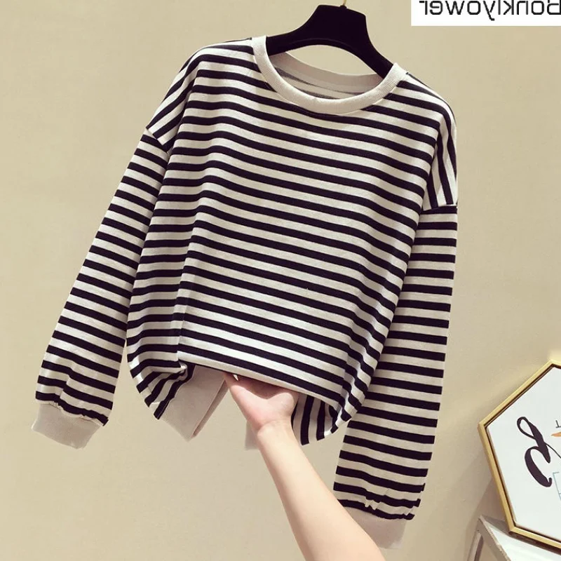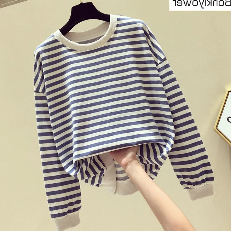 Felpa da donna a righe in cotone, pullover slim a maniche lunghe, top girocollo, ampio, primavera e autunno, nuovo, 2024