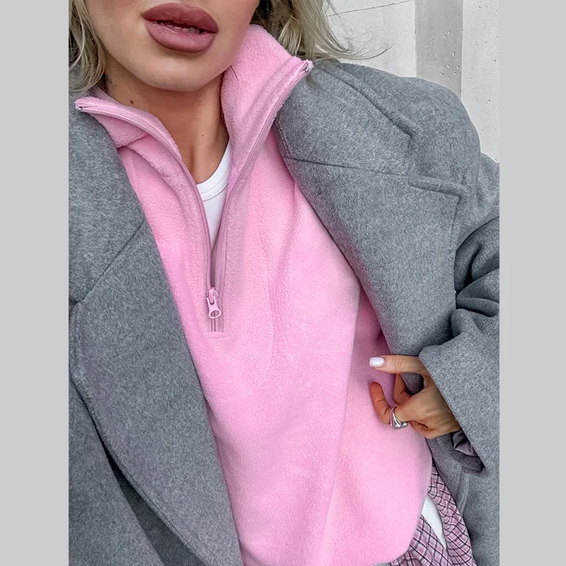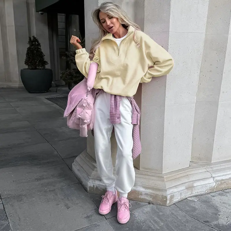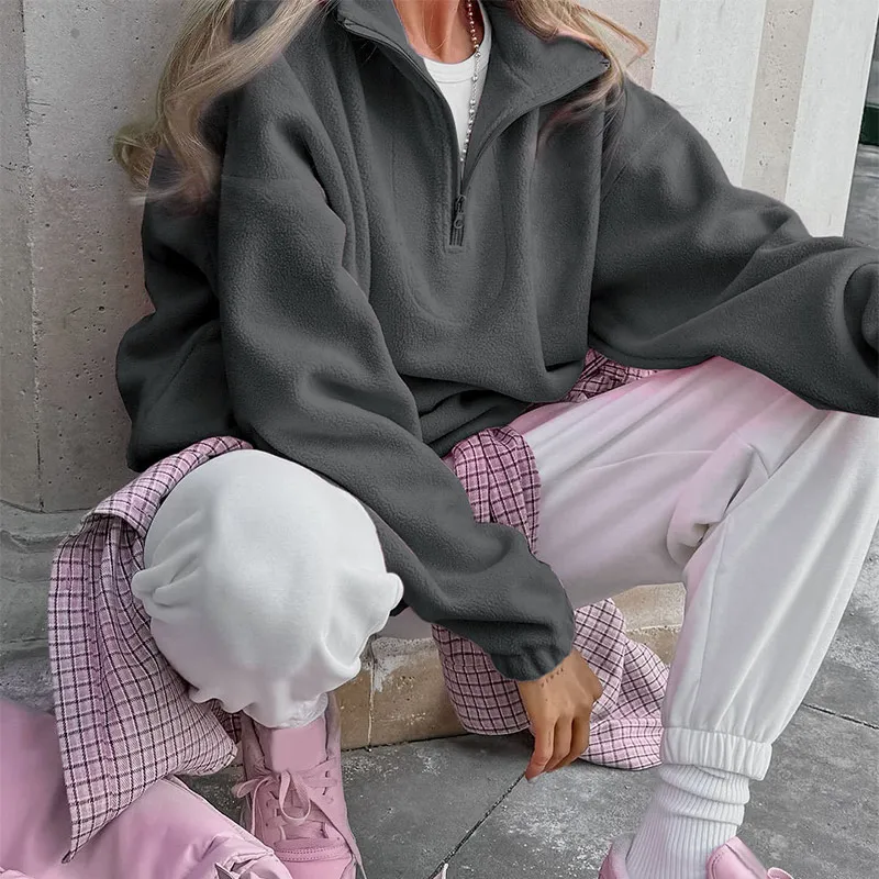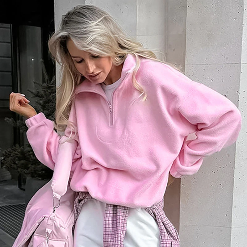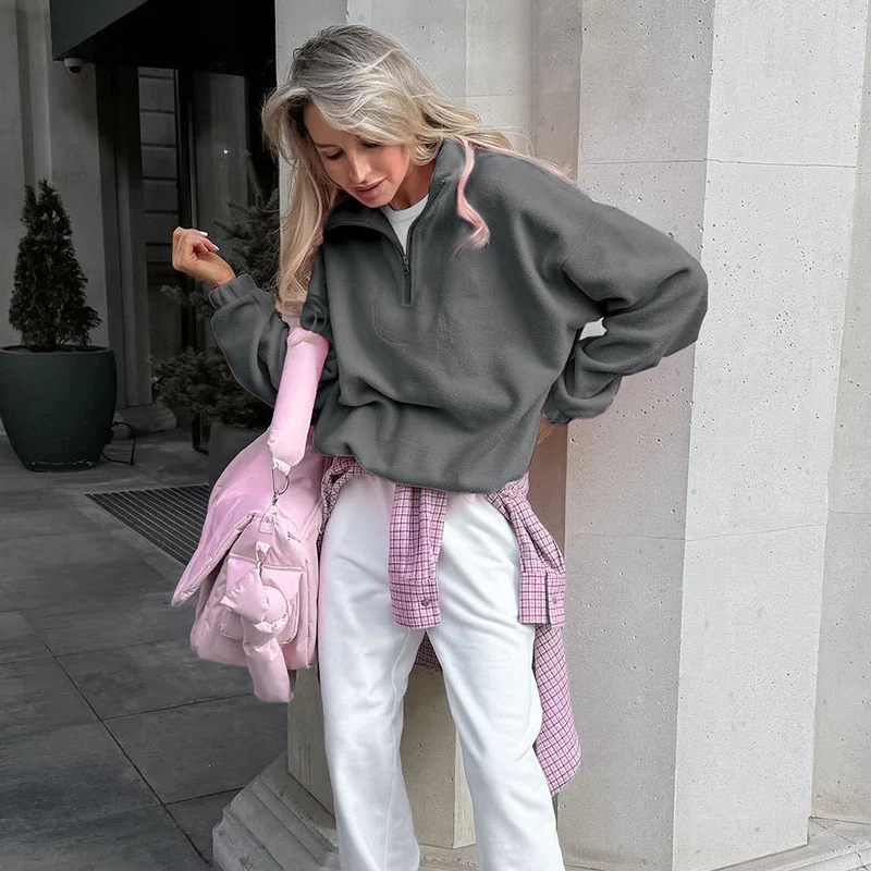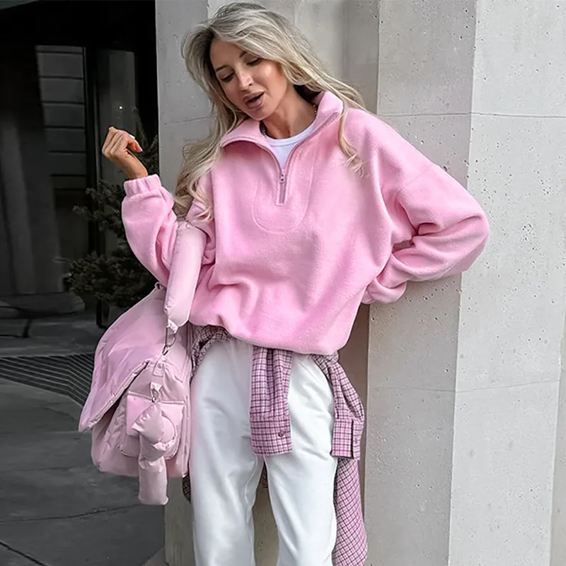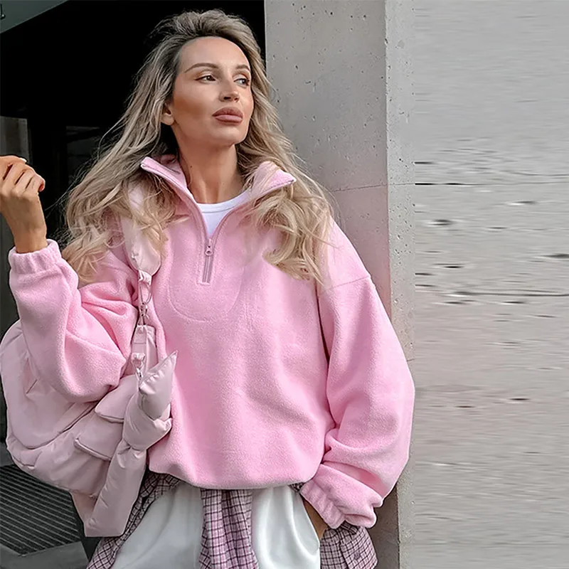 Felpe con cappuccio da donna casual Colletto rovesciato Cerniera Manica intera Pullover femminile solido allentato 2025 Autunno Sport Fashion Lady Pullover 1Felpe con cappuccio da donna casual Colletto rovesciato Cerniera Manica intera Pullover femminile solido allentato 2025 Autunno Sport Fashion Lady Pullover