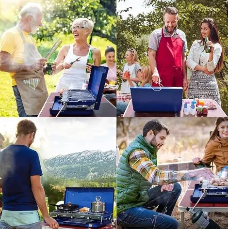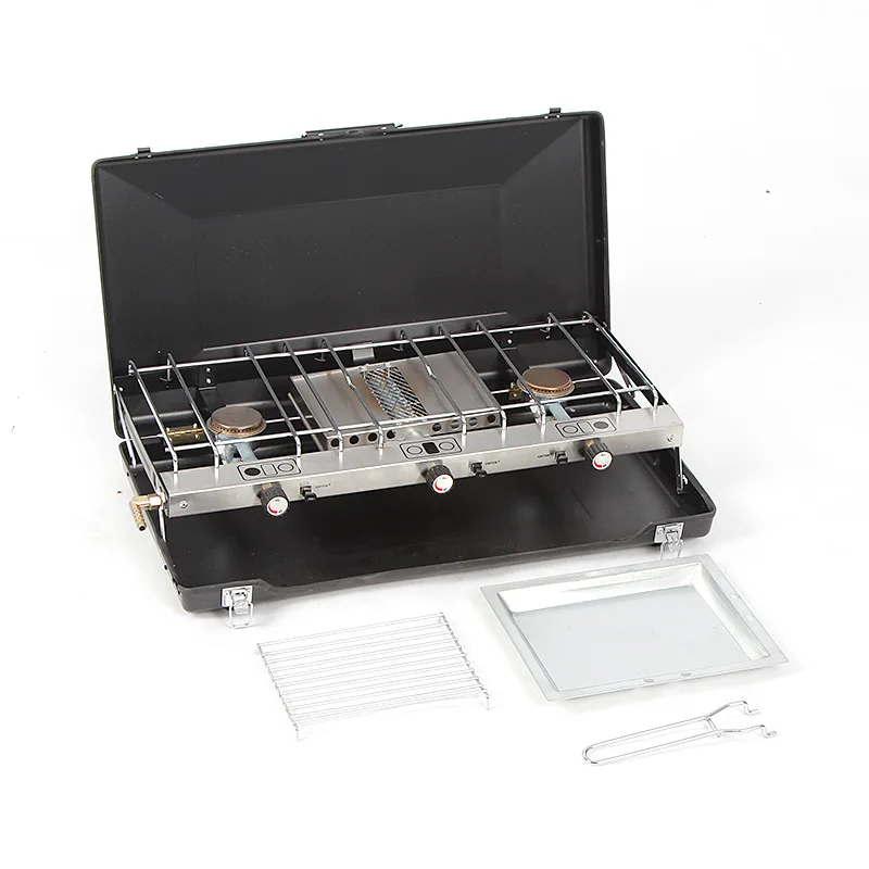 Una griglia portatile e potente sarà un pezzo essenziale di attrezzatura per cucine da campeggio all’aperto.Questo fornello da campeggio pieghevole a 3 fuochi è realizzato con materiali di alta qualità, dotato di corpo leggero e di grande durata, che sarà una scelta di qualità per te.Con una griglia rimovibile, un vassoio e tre bruciatori indipendenti incorporati per il controllo del fuoco, è potente abbastanza per cucinare e grigliare con facilità, consente di goderti il piacere sia in campeggio che in cucina.