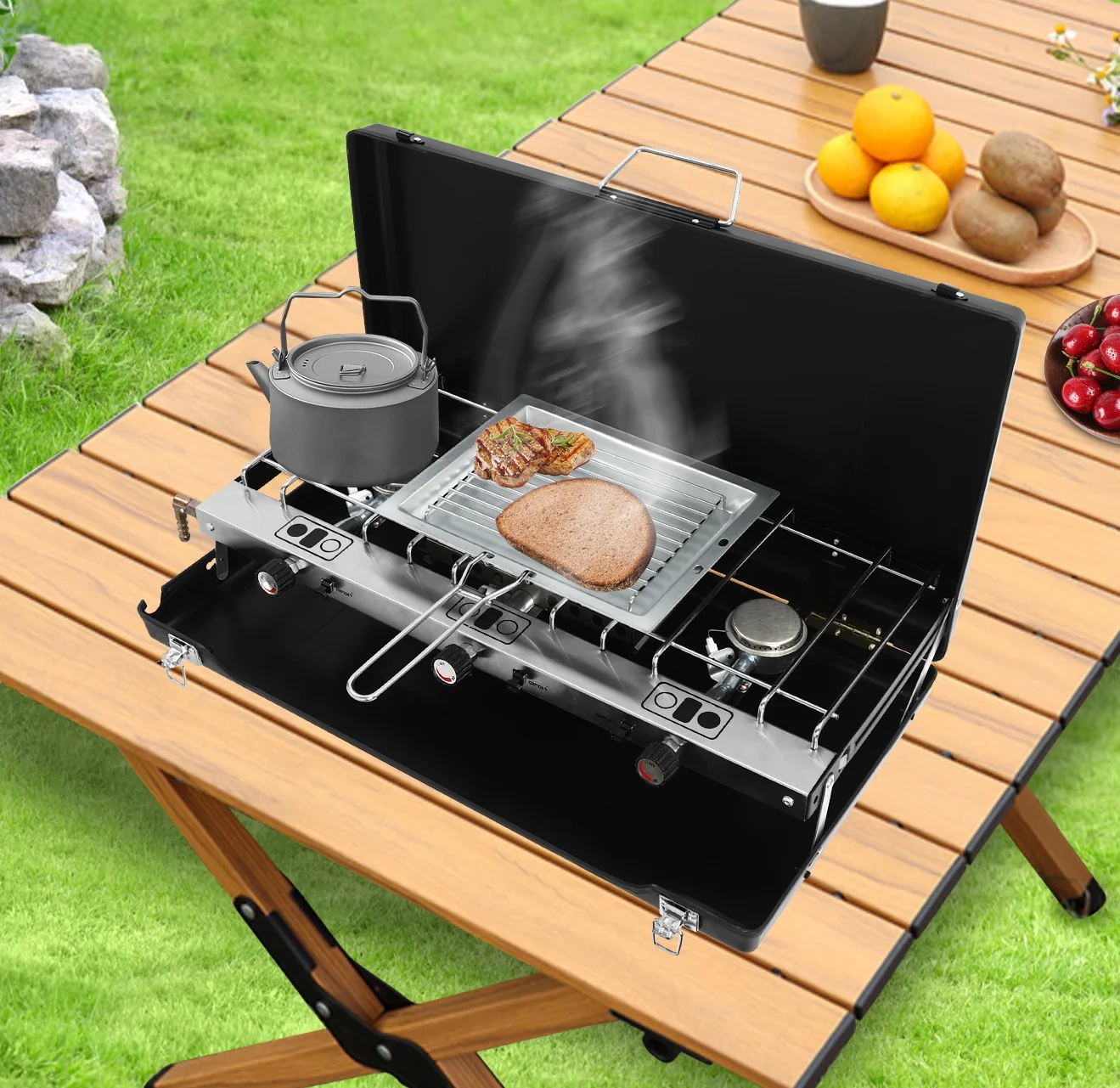 Una griglia portatile e potente sarà un pezzo essenziale di attrezzatura per cucine da campeggio all’aperto.Questo fornello da campeggio pieghevole a 3 fuochi è realizzato con materiali di alta qualità, dotato di corpo leggero e di grande durata, che sarà una scelta di qualità per te.Con una griglia rimovibile, un vassoio e tre bruciatori indipendenti incorporati per il controllo del fuoco, è potente abbastanza per cucinare e grigliare con facilità, consente di goderti il piacere sia in campeggio che in cucina.