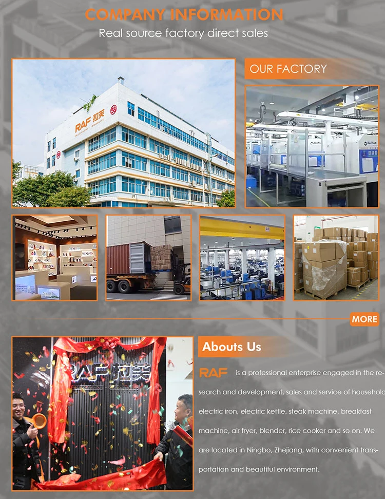 Zhejiang RAF Elettrodomestico Co., Ltd.distribuisce ferri da stiro elettrici all’ingrosso, bollitori elettrici, robot da cucina, macchine da caffè, macchine da bistecca ecc.e disfruta un stato elevato tra i consumatori.Relying sul concetto del cliente in primo luogo e di servizio, la nostra azienda ha establito alle relazioni cooperative stabili a lungo termine con molti acquirenti.
