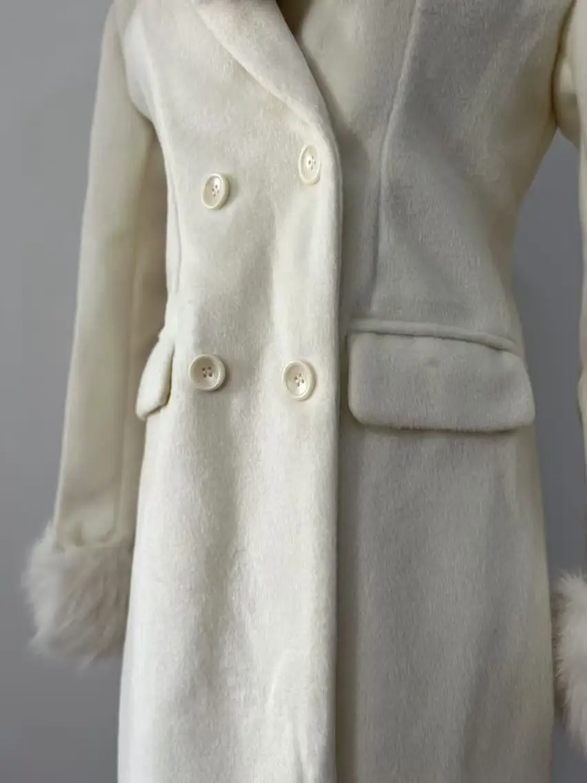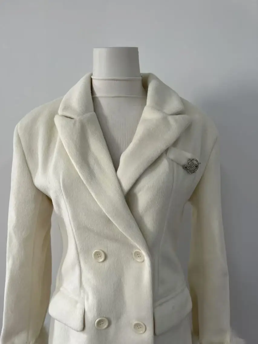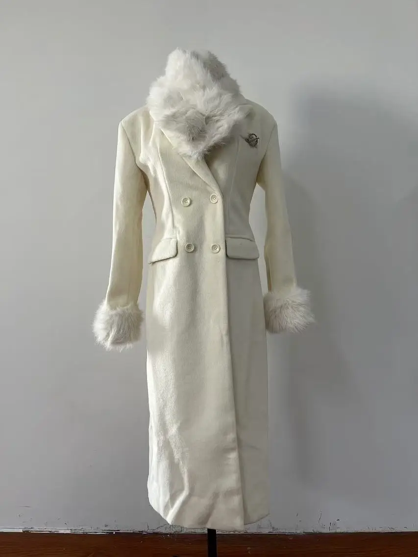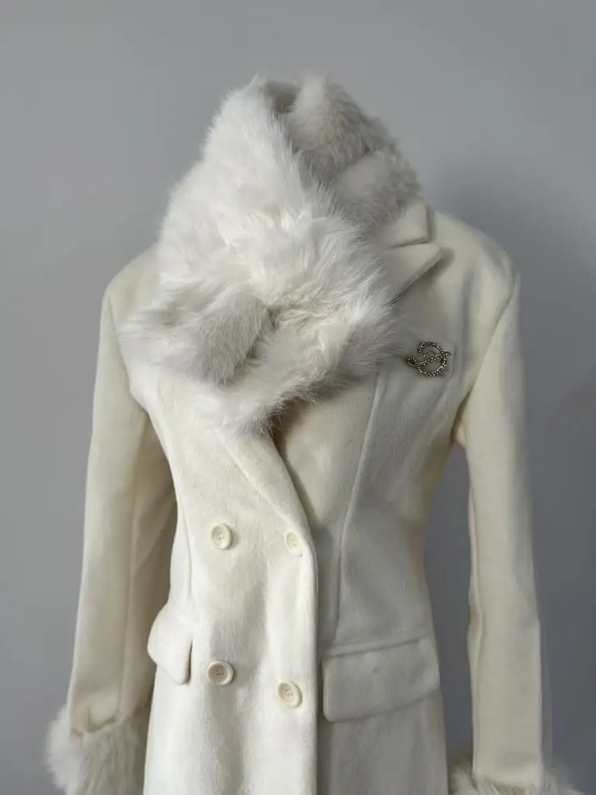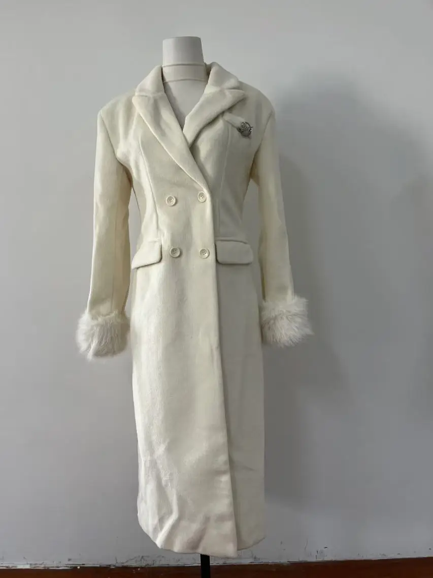 French Elegant Fall and Winter New Women Wool Blends Coats Fur Suit Collar Double Breasted High Waist Slim Long Sleeve Coat