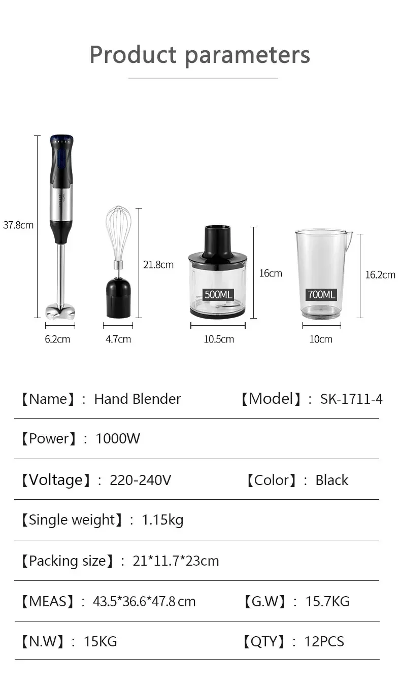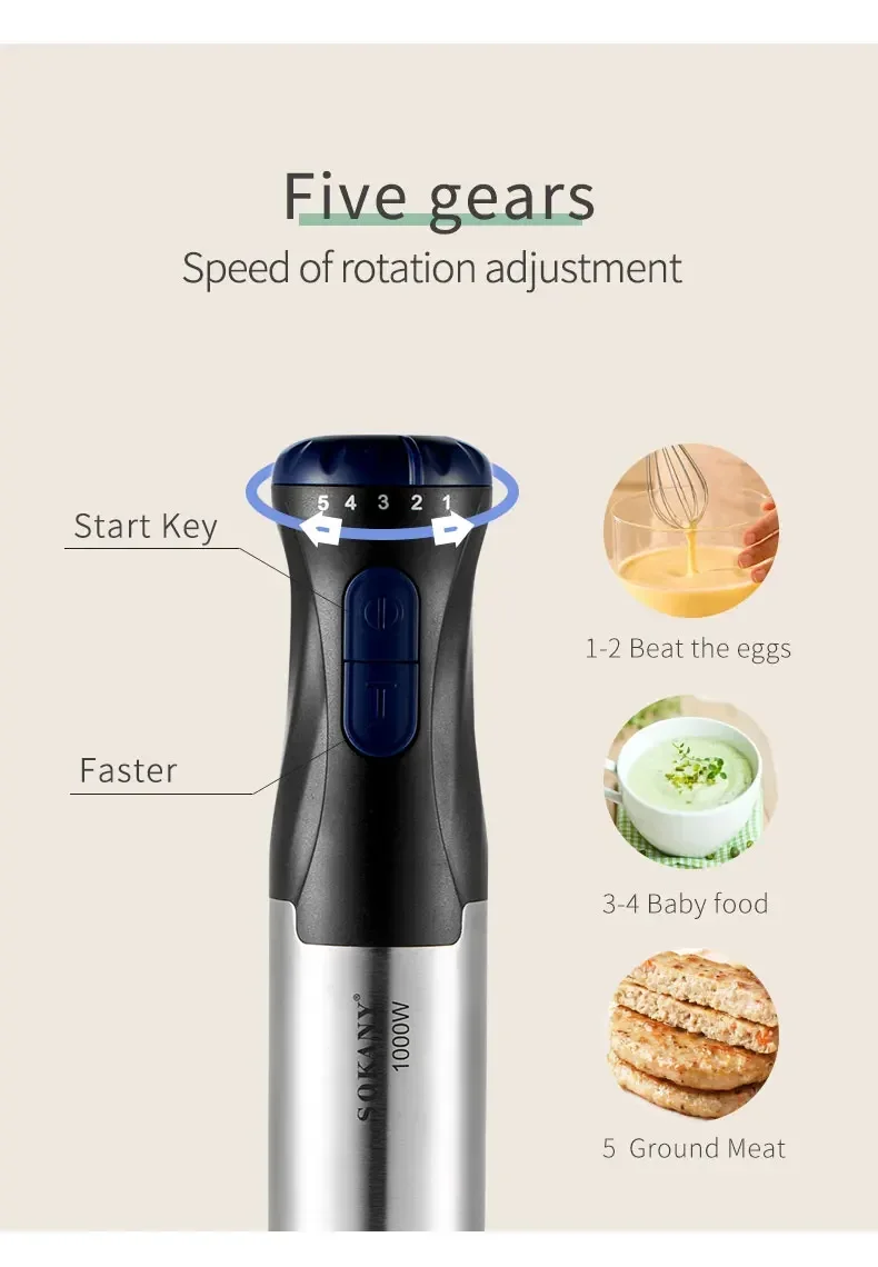 Frullatore ad immersione portatile 4 in 1, 1000 W Frullatore elettrico in acciaio a 5 velocità Gadget da cucina per alimenti per bambini, zuppe, tritare carne