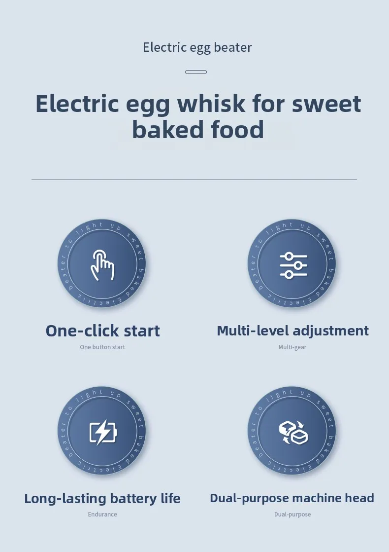 2.La sostituzione a doppia testa, veloce ed efficiente, può facilmente preparare tutti i tipi di dessert, utilizzata per rompere il liquido delle uova, caffè/albume/crema, burro/ghiaccio, mescolare e mescolare la pastella, condimenti per insalata, marmellata, preparare integratori alimentari per bambini, succhi di frutta, frappè e altri ingredienti liquidi o semiliquidi.