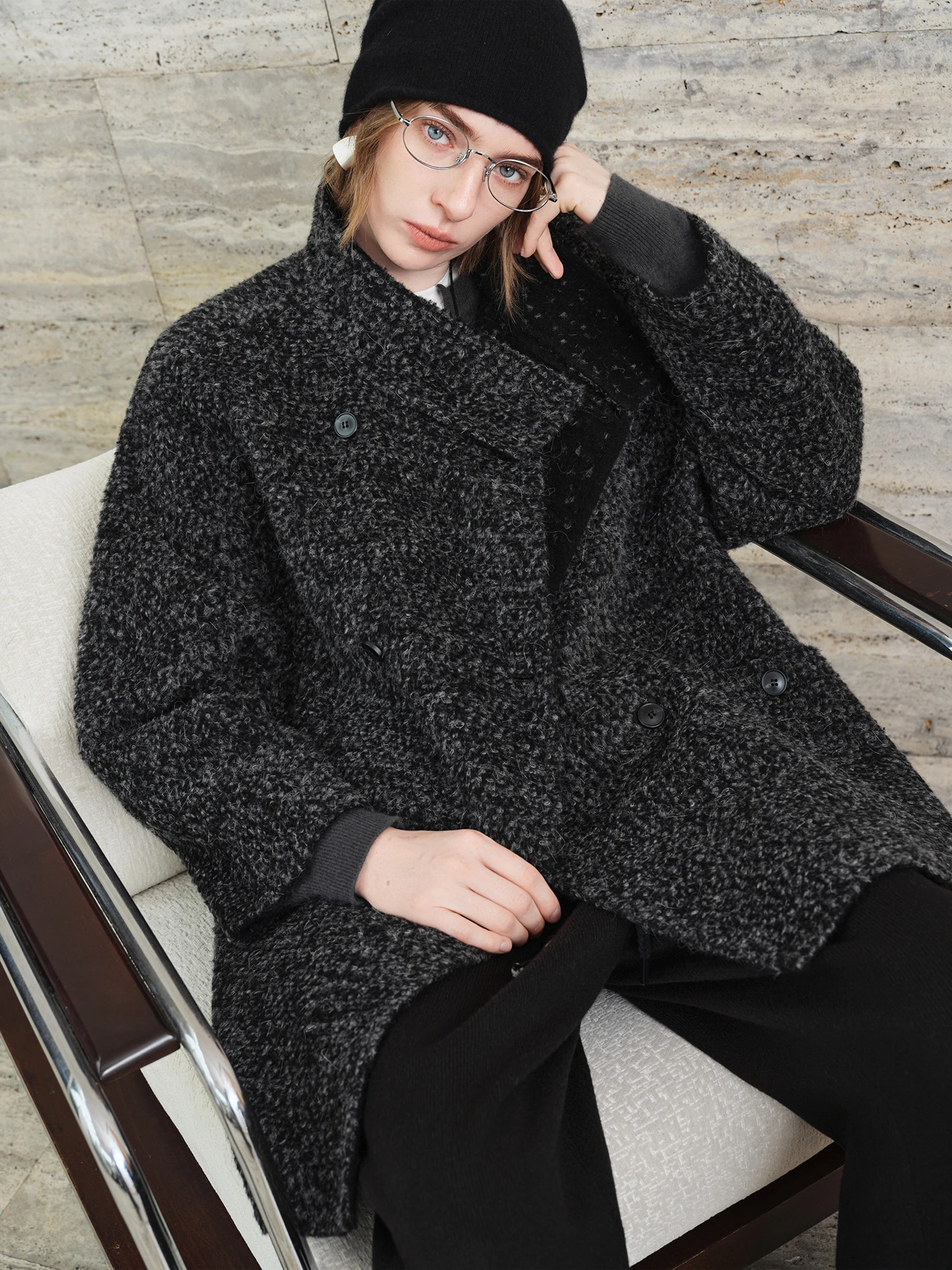 FSLE【Serie Premium】 Soprabito da donna in misto lana con collo alto e motivo tweed – Elegante cappotto lungo invernale per business casual