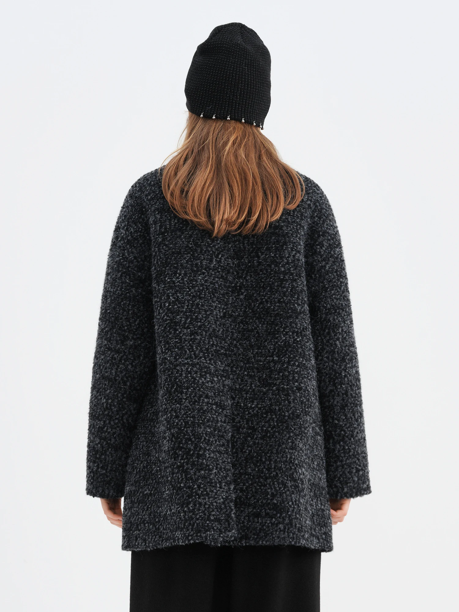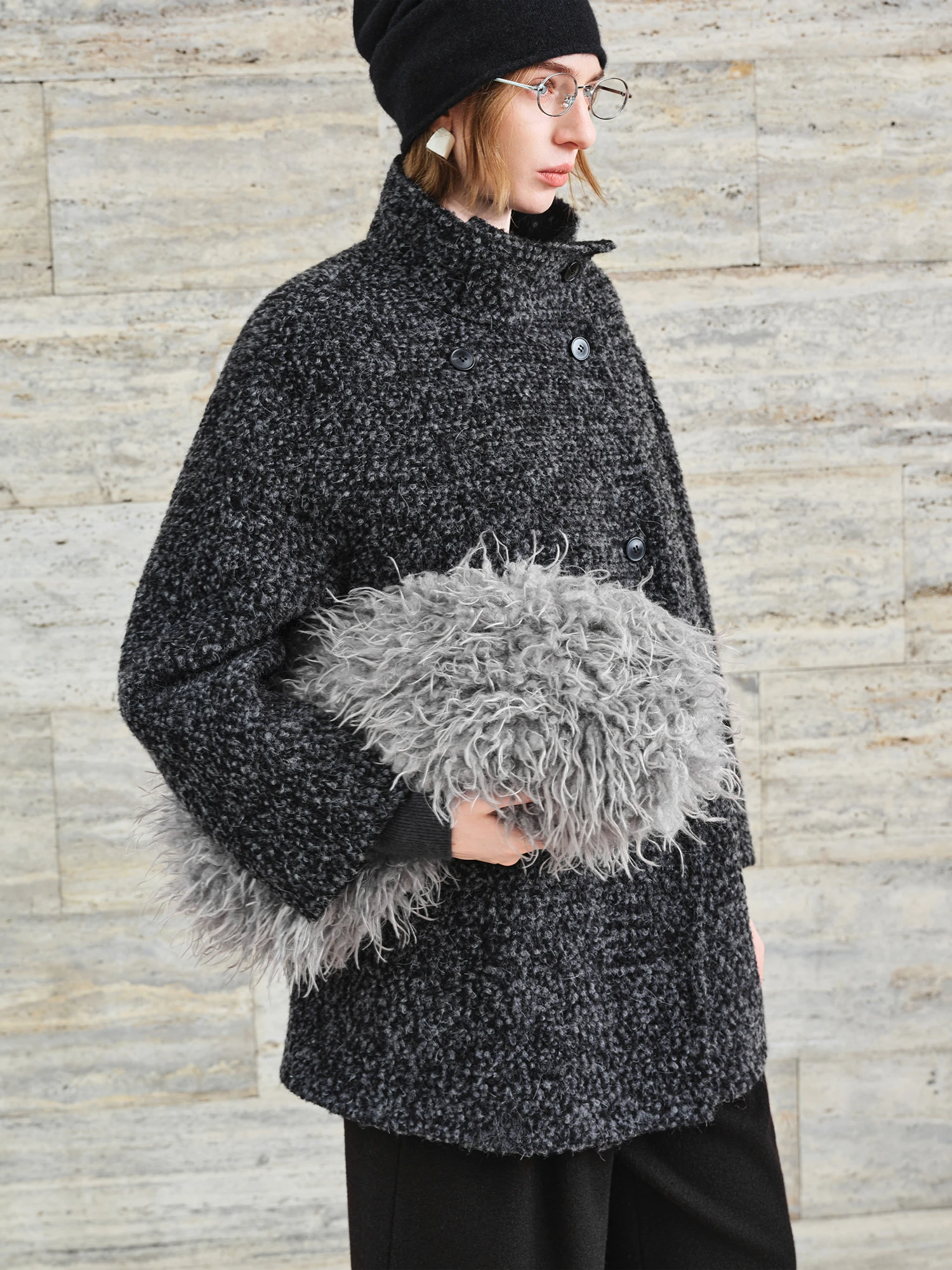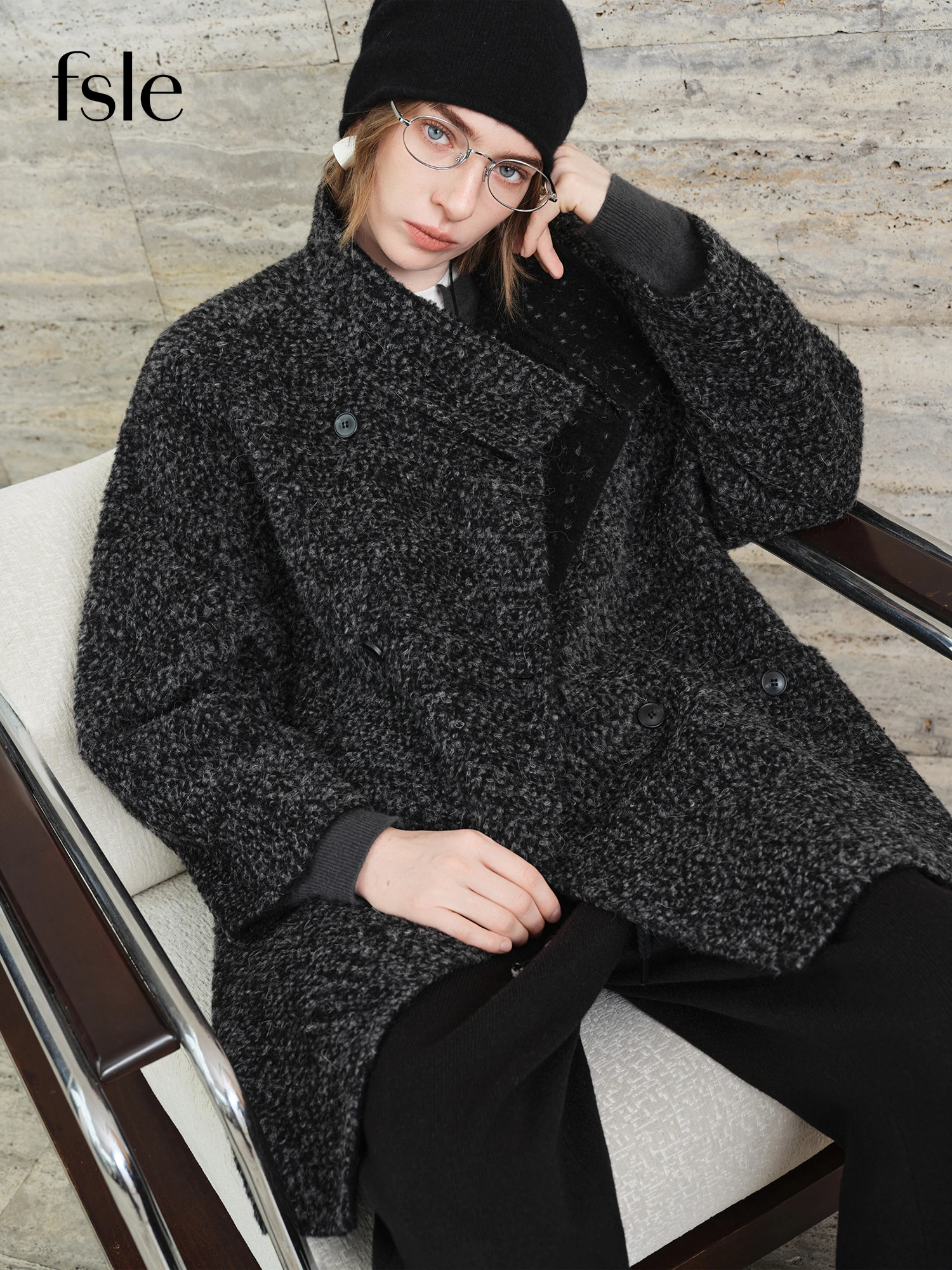 FSLE【Serie Premium】 Soprabito da donna in misto lana con collo alto e motivo tweed – Elegante cappotto lungo invernale per business casual