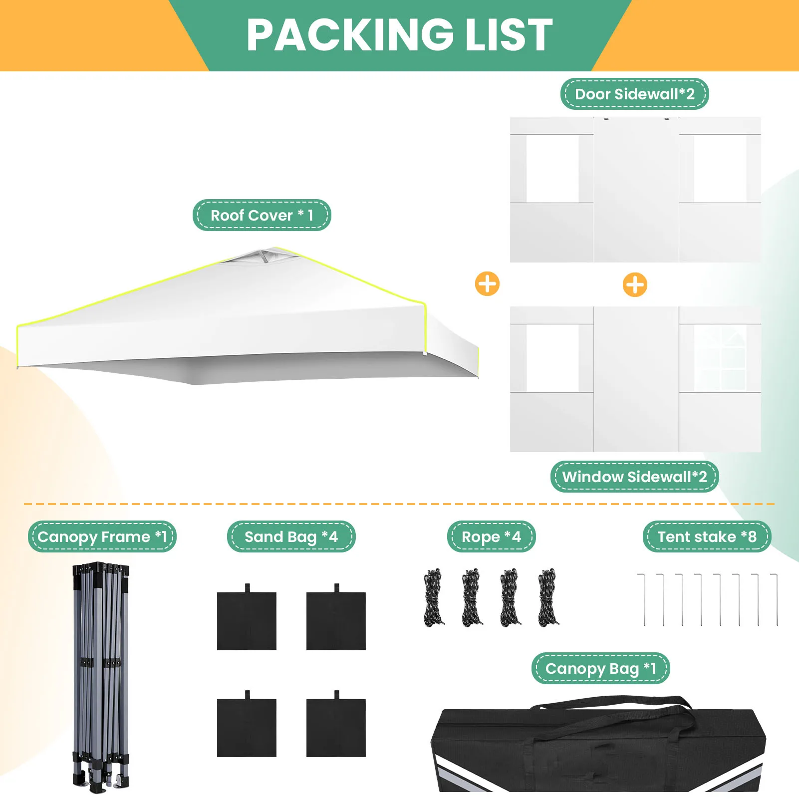 Elenco imballaggi: la tenda da festa 3 x 3 confezioni contiene 1 x manuale, 1 x telaio pop-up, 1 x superficie gazebo da giardino Oxford rinforzata 210D, 1 borsa da trasporto in tessuto Oxford 600D, 1 x pareti laterali con cerniera bifacciale, 3 pareti con finestre, 4 x corde, 8 x picchetti di sabbia.