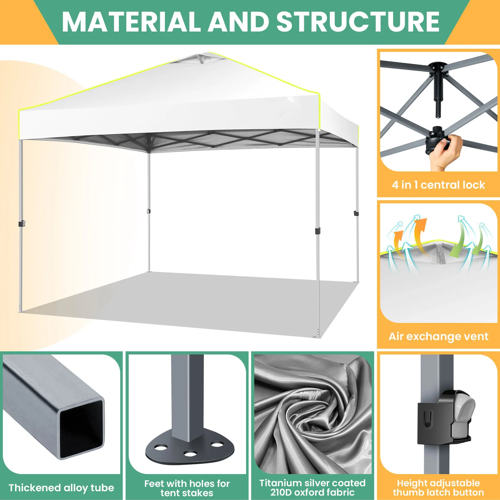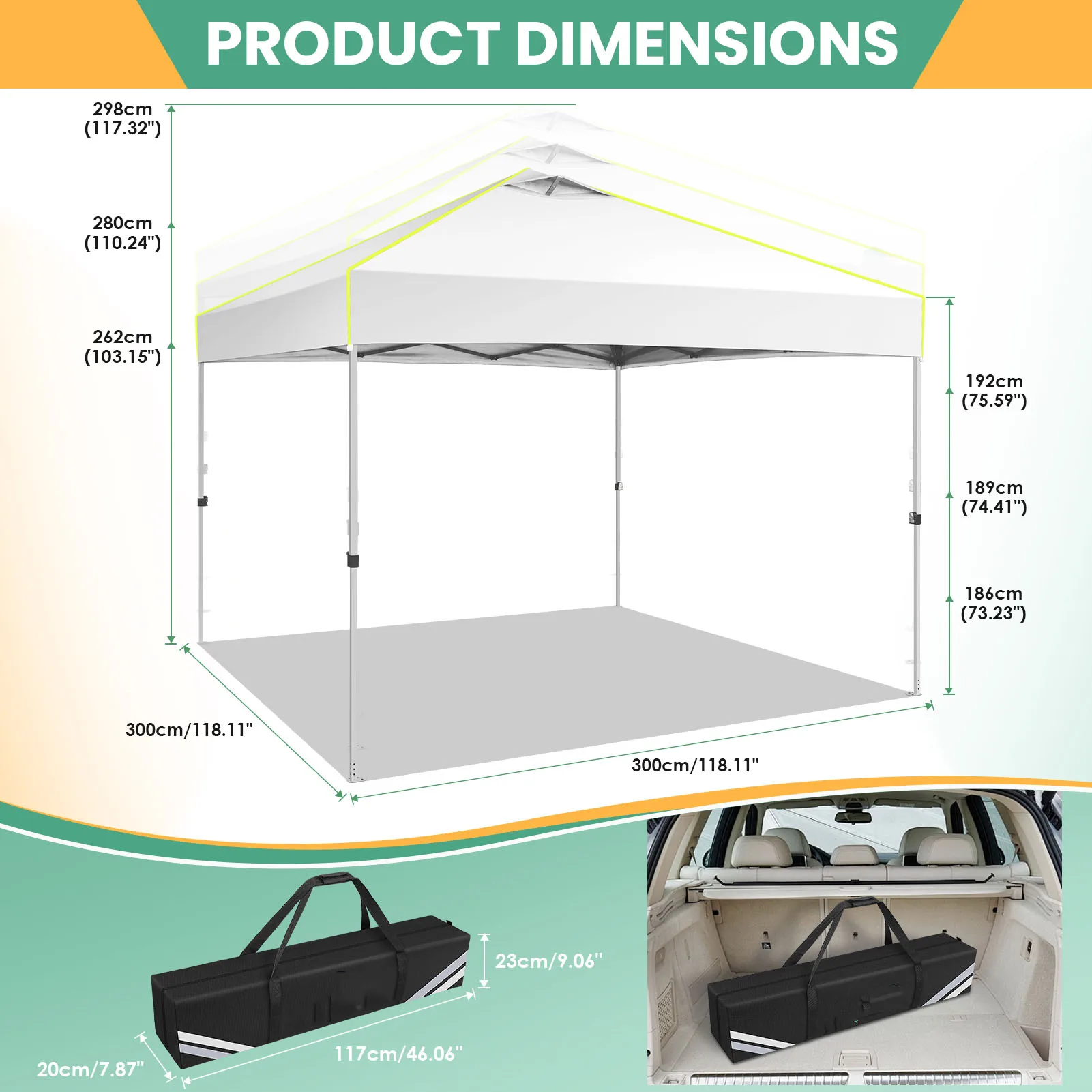 Tecnologia di bloccaggio della pressione centrale, altezza regolabile: gazebo 3 x 3 impermeabile stabile resistente all’inverno spinge semplicemente il pulsante centrale fino a completare l’installazione.Le gambe del gazebo pop-up hanno pulsanti anti-pinza per la regolazione dell’altezza: 262,2 cm, 280,2 cm e 298,2 cm.