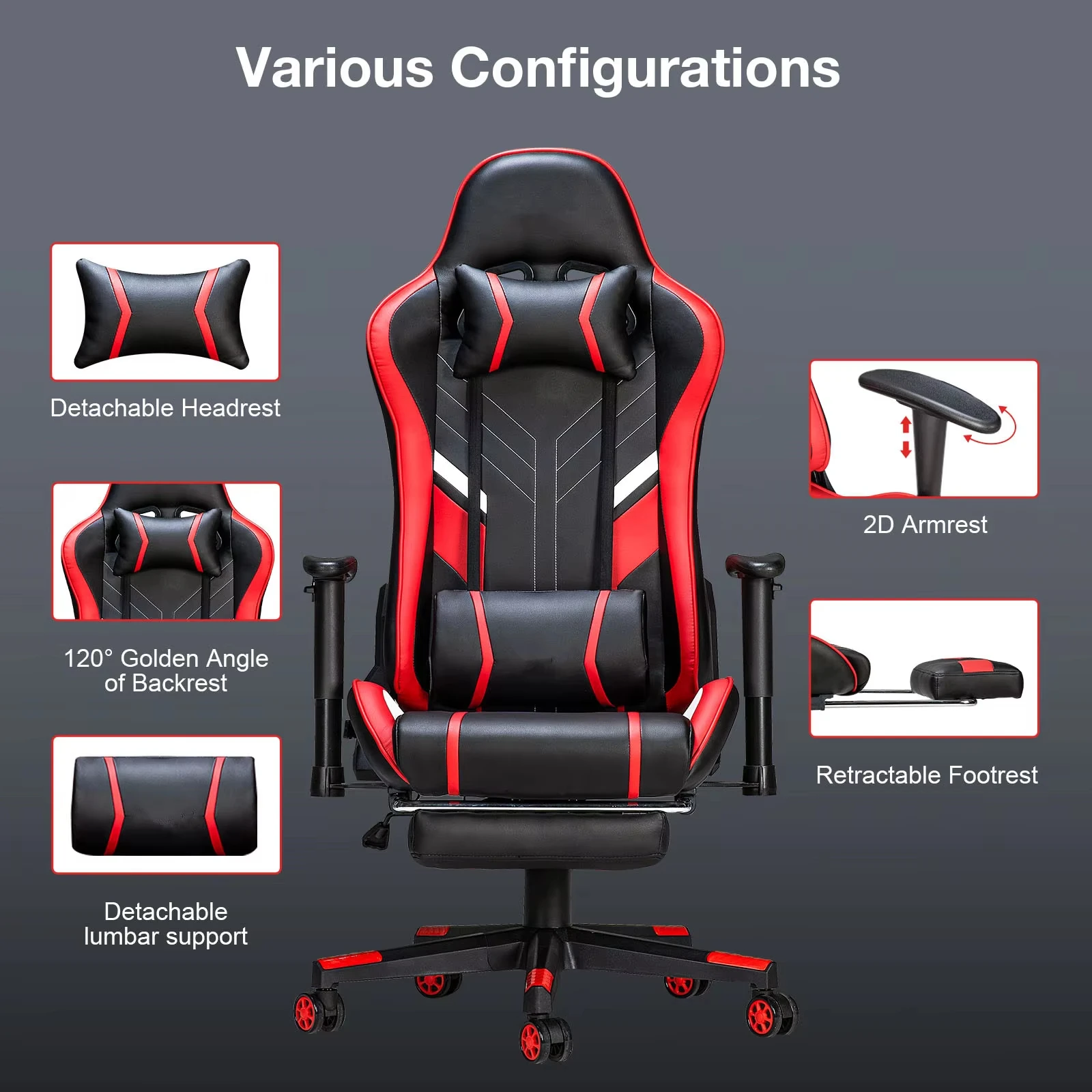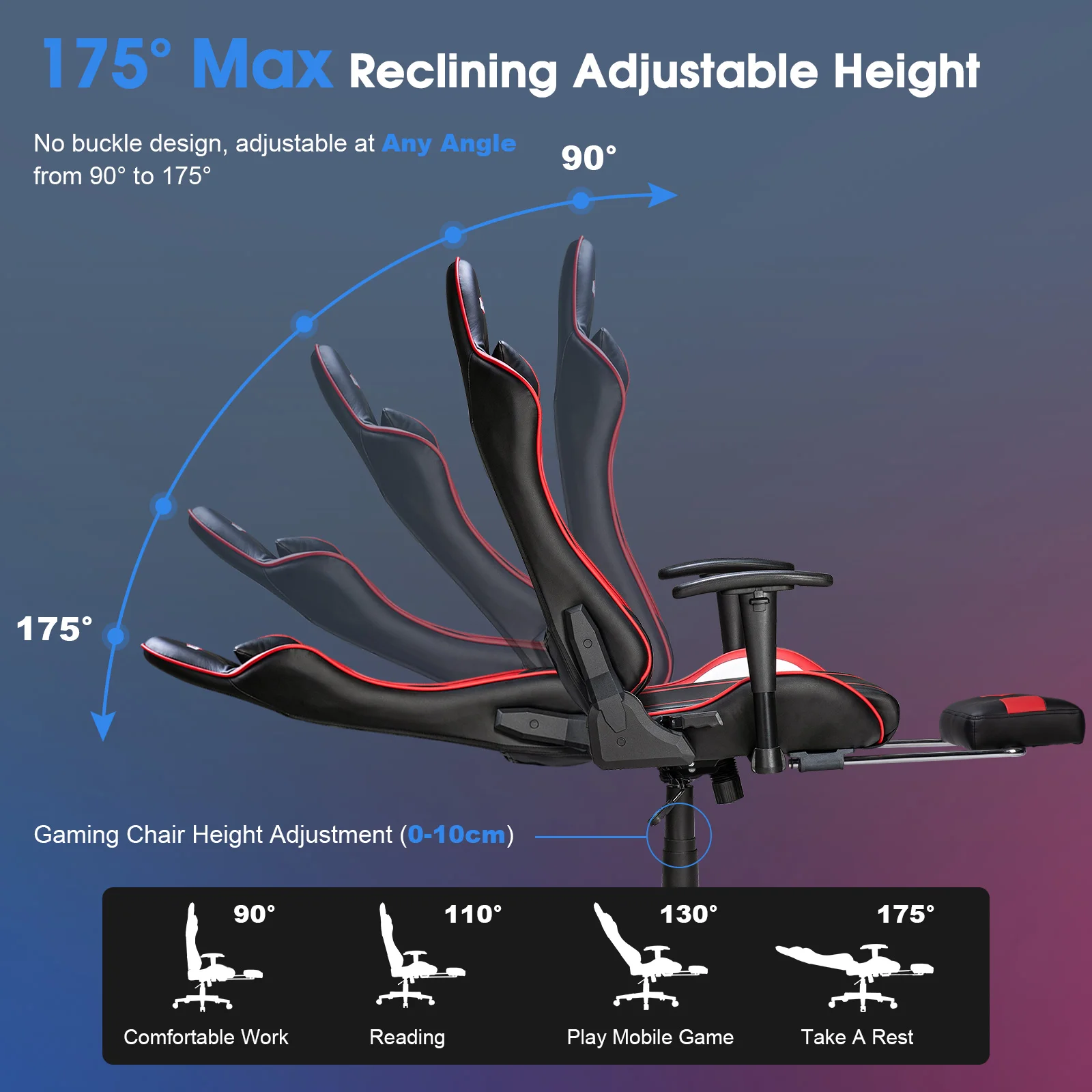 [MULTIFUNZIONI] Questa è una sedia da gioco con poggiapiedi e una sedia da gioco con funzione di massaggio.Design comodo ed ergonomico, il prodotto ha le caratteristiche di rotazione di 360 gradi, altezza regolabile (10 cm), poggiapiedi retrattile, poggiatesta regolabile, regolazione dell’angolazione (massimo 175°), meccanismo di inclinazione. Questa sedia reclinabile può fornire l’esperienza più confortevole sia che venga utilizzata in ufficio o nel gioco e raddoppiare la tua efficienza.