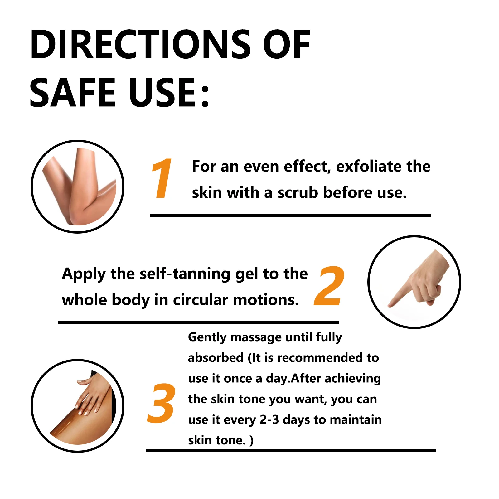 1.Per un effetto uniforme, esfolia la pelle con un scrub prima dell’uso.