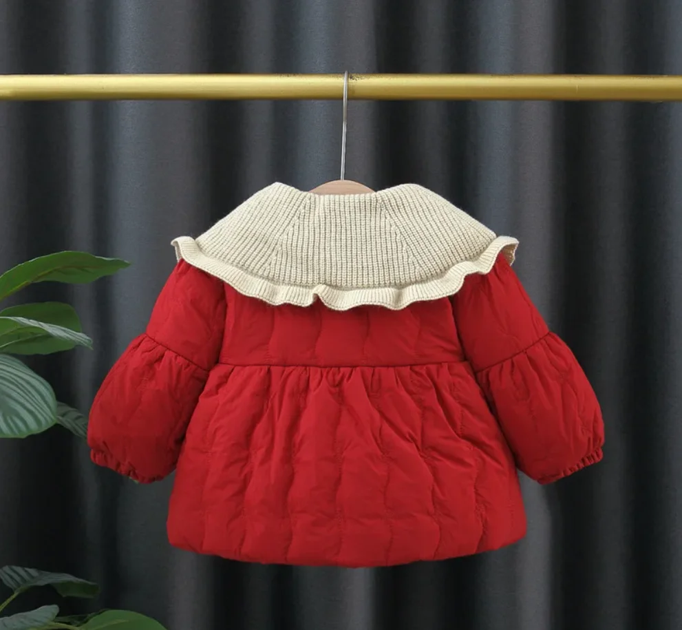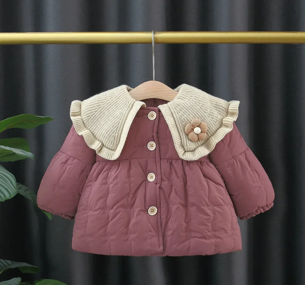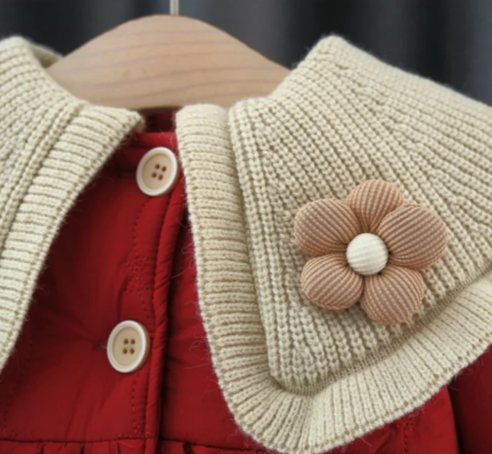 Giacca da bambina invernale foderata in pile color block colletto con bottoni floreali top da bambino carino caldo cappotto da ragazza ispessito abbigliamento per bambini