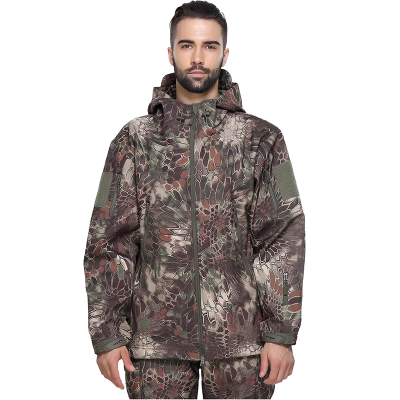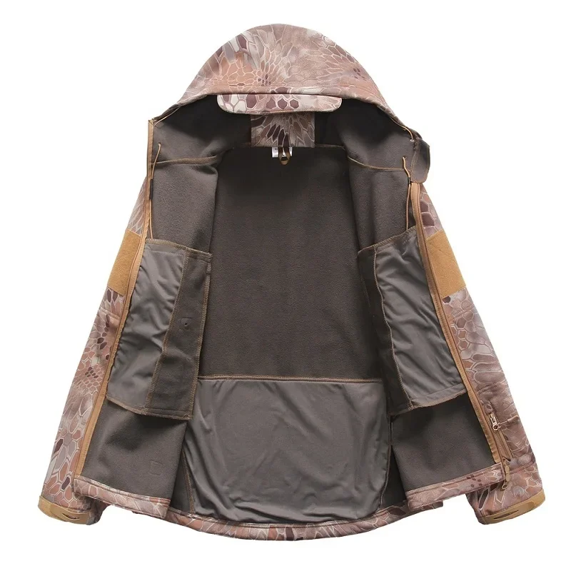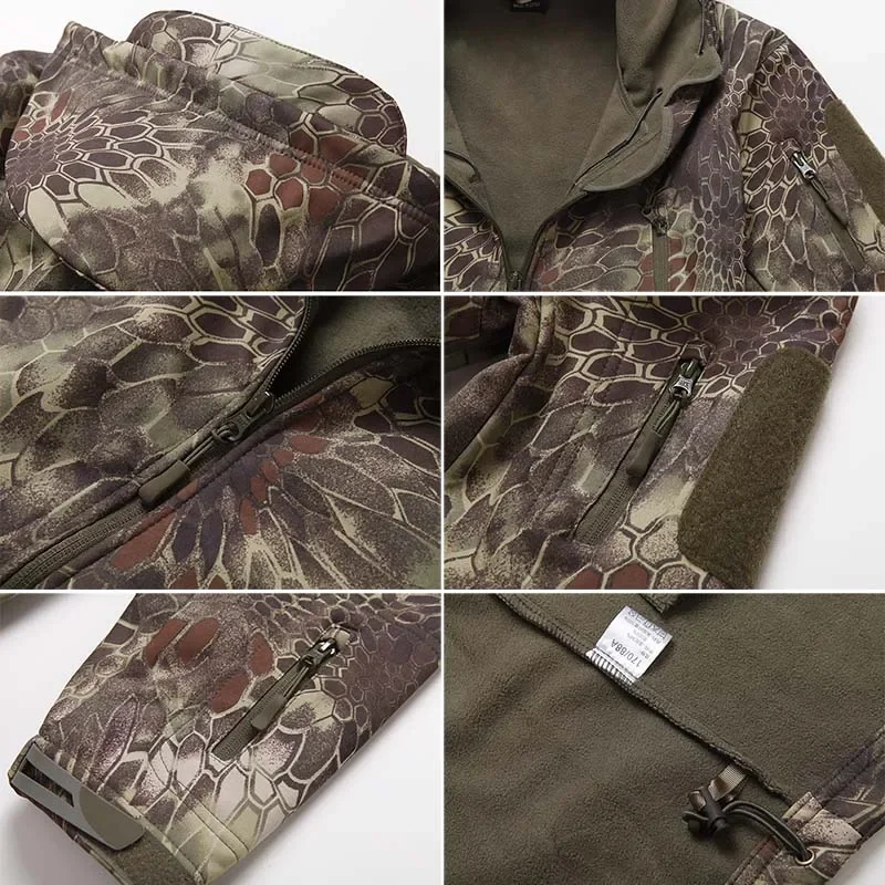Jacket Type: Softshell Tactical Camouflage JacketMaterial: 94% Polyester + 6% SpandexFeature: Waterproof, Windproof, Thermal, Soft Shell, Camouflage, Quiet for huntingOccasions: Great for outdoor sport, tactical,, hunting, fishing, hiking, camping, climbing and casual wear.