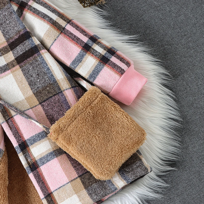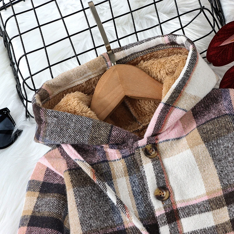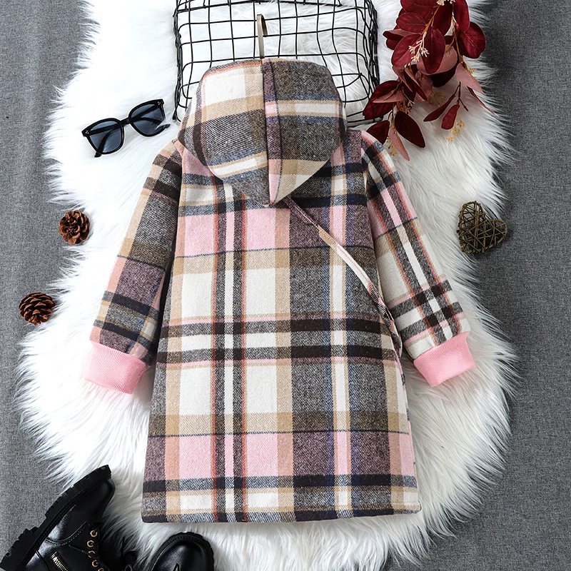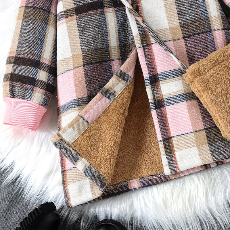 Giacca da ragazza di media lunghezza calda ispessita autunno e inverno Giacca con cappuccio in pile con bottoni scozzesi e borsa a tracolla