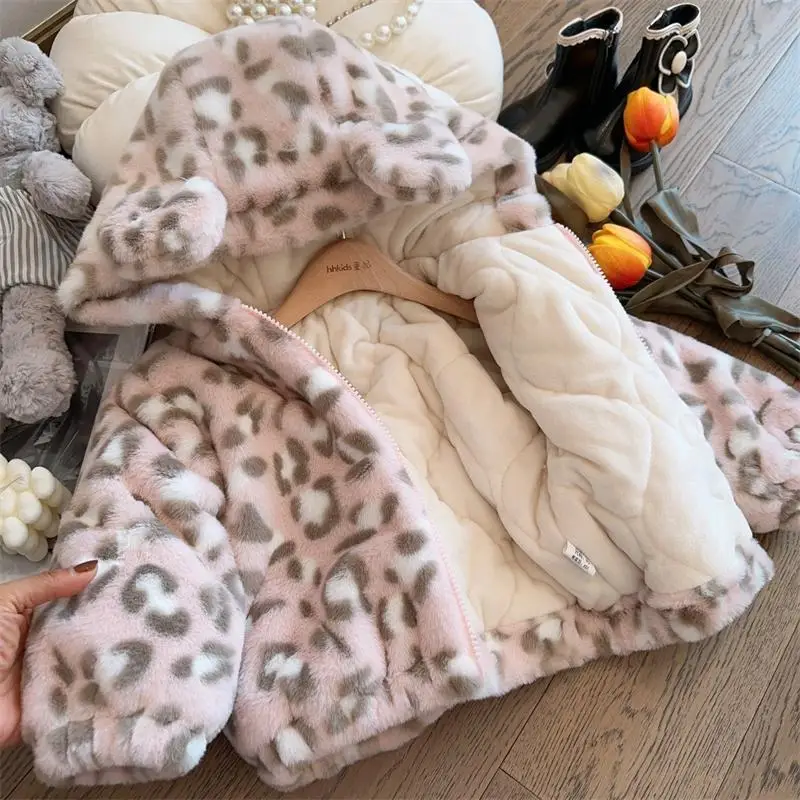 Giacca da ragazza in pelliccia sintetica invernale nuova stampa leopardata in pile double face spesso caldo cappotto con cerniera con cappuccio per 2-8 anni tuta da neve moda per bambini 1Giacca da ragazza in pelliccia sintetica invernale nuova stampa leopardata in pile double face spesso caldo cappotto con cerniera con cappuccio per 2-8 anni tuta da neve moda per bambini