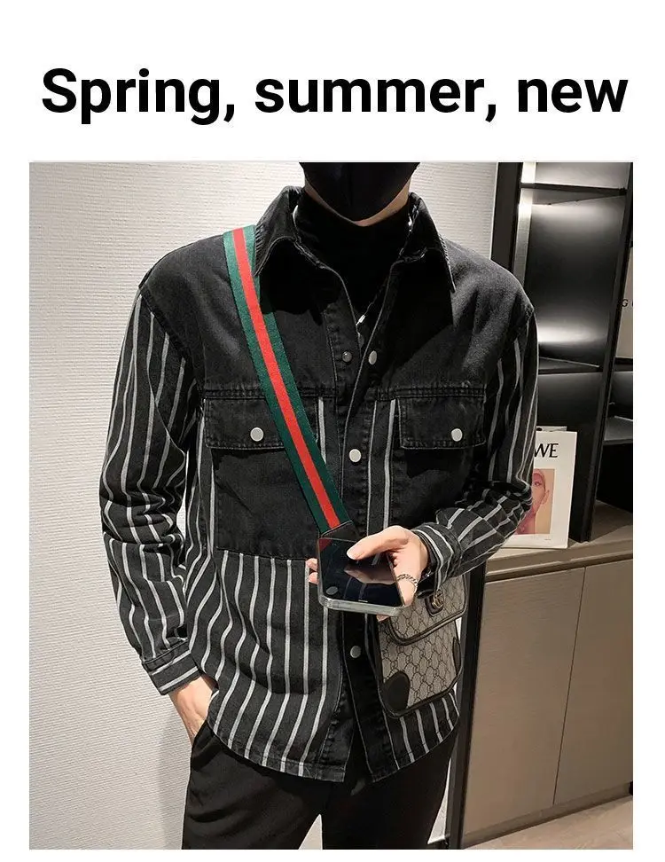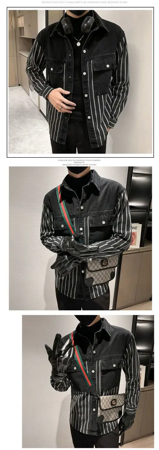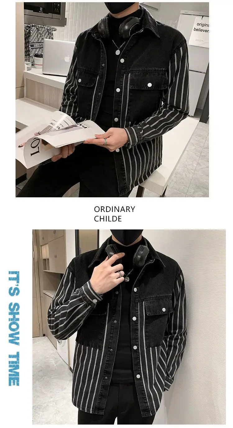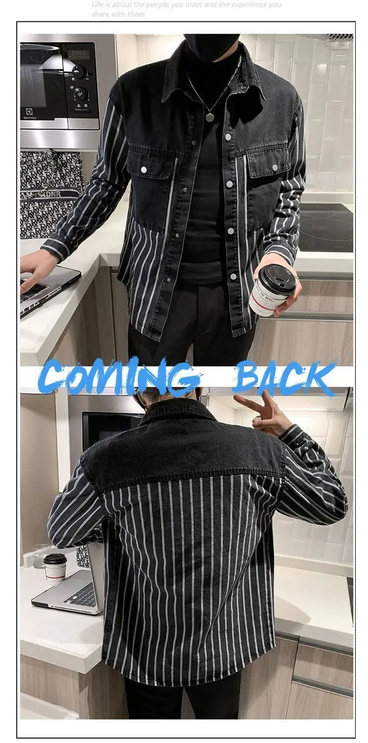 Giacca di jeans da uomo a maniche lunghe vestibilità ampia casual con cappotto patchwork a righe