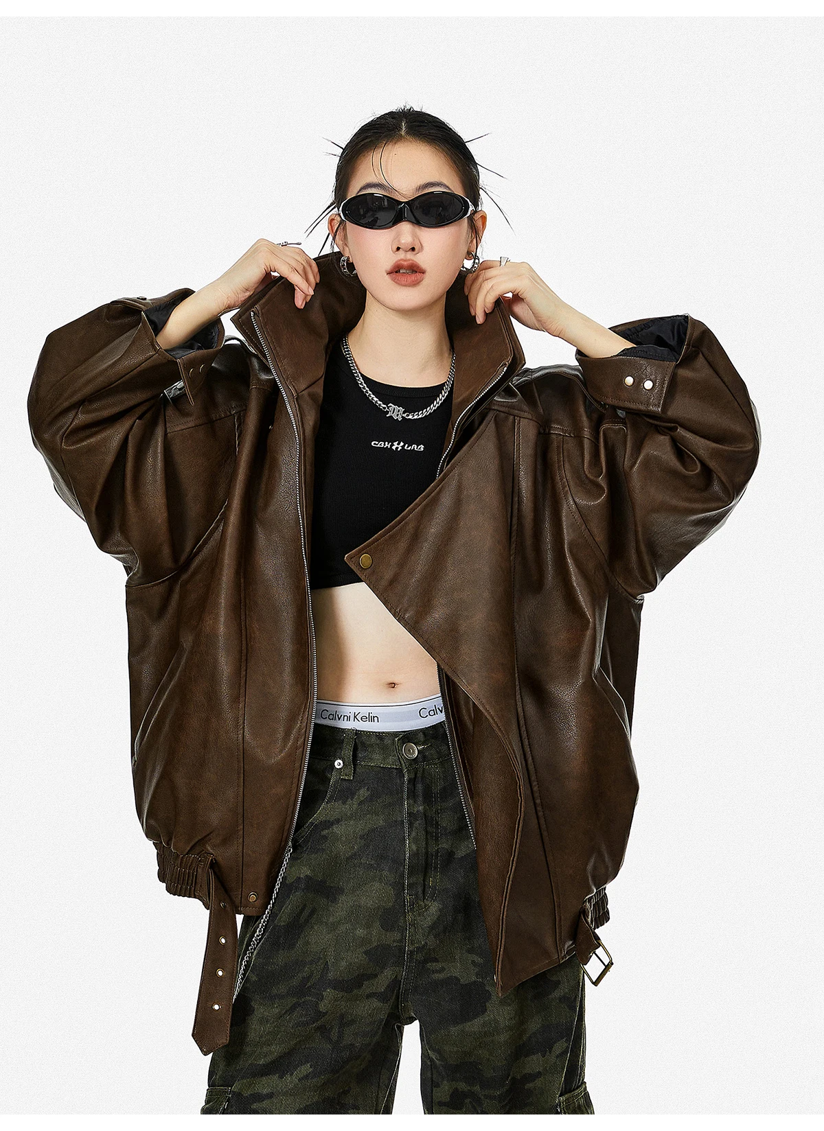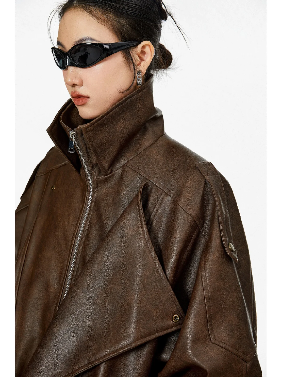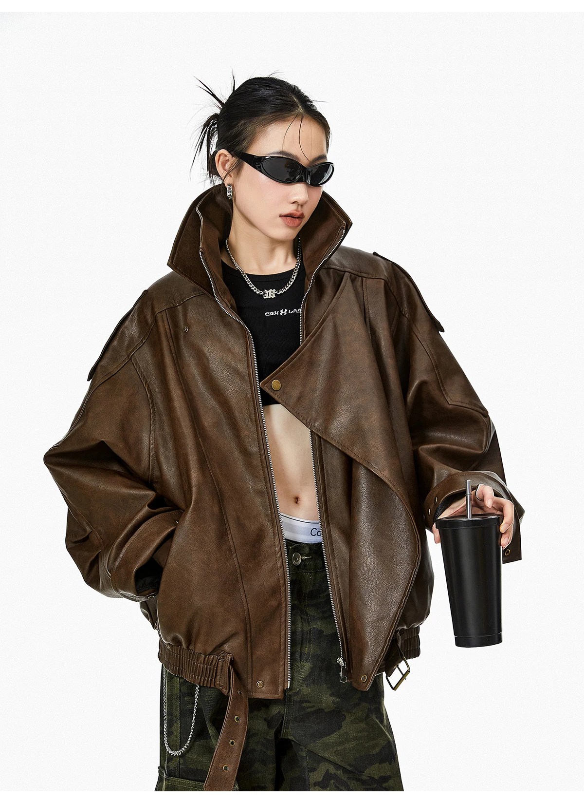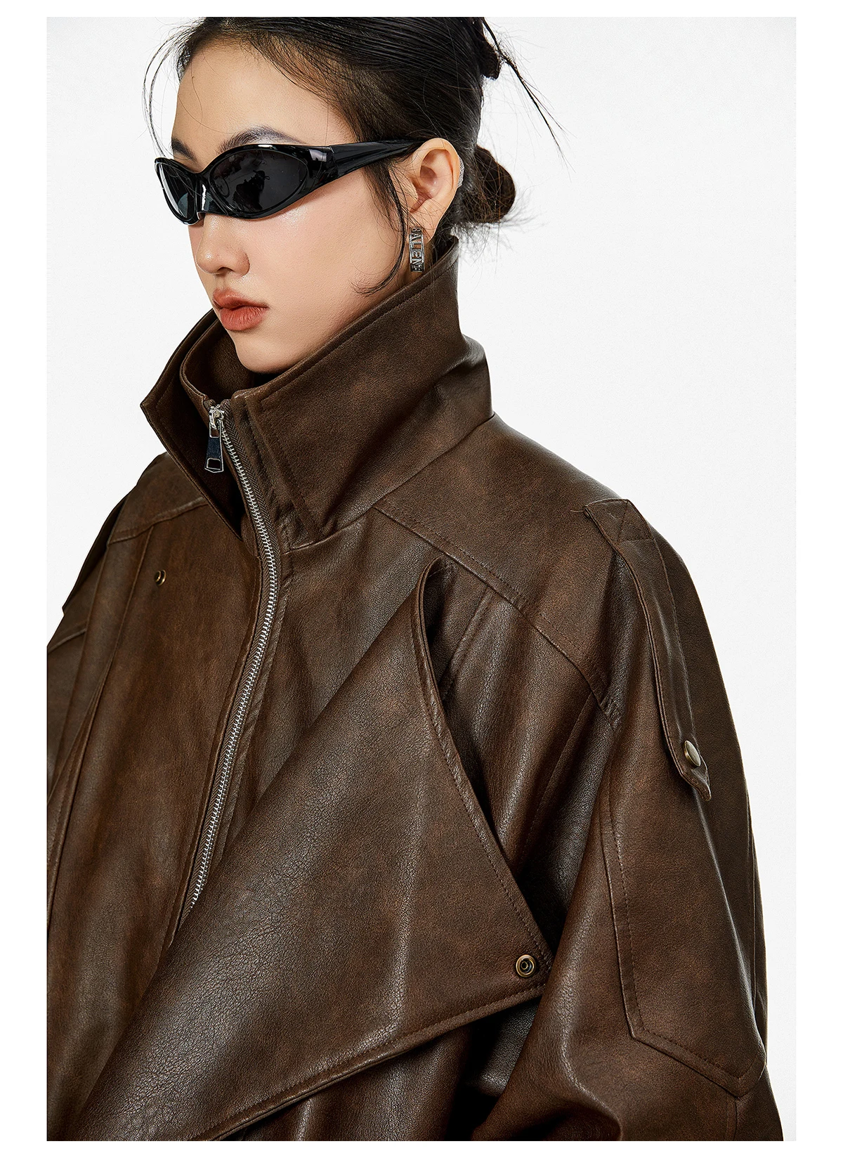 Giacca in pelle da donna Cappotto marrone retrò americano Autunno Inverno Nuova moda Versatile tinta unita Allentato Semplice design irregolare 1Giacca in pelle da donna Cappotto marrone retrò americano Autunno Inverno Nuova moda Versatile tinta unita Allentato Semplice design irregolare