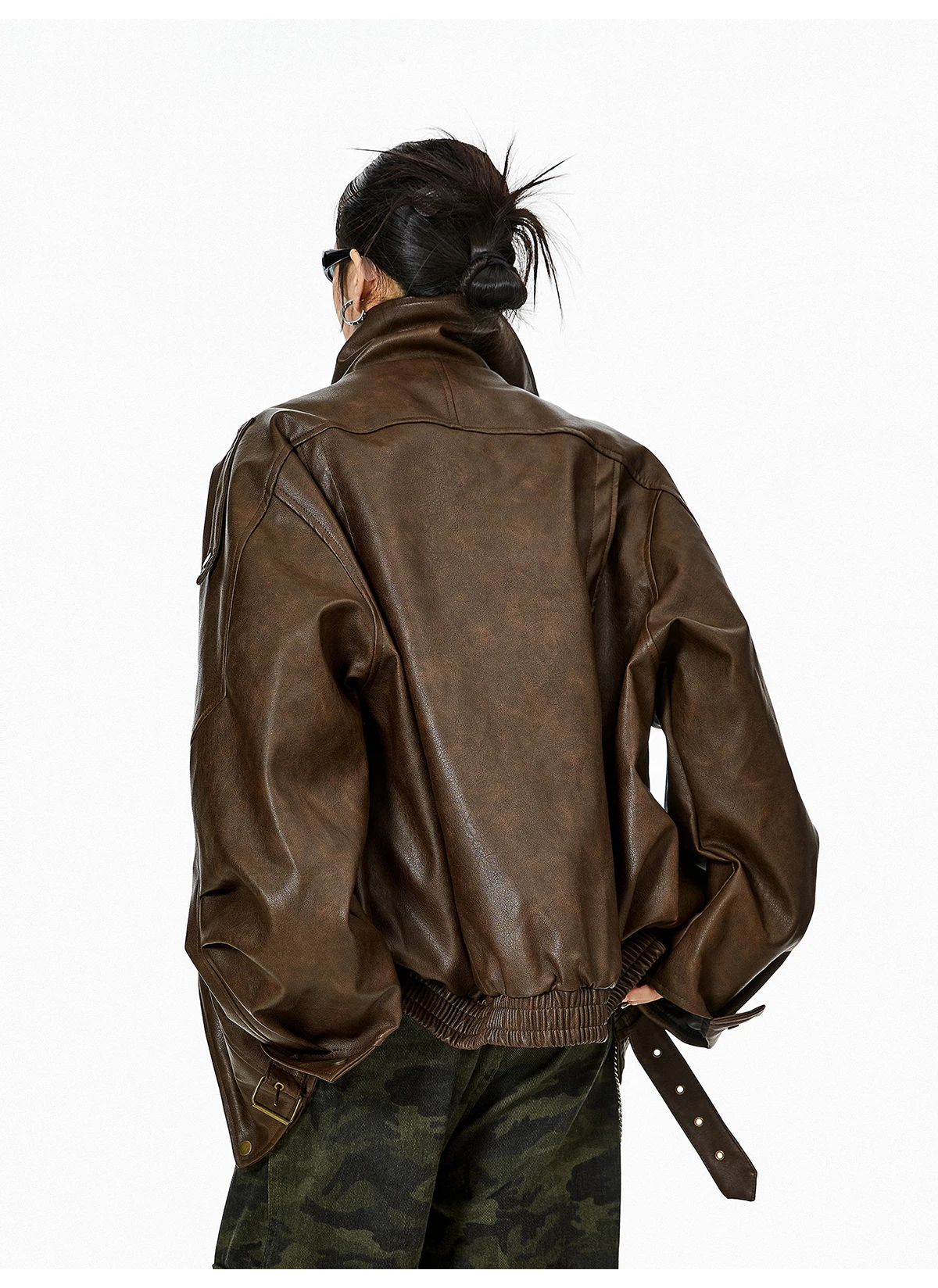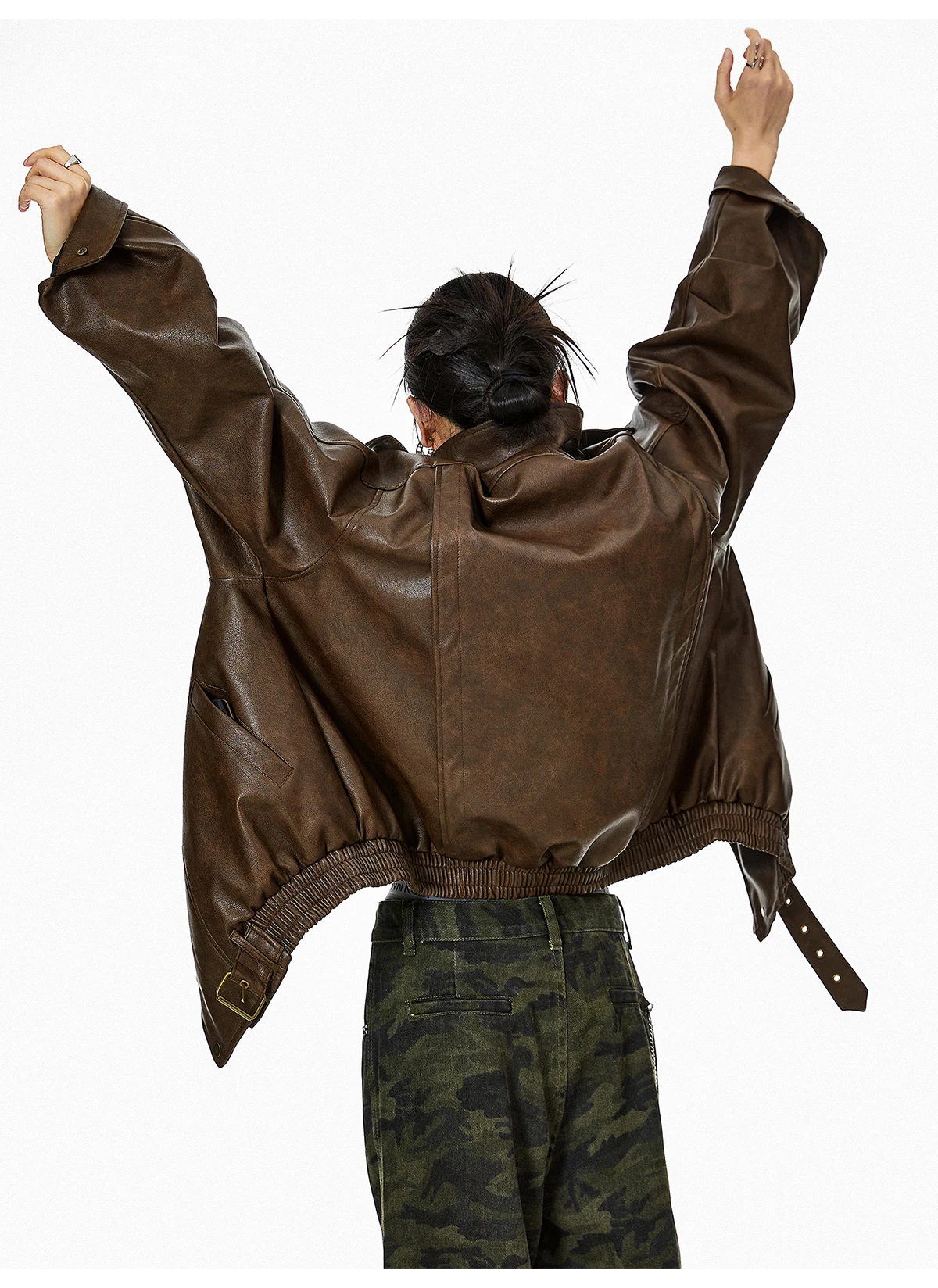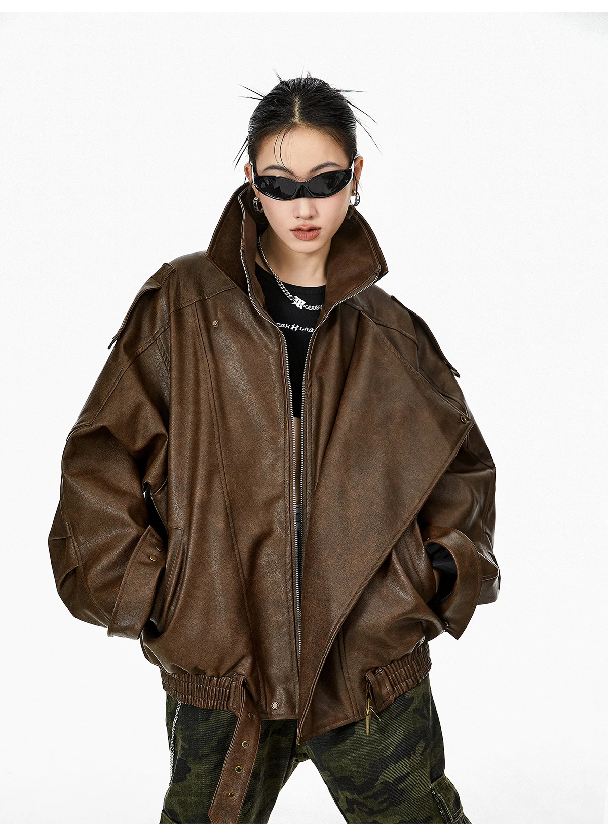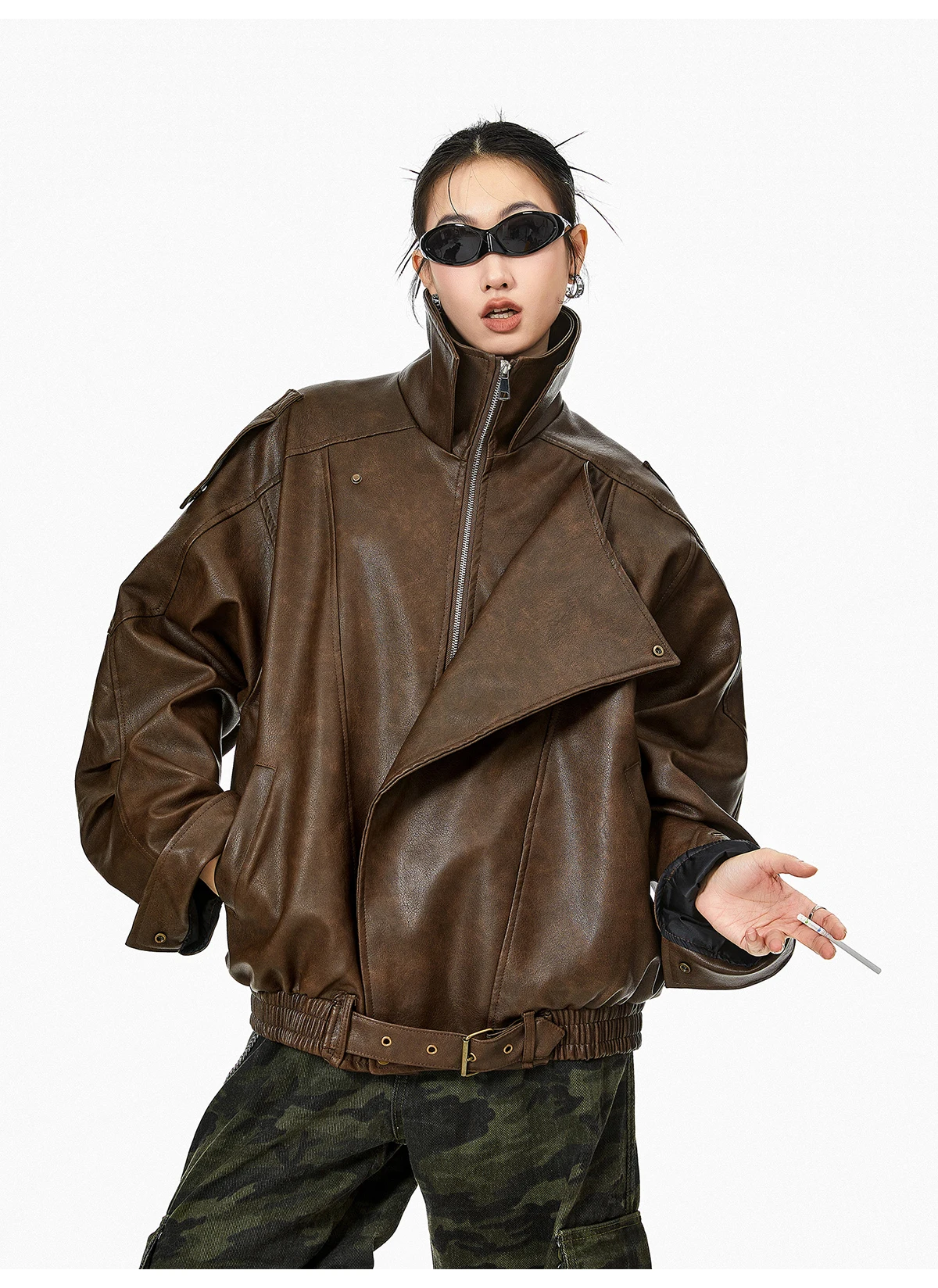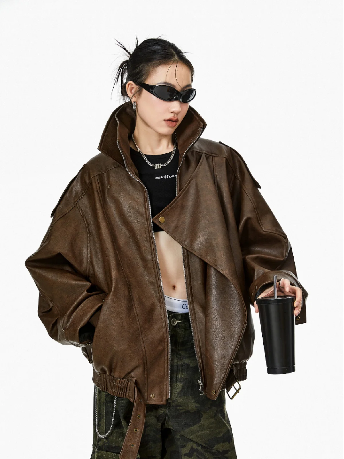 Giacca in pelle da donna Cappotto marrone retrò americano Autunno Inverno Nuova moda Versatile tinta unita Allentato Semplice design irregolare 1Giacca in pelle da donna Cappotto marrone retrò americano Autunno Inverno Nuova moda Versatile tinta unita Allentato Semplice design irregolare