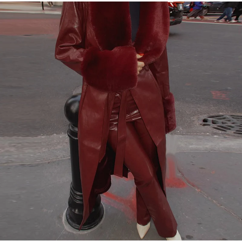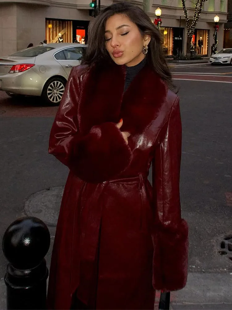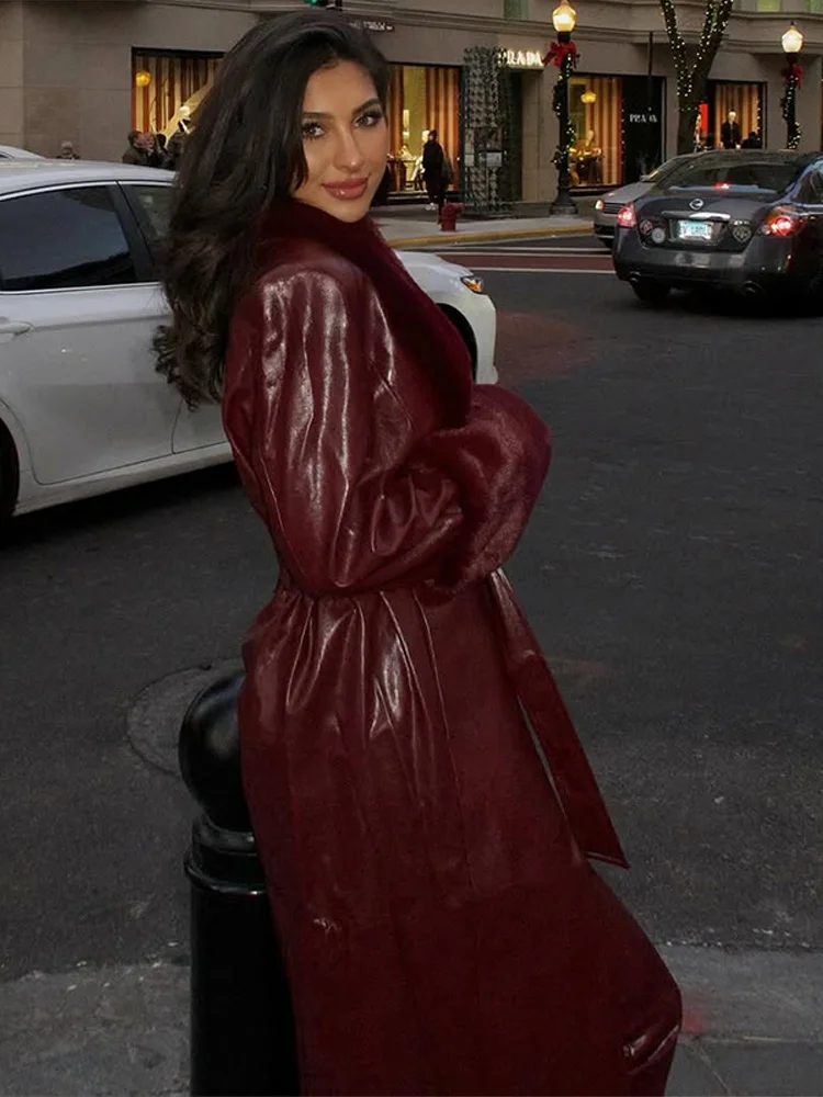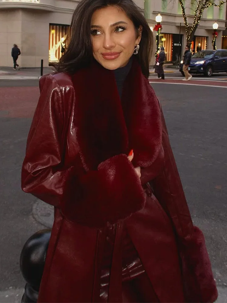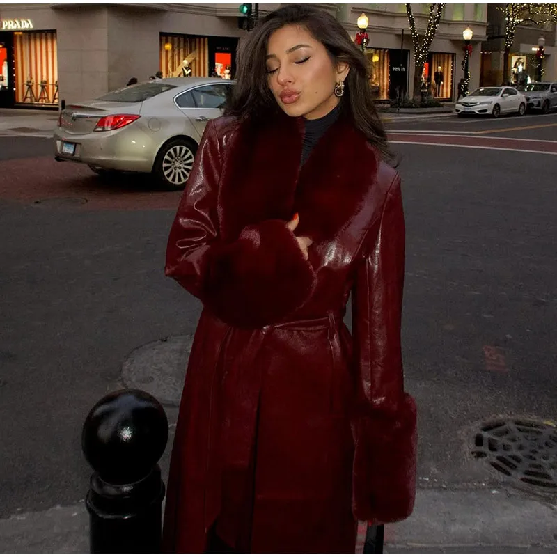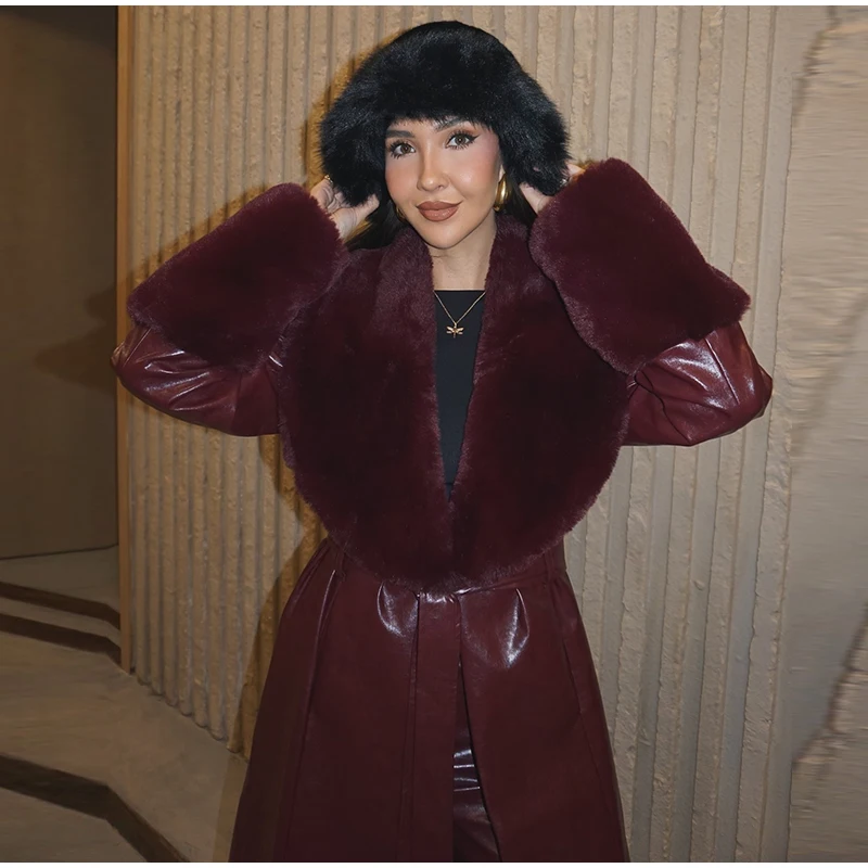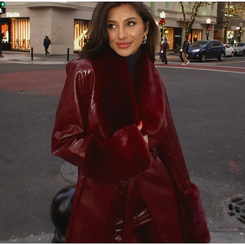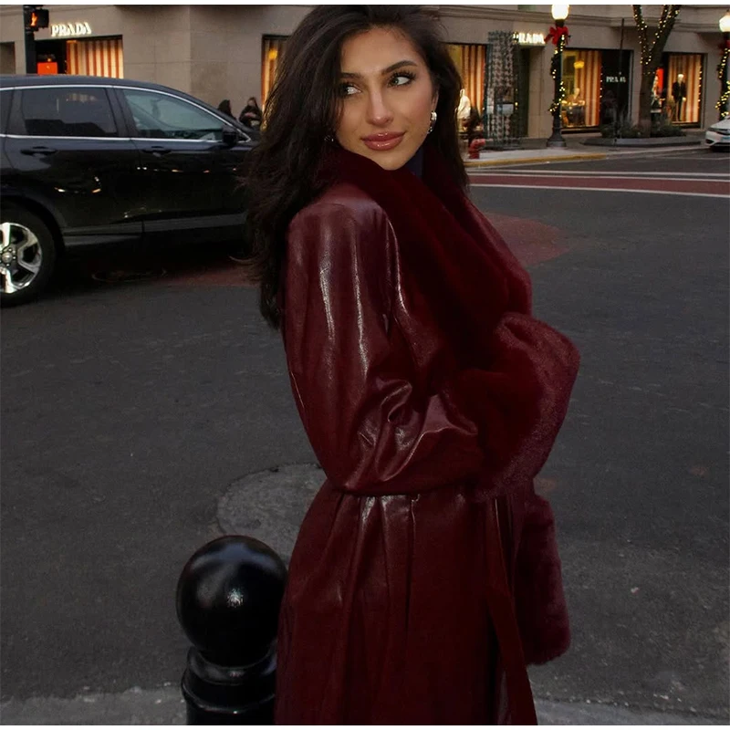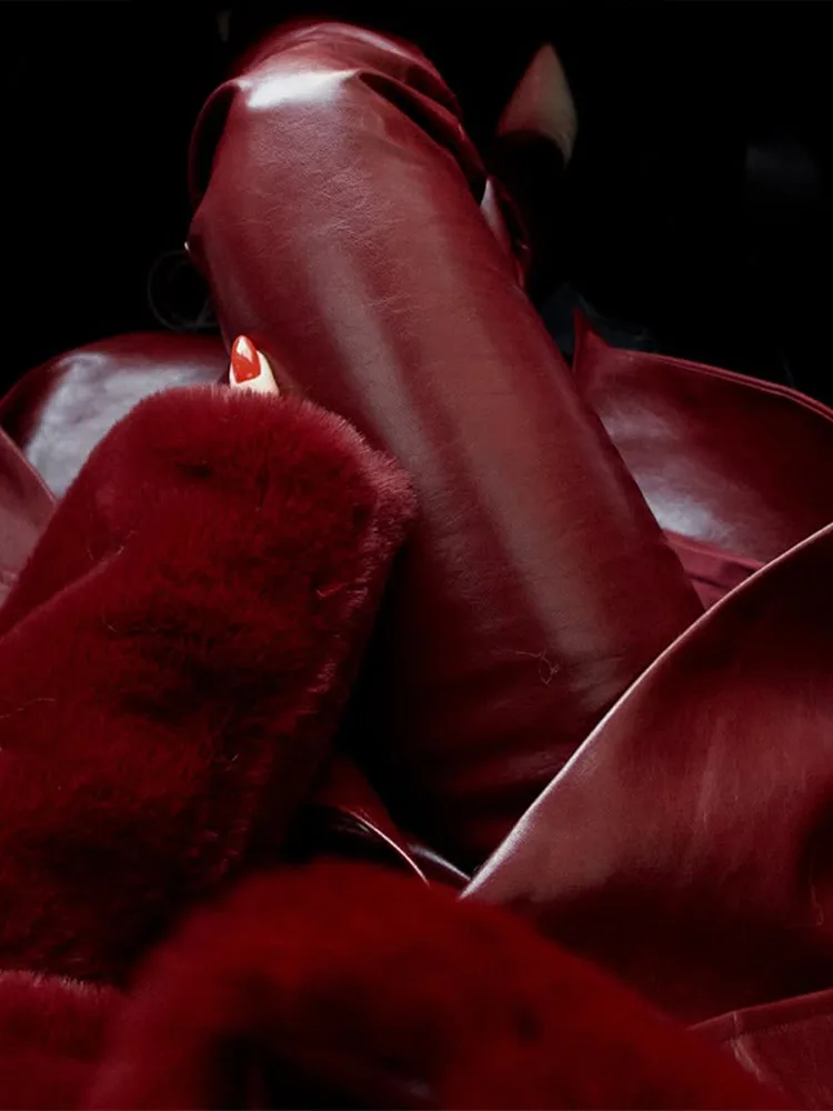 Un splendido cappotto in pelle bordeaux con finiture in finta pelliccia che combina lusso e stile, la tua via per realizzare una dichiarazione di moda audace negli mesi più freddi. ✨