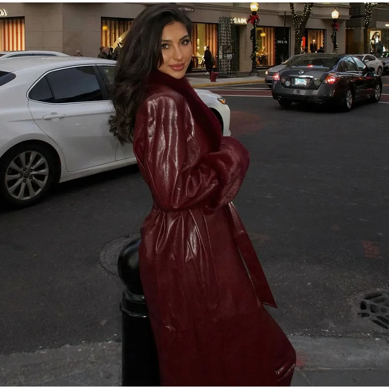 Questo cappotto presenta un ricco materiale in pelle bordeaux, complementato da un ampio collo e polsini in pelliccia sintetica, creando un look lussuoso e accattivante.Il design della vita con cintura accentata la figura, aggiunge un tocco di eleganza e femminilità.È un pezzo di dichiarazione perfetto per eventi formali o freddi: gite meteorologiche dove realizzando un’impressione è chiave.