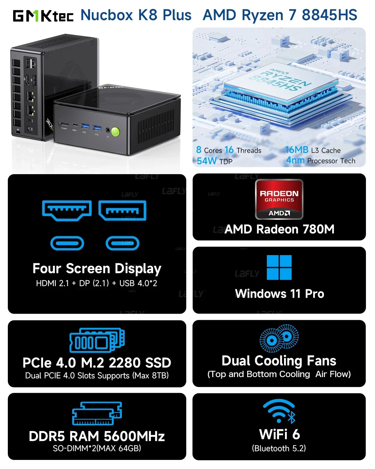 GMKtec-Mini PC K8 Plus Ryzen 7 8845HS, Ordinateur Gamer, Windows11Pro,DDR5, 5600Mhz,PCIe 4.0,Nvme, SSD, WiFi6, BT Stimule Mini PC