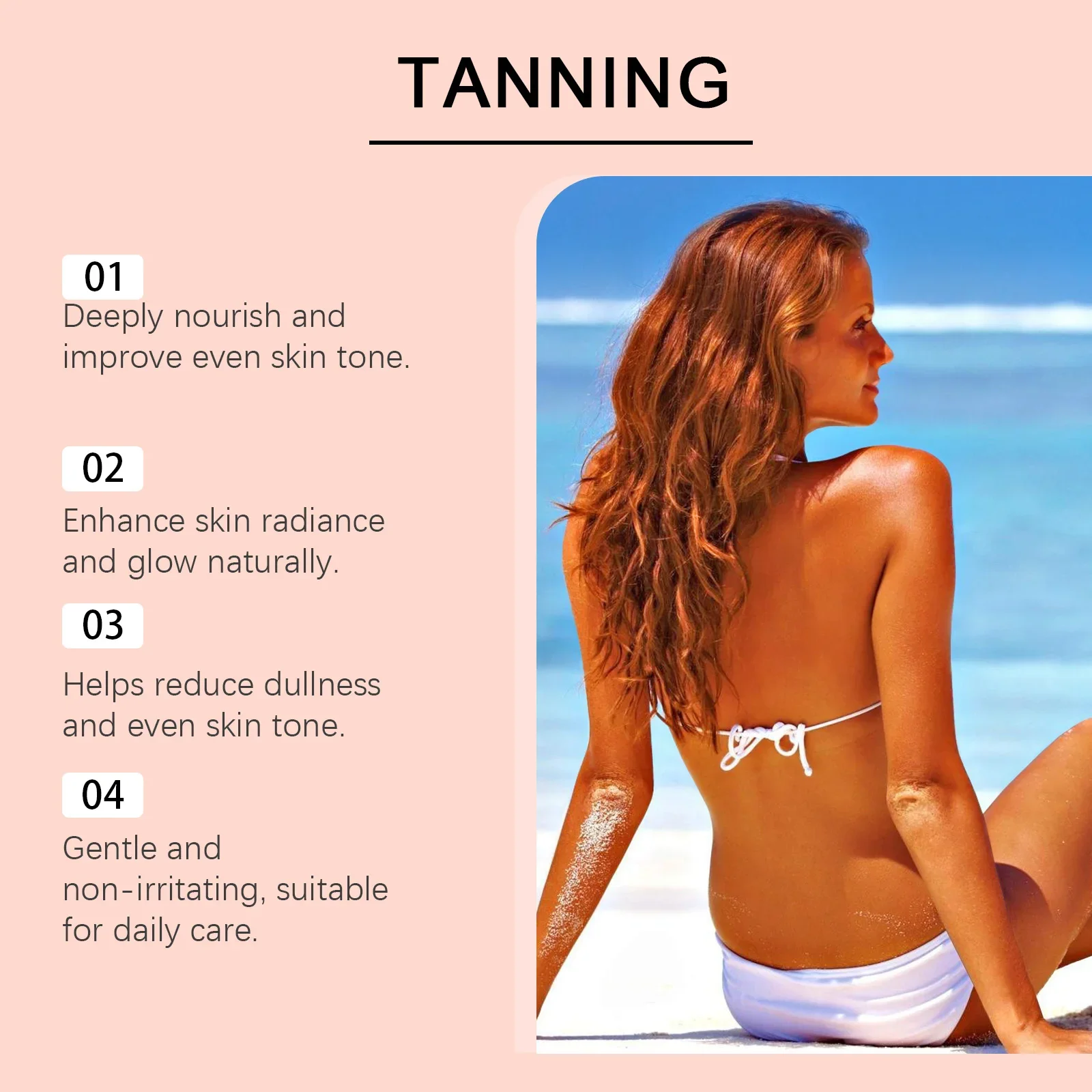 3.Non è necessario crogiolarsi al sole, si trasforma naturalmente in bronzato dopo l’uso.