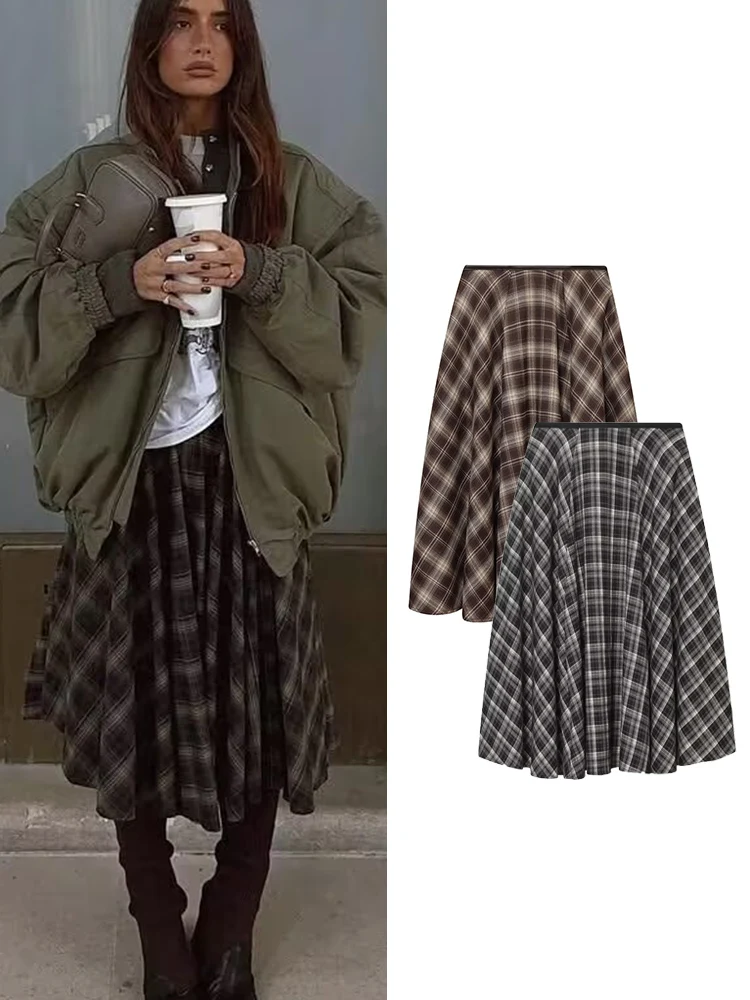 Gonna a ombrello scozzese retrò da donna nuova Gonna a trapezio autunno inverno con tasche Gonne di media lunghezza a vita alta da donna chic