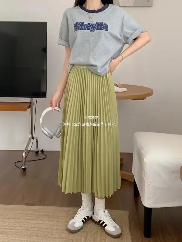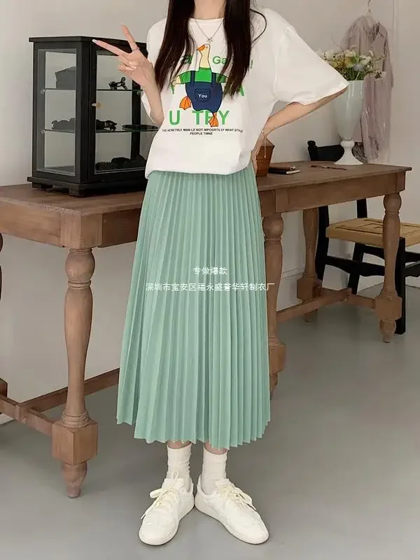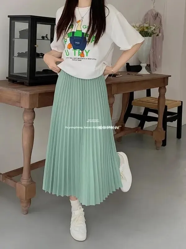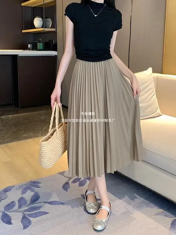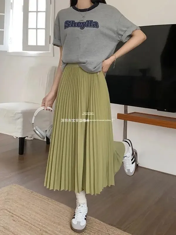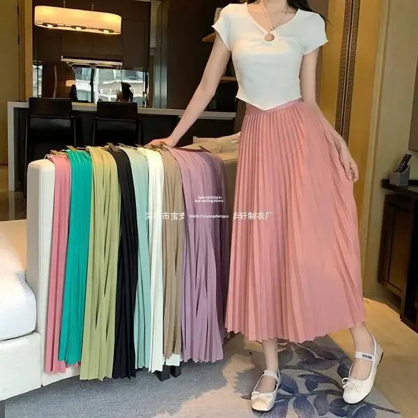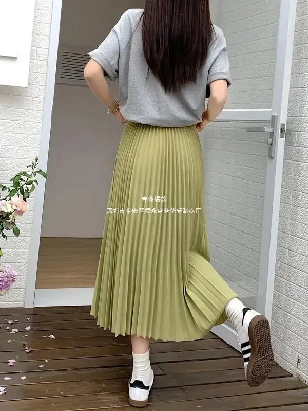 Gonna a pieghe di media lunghezza drappeggiata in tinta unita dimagrante a vita alta per le donne Gonna di media lunghezza multicolore di nuovo stile 1Gonna a pieghe di media lunghezza drappeggiata in tinta unita dimagrante a vita alta per le donne Gonna di media lunghezza multicolore di nuovo stile
