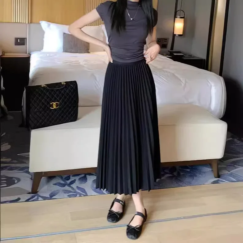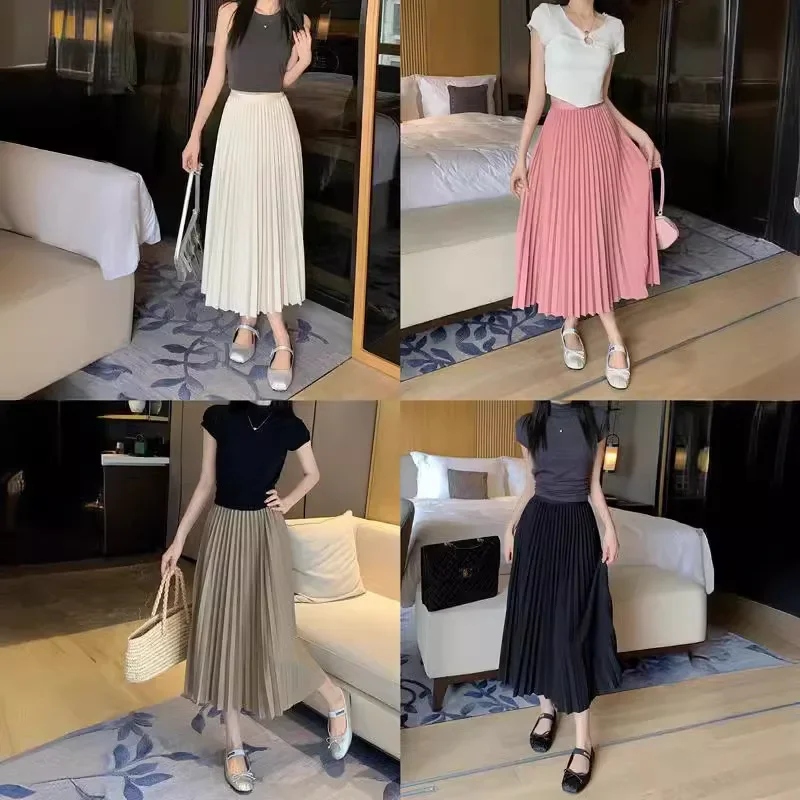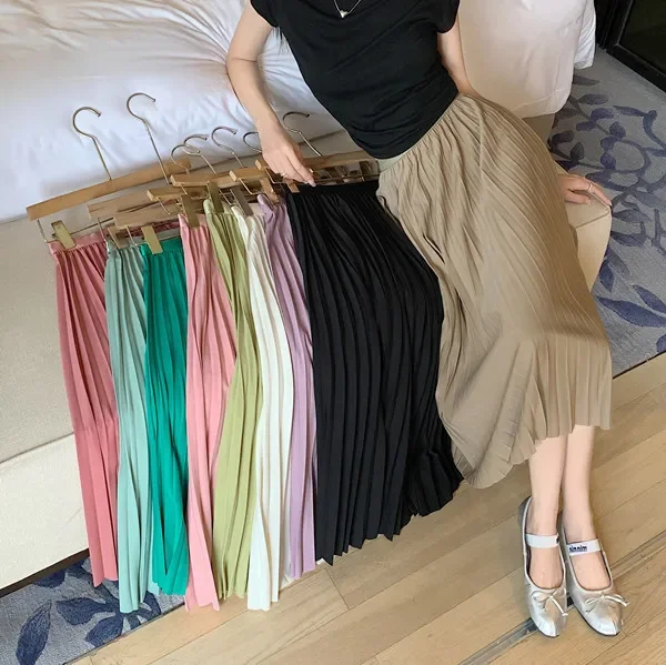 Gonna a pieghe di media lunghezza drappeggiata in tinta unita dimagrante a vita alta per le donne Gonna di media lunghezza multicolore di nuovo stile 1Gonna a pieghe di media lunghezza drappeggiata in tinta unita dimagrante a vita alta per le donne Gonna di media lunghezza multicolore di nuovo stile