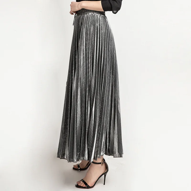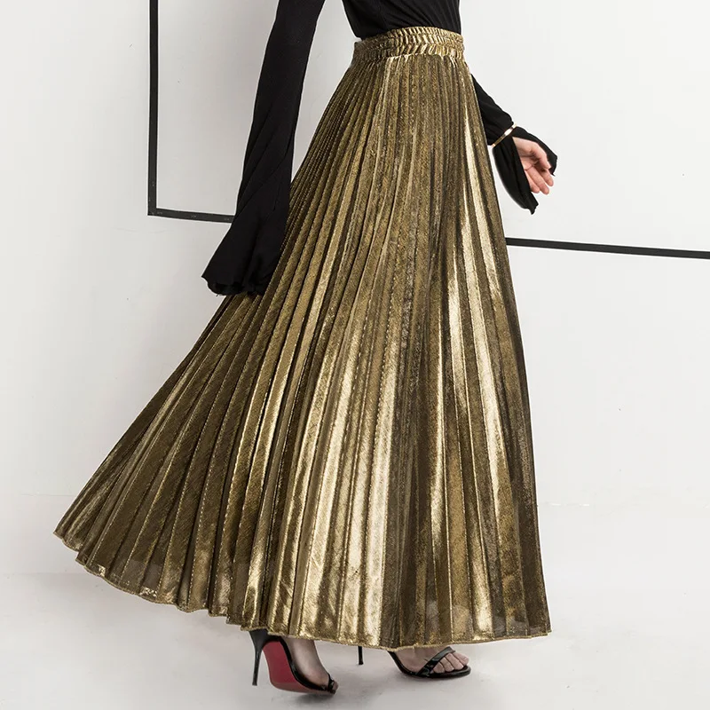 Spring Metallic Pleated Maxi Skirt High Waist Harajuku Large Swing Gold Long Skirts For Women Plus Size XXL Saia