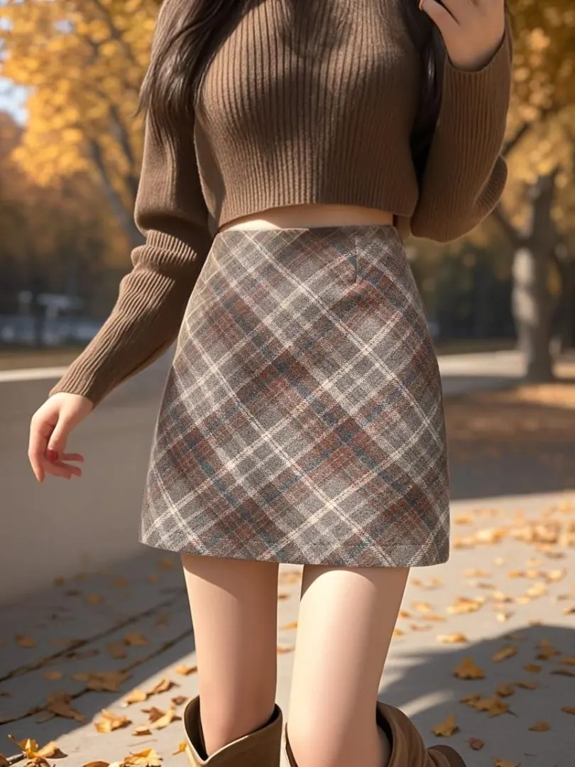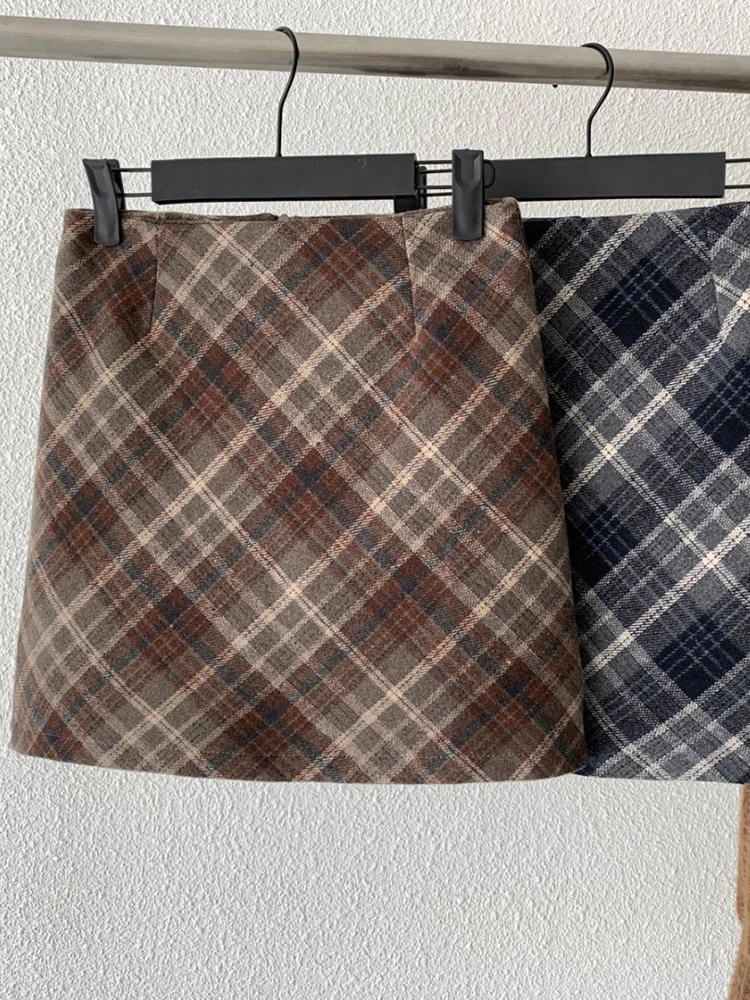 Gonna a trapezio corta vintage scozzese stile coreano per donna Autunno Inverno Streetwear Gonne a tubino di lana sottili Donna