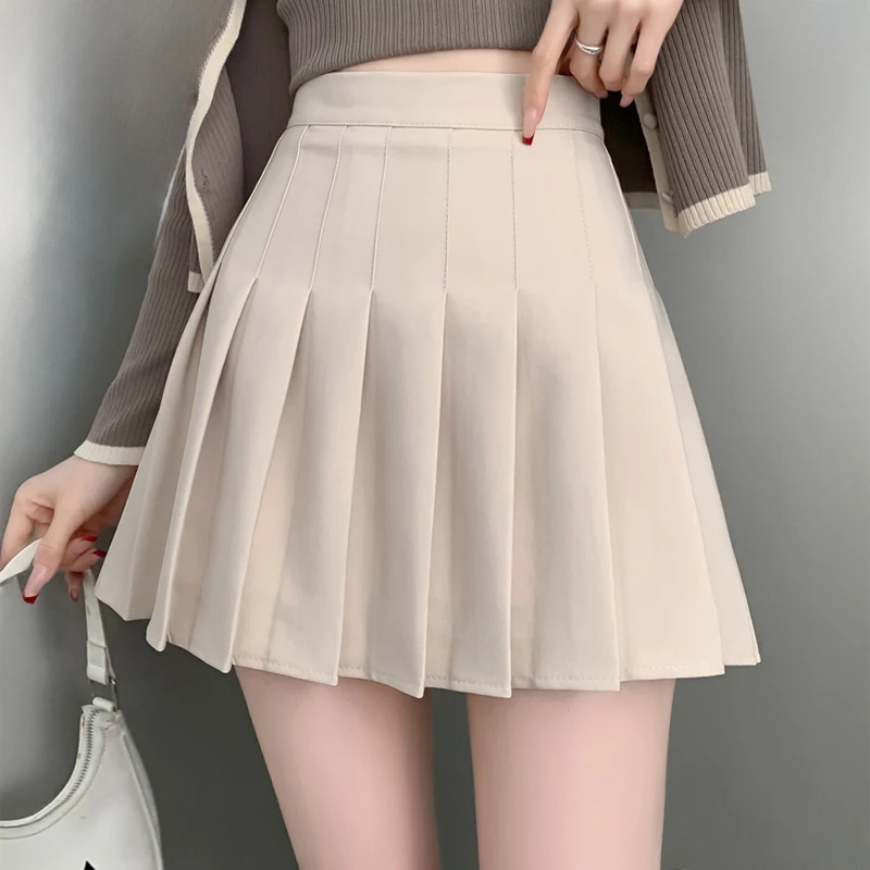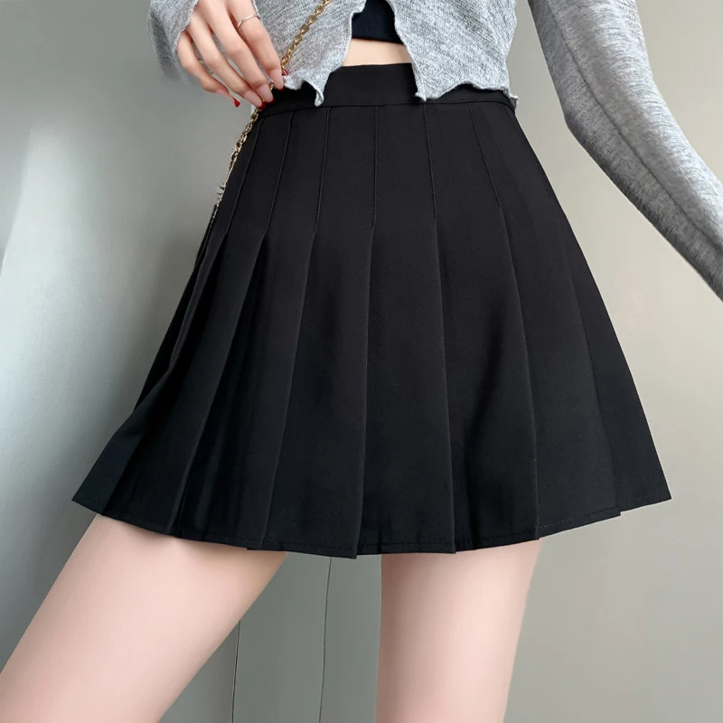 La minigonna con pieghe a scatola è dotata di pantaloncini integrati e cerniera invisibile.