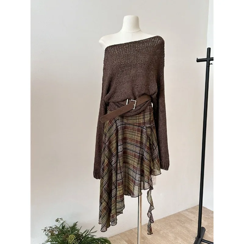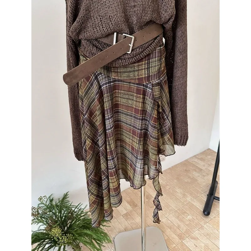 Gonna di media lunghezza dal design autunnale da donna scozzese smussato irregolare con nastro a pieghe retrò casualDisponibilità: 6 disponibili