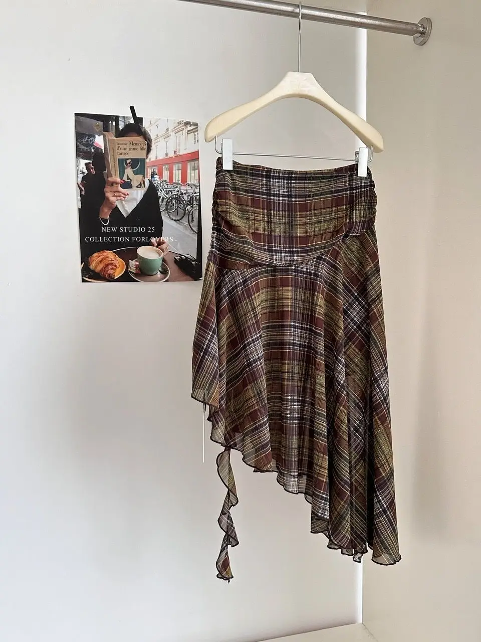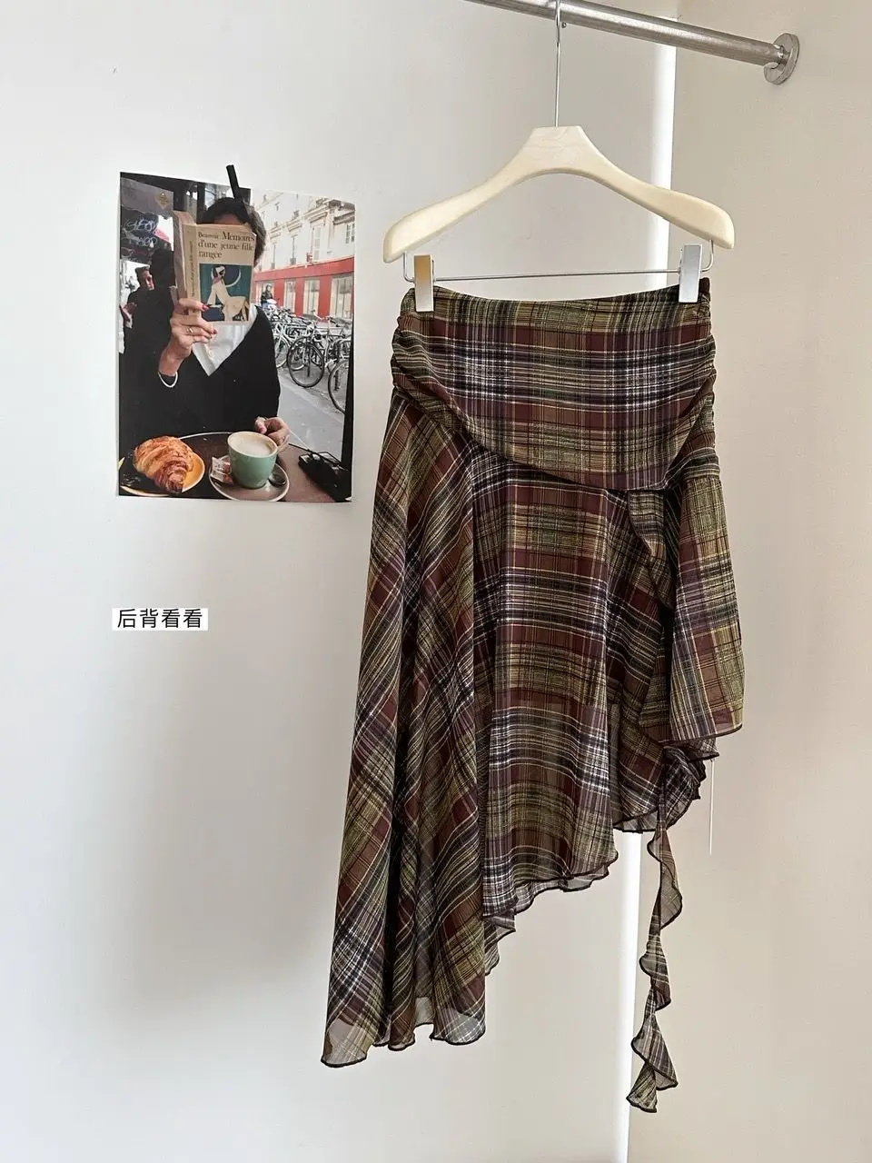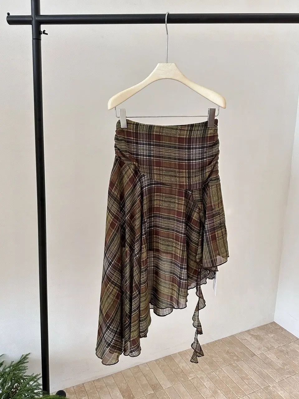 Gonna di media lunghezza dal design autunnale da donna scozzese smussato irregolare con nastro a pieghe retrò casualDisponibilità: 6 disponibili