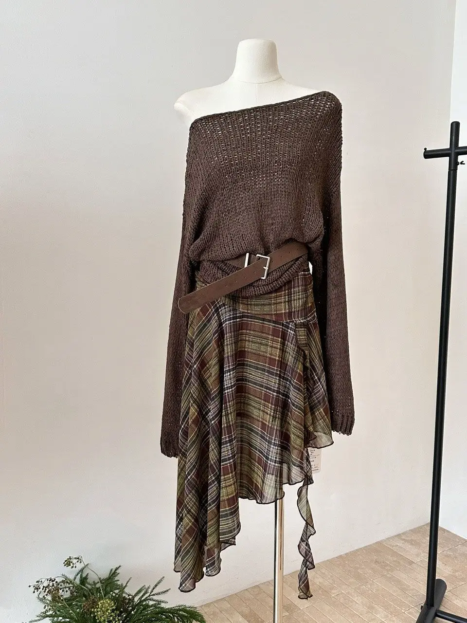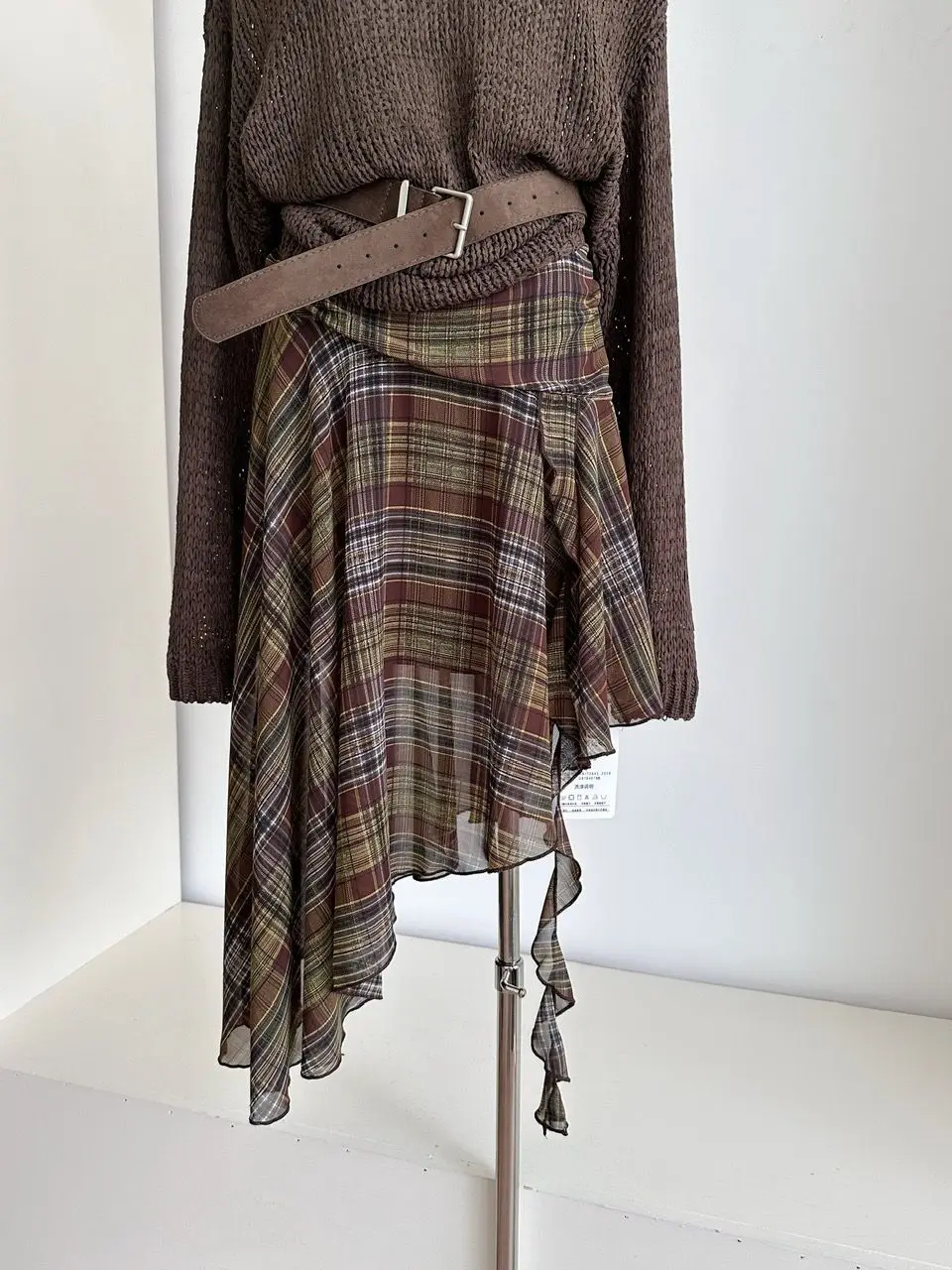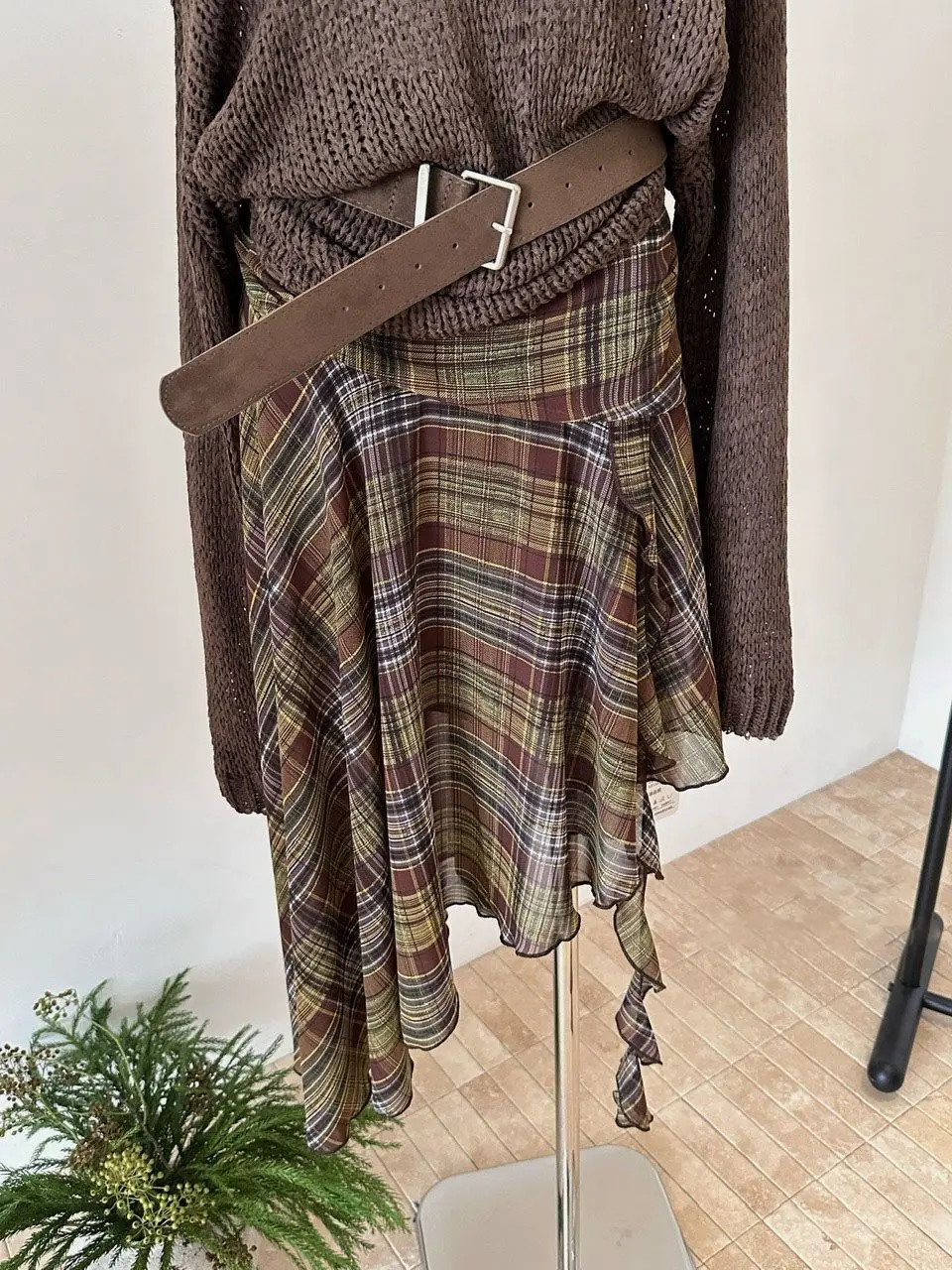 Gonna di media lunghezza dal design autunnale da donna scozzese smussato irregolare con nastro a pieghe retrò casualDisponibilità: 6 disponibili